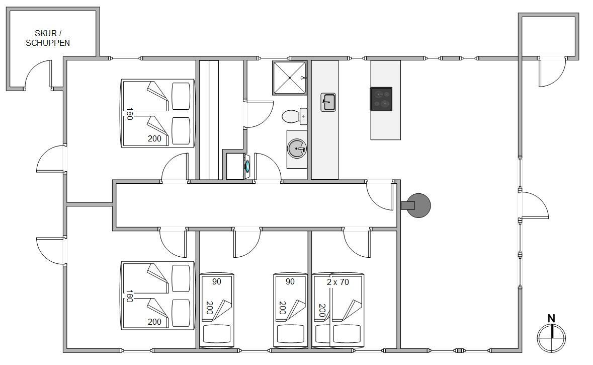 Sommerhuset har 4 soveværelser – 2 med dobbeltsenge, ét med 2 enkeltsenge og ét med en køjeseng – så der er plads til både store og små.
