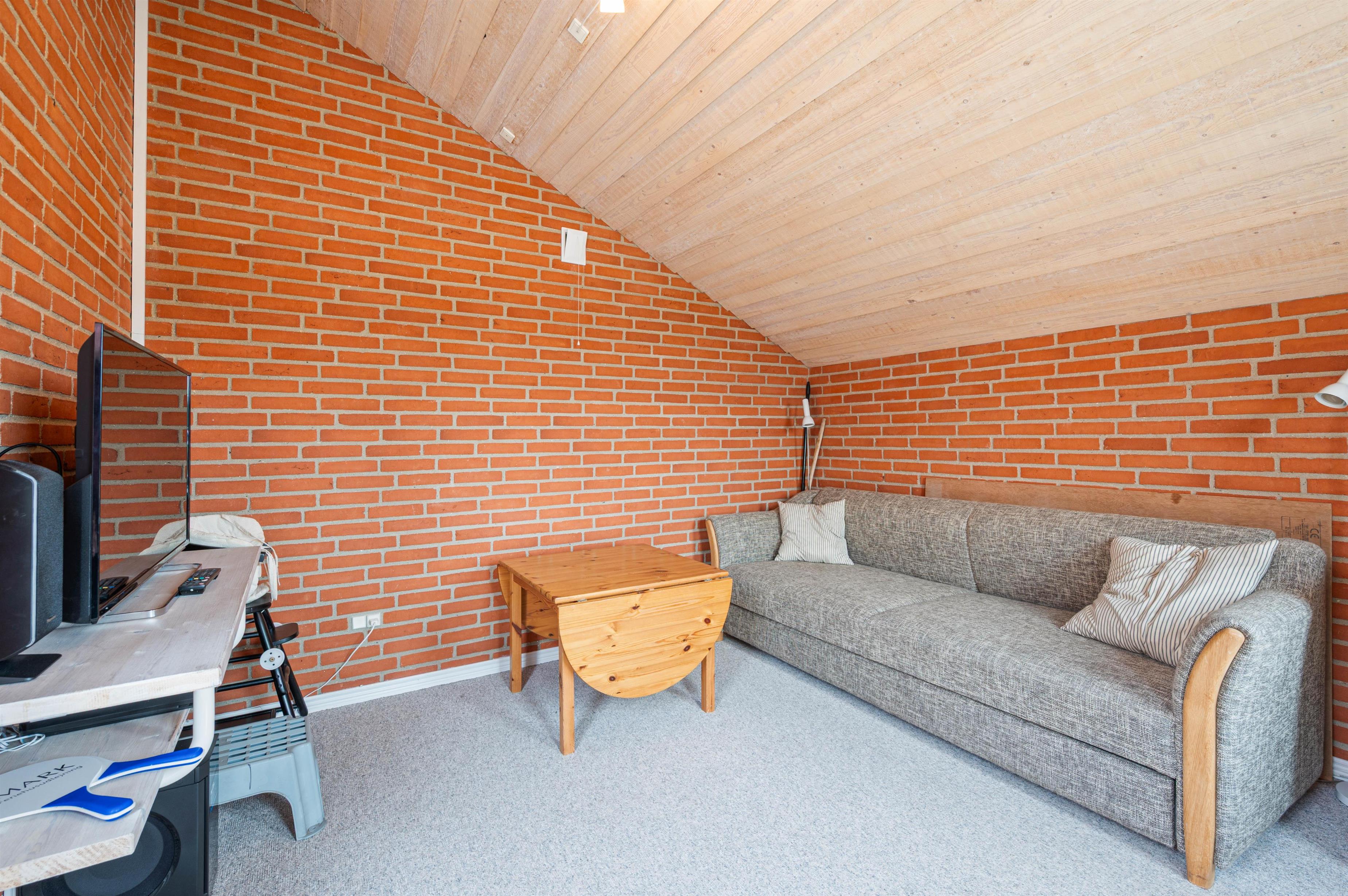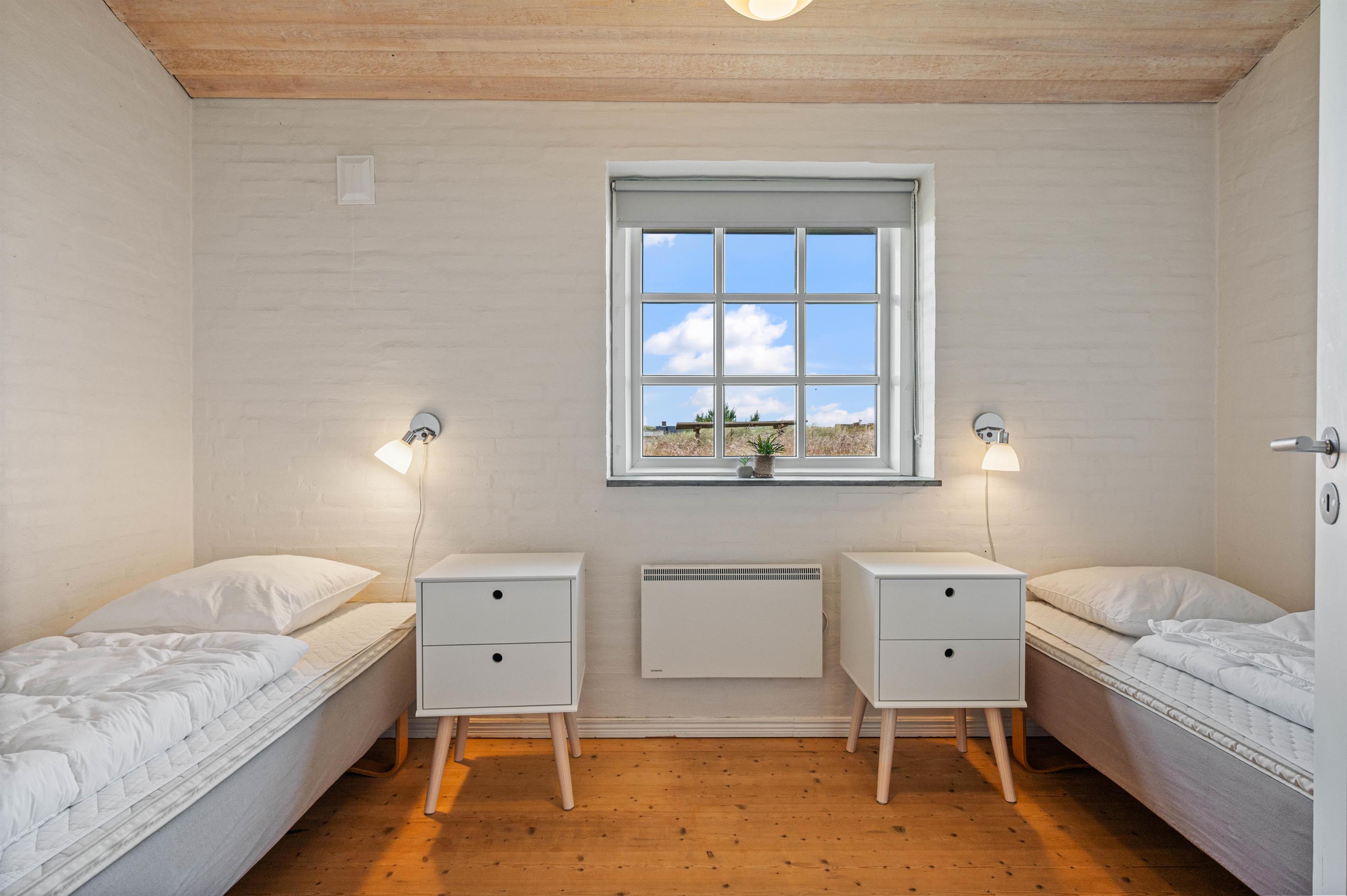 Sommerhuset har 3 gode soveværelser, hvoraf det ene er indrettet med en dobbeltseng. De sidste værelser er indrettet med komfortable enkeltsenge, og fra det ene har I adgang til hemsen.