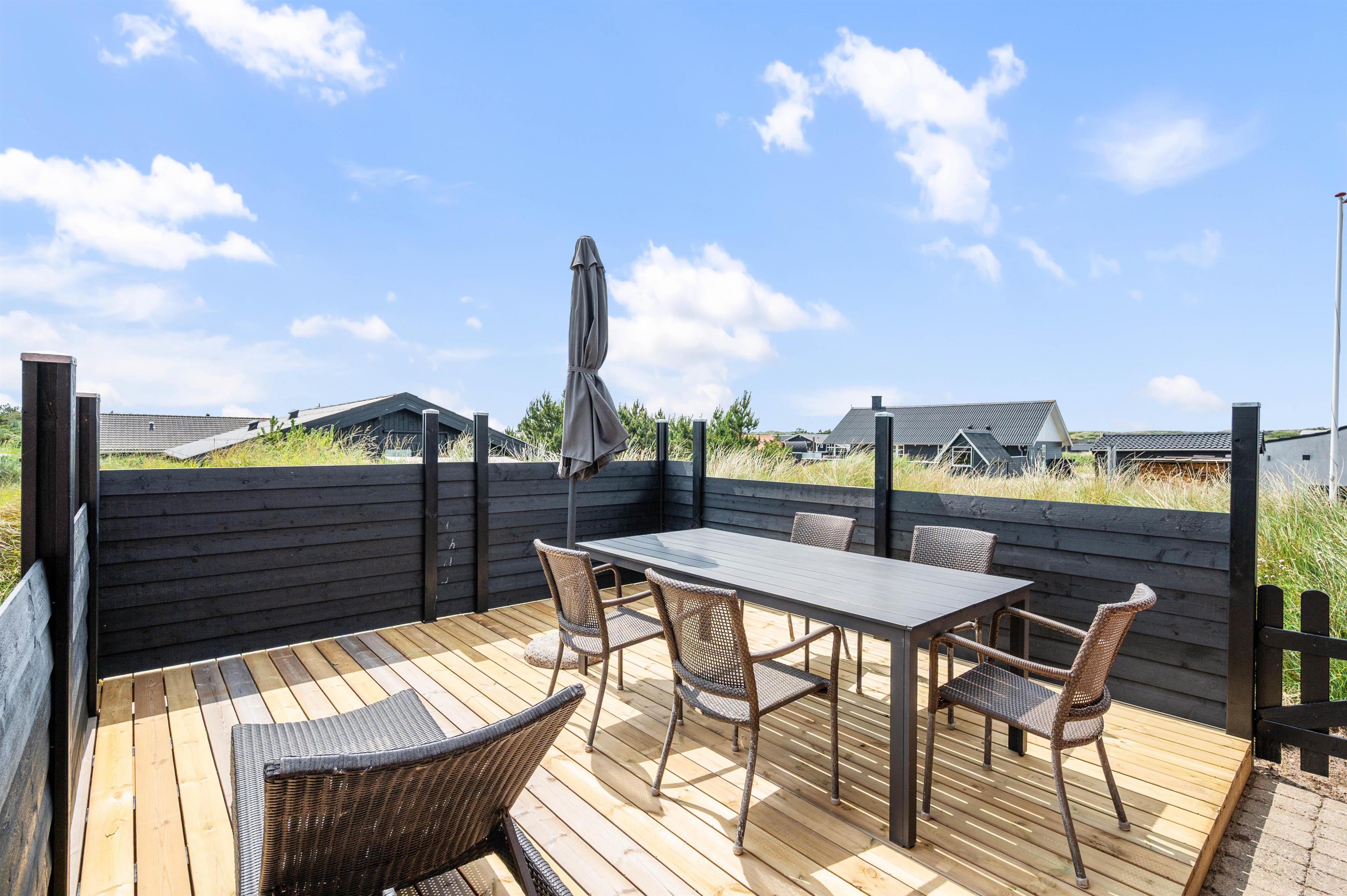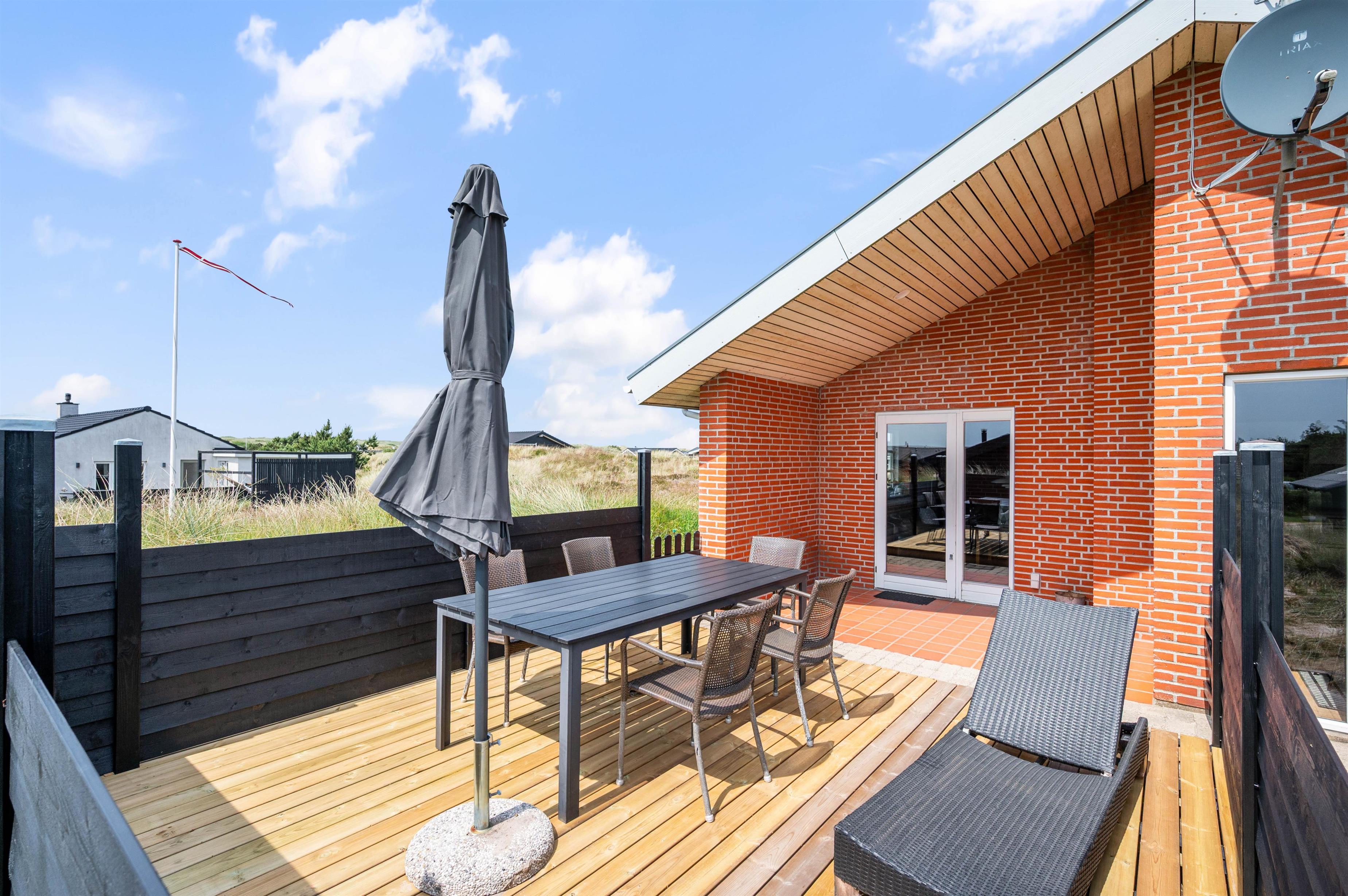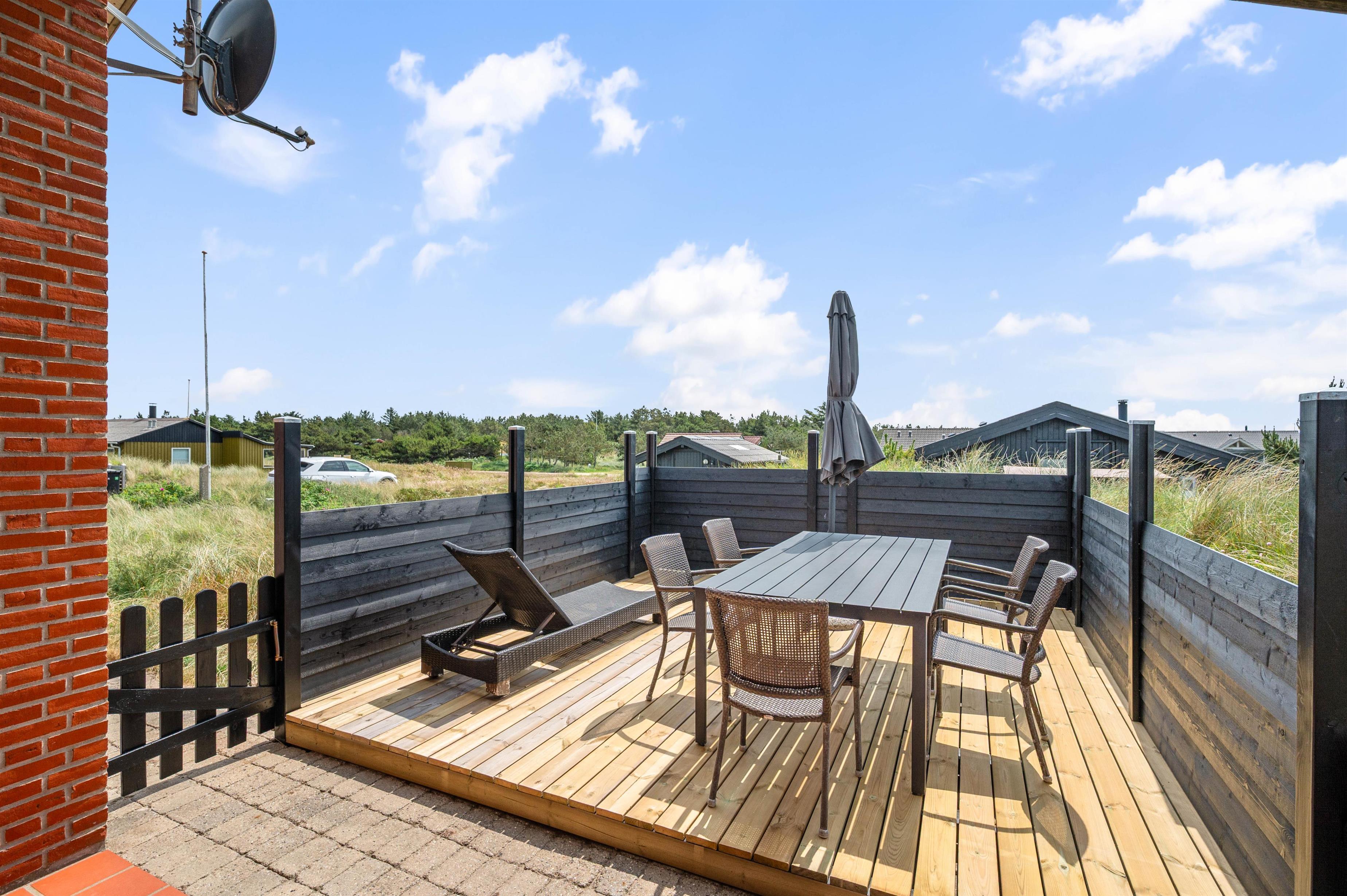 Sommerhuset har 3 gode terrasser, hvoraf den ene er lukket. Fra stuen har I direkte adgang til den sydøst-vendte terrasse, hvor den første kop kaffe kan drikkes til solopgangen og middagssolen kan nydes med en god bog på en liggestol. Herfra er der også adgang til den nordøstlige terrasse.