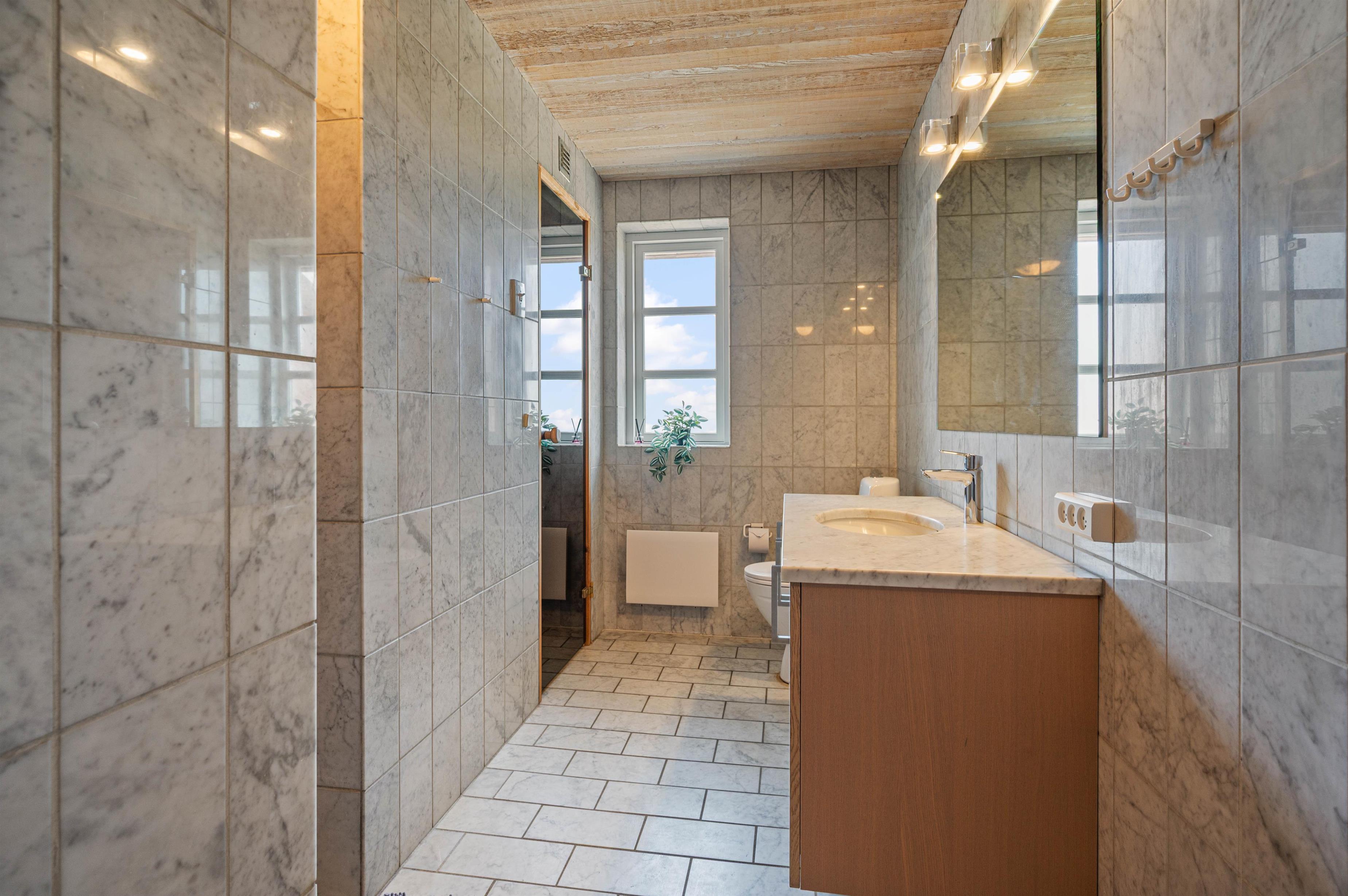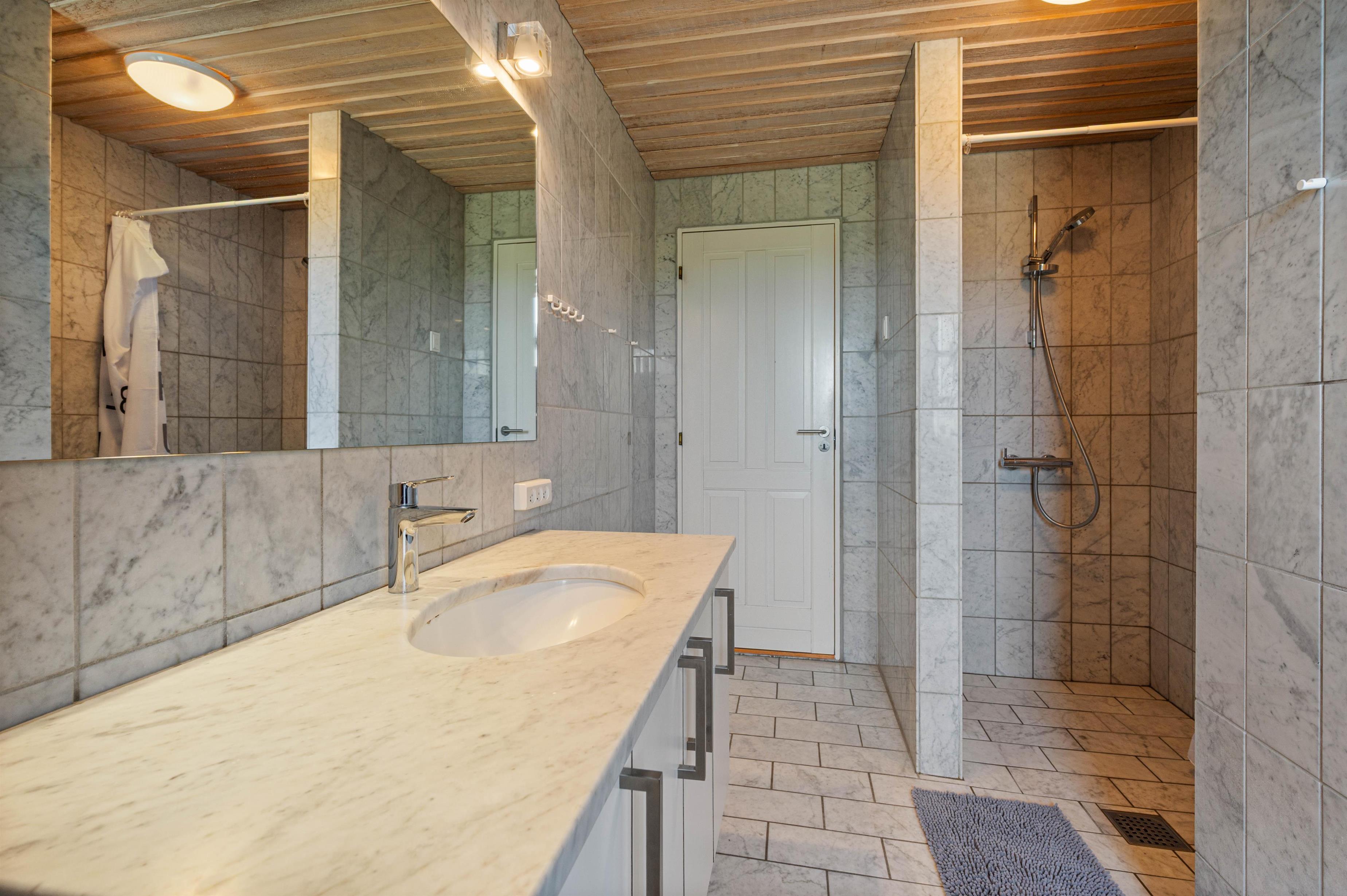 Det store badeværelse med marmorfliser har gulvvarme, så ingen fryser fødderne om morgenen. Herfra har I adgang til sommerhusets sauna, som indbyder til afslapning og velvære efter en god og oplevelsesrig feriedag.