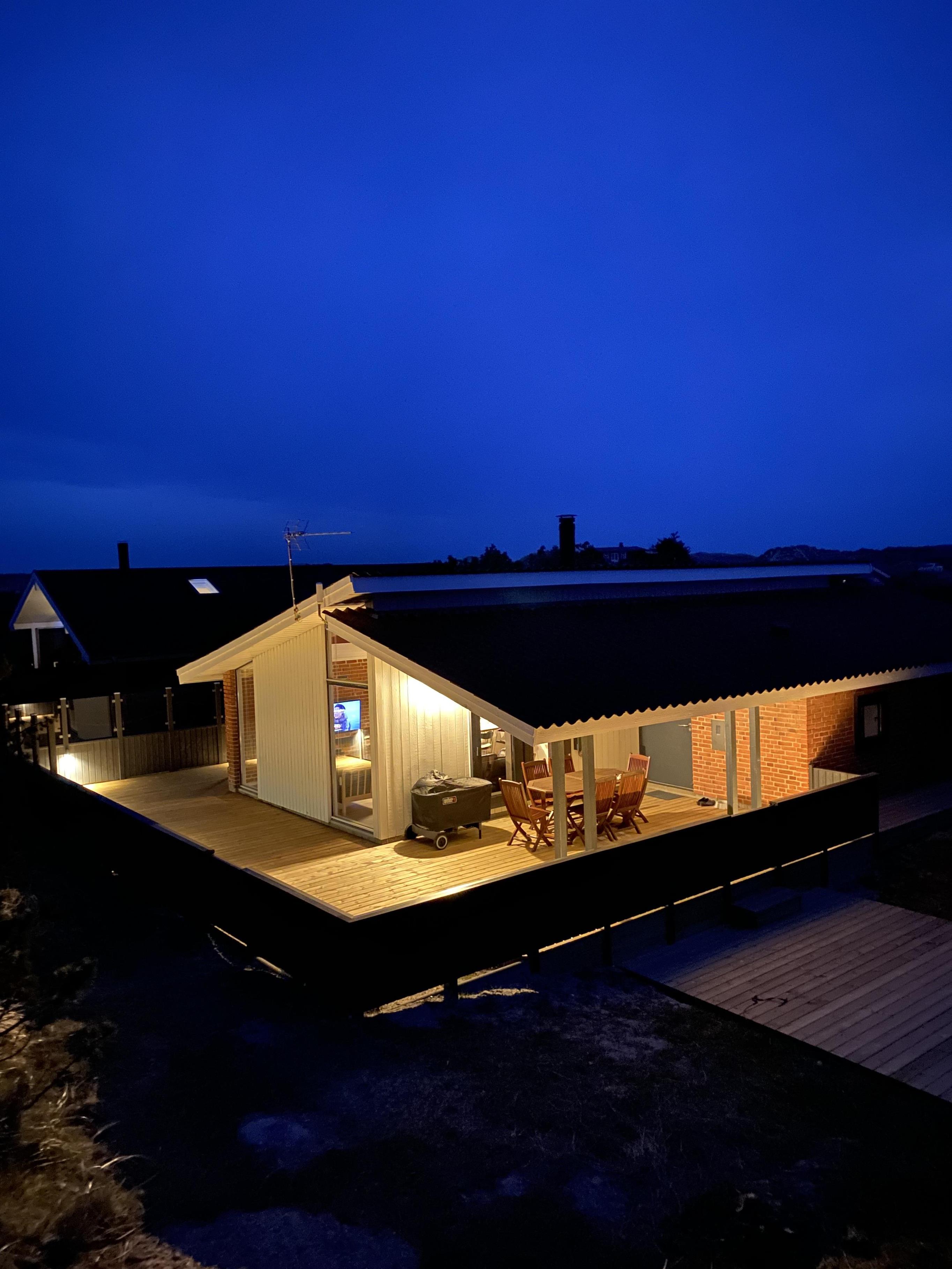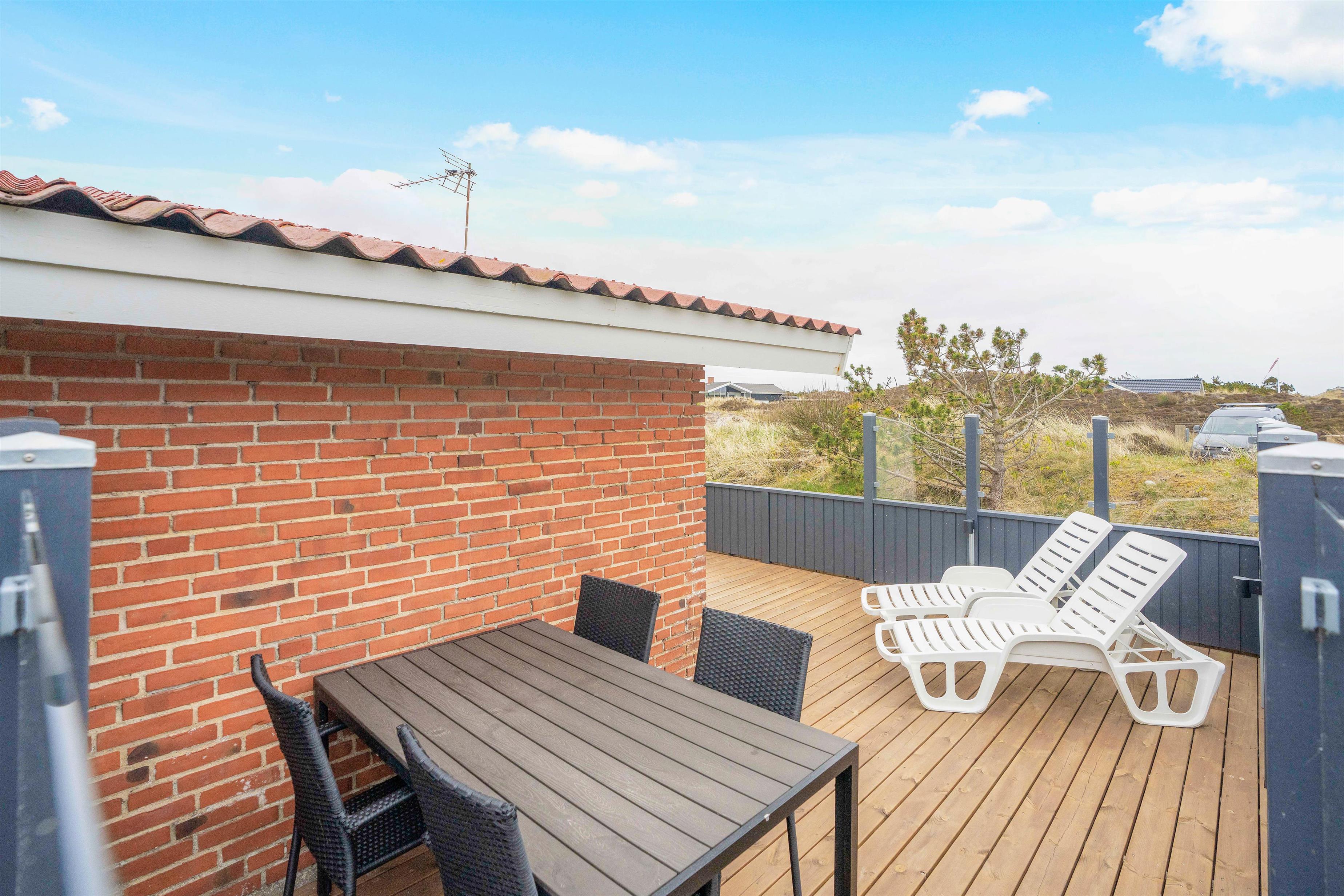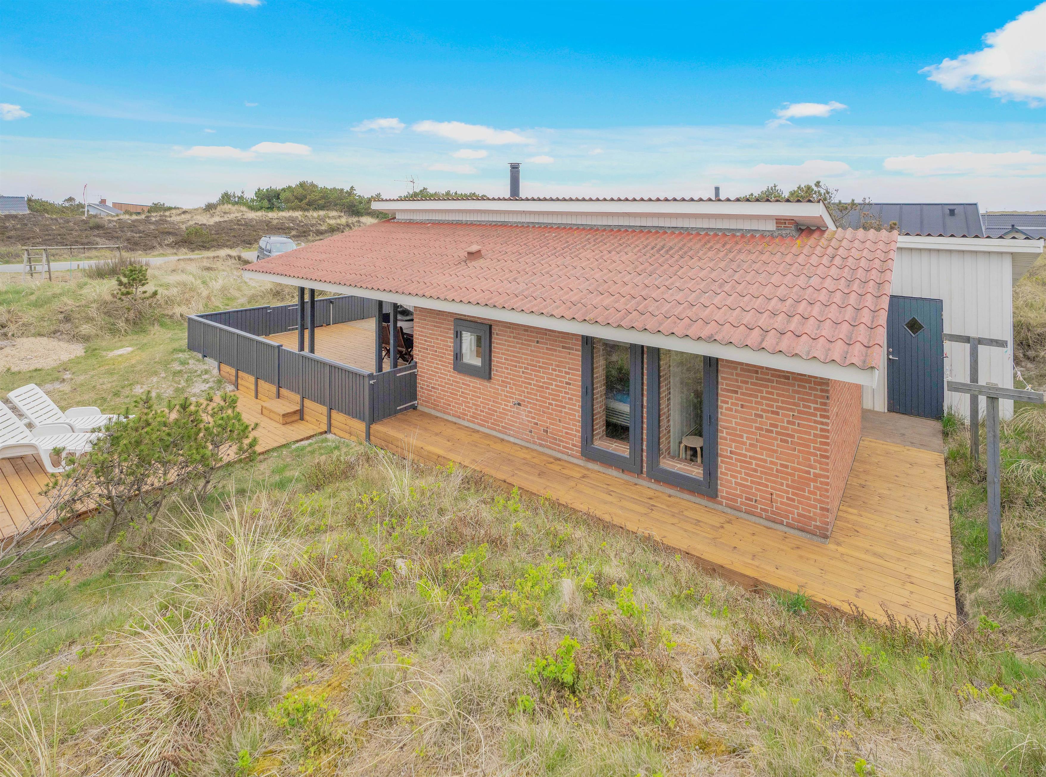 Rundt om huset på Bjerregårdsvej 184 er der flere skønne terrasser, så der er altid mulighed for at finde en plet med sol eller skygge. En dejlig overdækket terrasse indbyder til at nyde de lange sommeraftner ude efter duggens fald, ligesom en grillaften forår/efterår også er muligt i læ under halvtaget. Der inviteres til udeliv i al slag vejr, da I her finder både åben, afskærmet og overdækket terrasse. Følelsen af at være midt i klitterne giver en god fornemmelse af den barske og samtidig charmerende natur, der er kendetegnende for Vesterhavet, der ligger i en gåafstand på 600 meter.
