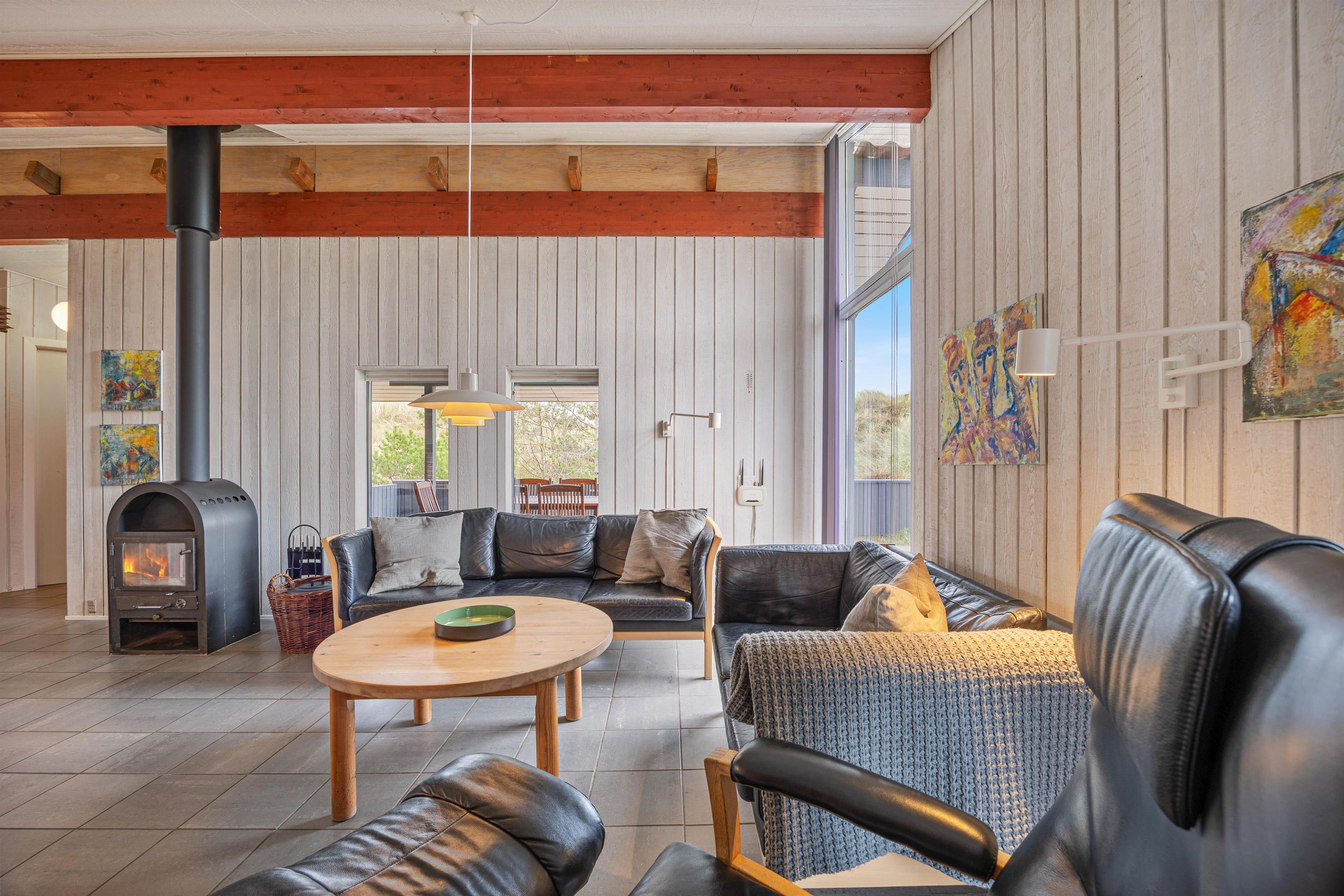 Feriehuset er renoveret i 2020 og stilen er gennemført. Klinkegulvet og de rå murstensvægge, der går igen i alle rum, står flot til de hvide trævægge og lofter. I køkken/alrummet og stuen er møblerne i spiseafdeling og i sofahjørnet flot afstemt til hinanden, og hele rummet inviterer klart til varmt og hyggeligt samvær for hele familien; maden tilberedes i det åbne køkken, avisen læses i lædersofaen og børnene spiller spil ved spisebordet – alt sammen i skæret fra brændeovnen, der sender varme ud fra midten af stuen. Året rundt kan varmepumpen tages i brug for at holde en behagelig temperatur i huset.