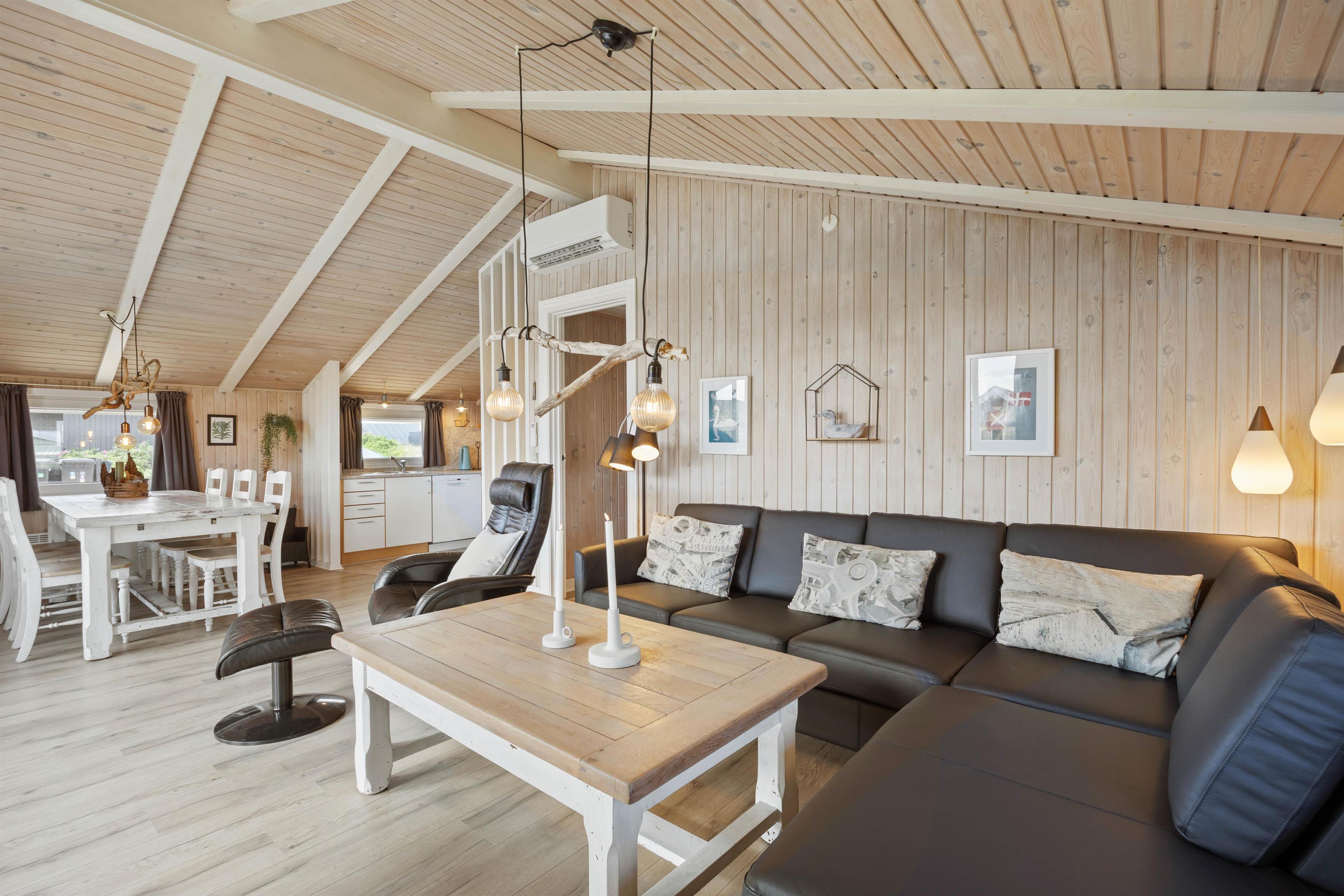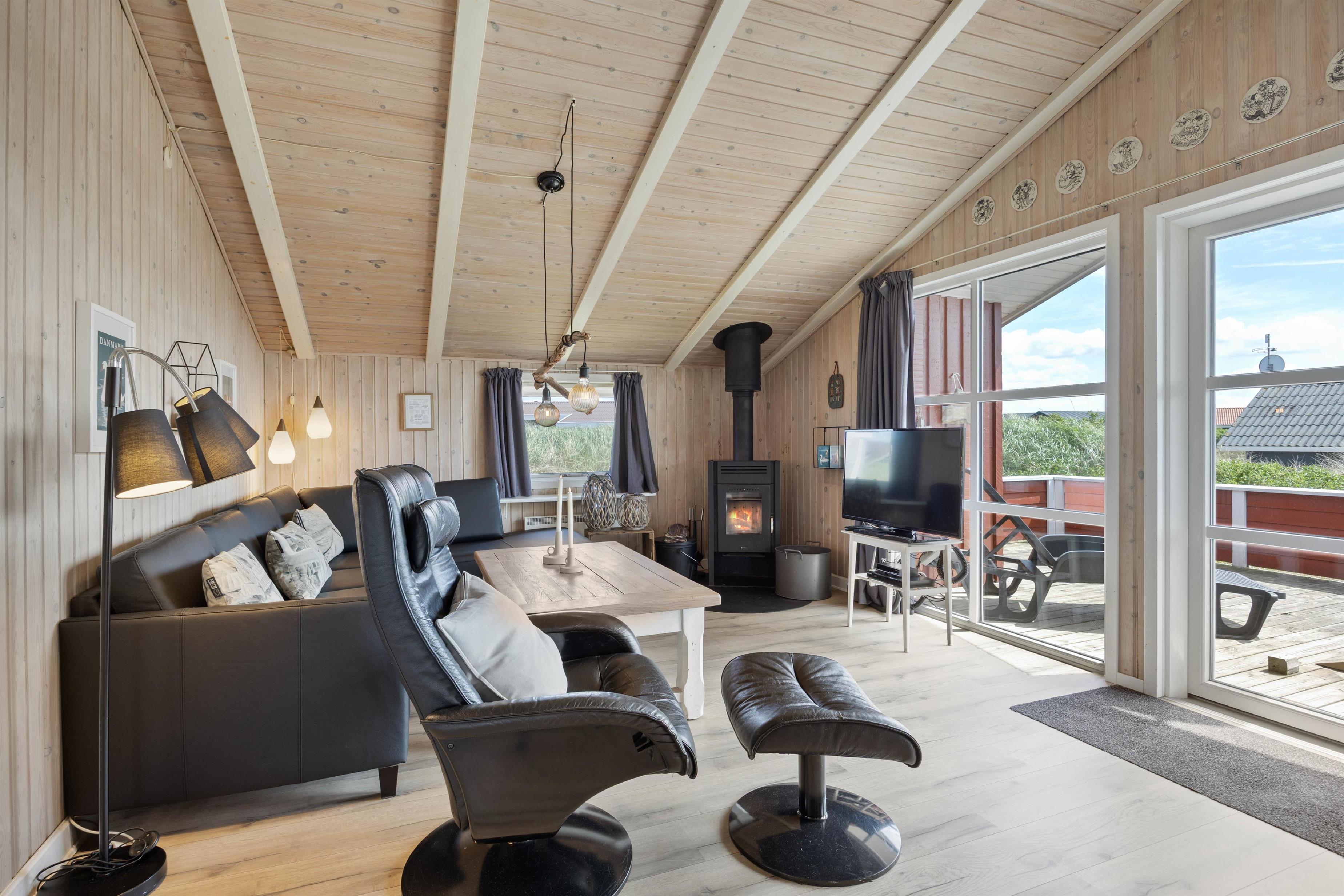 Sommerhuset byder på en indbydende og velholdt indretning, hvor både køkken og badeværelse fremstår moderne og opdateret efter en renovering i 2025. Køkkenet ligger i åben forbindelse med stuen, hvor de lyse træbeklædte vægge og loftet, som går helt til kip, skaber en særdeles imødekommende og rummelig atmosfære. Den hyggelige og personligt indrettede opholdsstue er møbleret med komfortable lædermøbler og brændeovn, og den energibesparende varmepumpe kan nemt tages i brug efter behov. Feriehuset tilbyder desuden gratis trådløst internet.