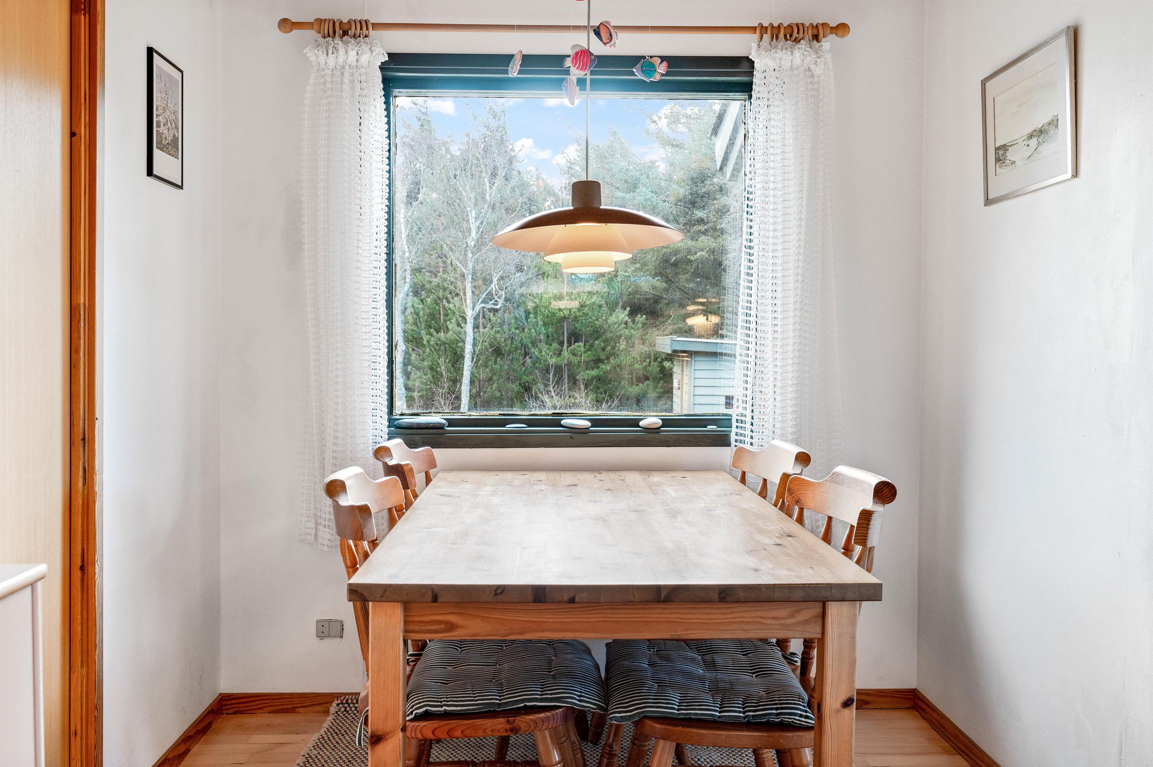 Det første, der møder jer, når I træder ind i feriehuset, er en praktisk entré til opbevaring af overtøj og fodtøj. Herfra er der indgang til det lille køkken med blandt andet opvaskemaskine og god skabsplads. Ud for køkkenet er spisebordet placeret. Herfra kan kokken underholdes, eller I kan nyde et glas vin, mens der holdes øje med maden, der koger færdig på komfuret, og børnene spiller spil.