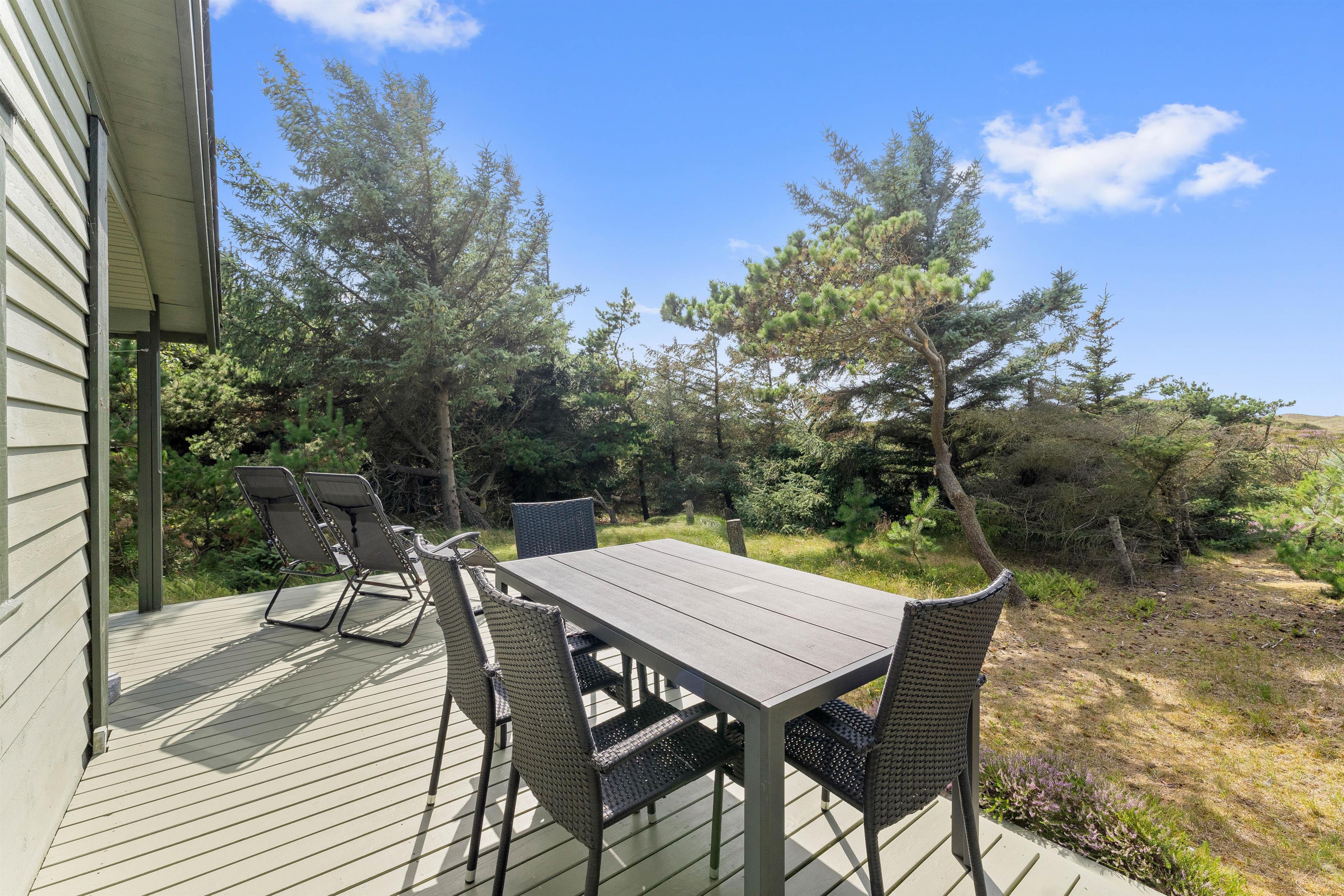 Fra stuen er der udgang til en dejlig sydvestvendt træterrasse, der er delvist overdækket. Herfra kan I fylde sanserne med den malerisk smukke natur og dyrelivet, der sikkert gerne besøger denne uforstyrrede oase. Der er mulighed for såvel sol som skygge, og de lange sommeraftner kan nydes – også efter duggens fald.