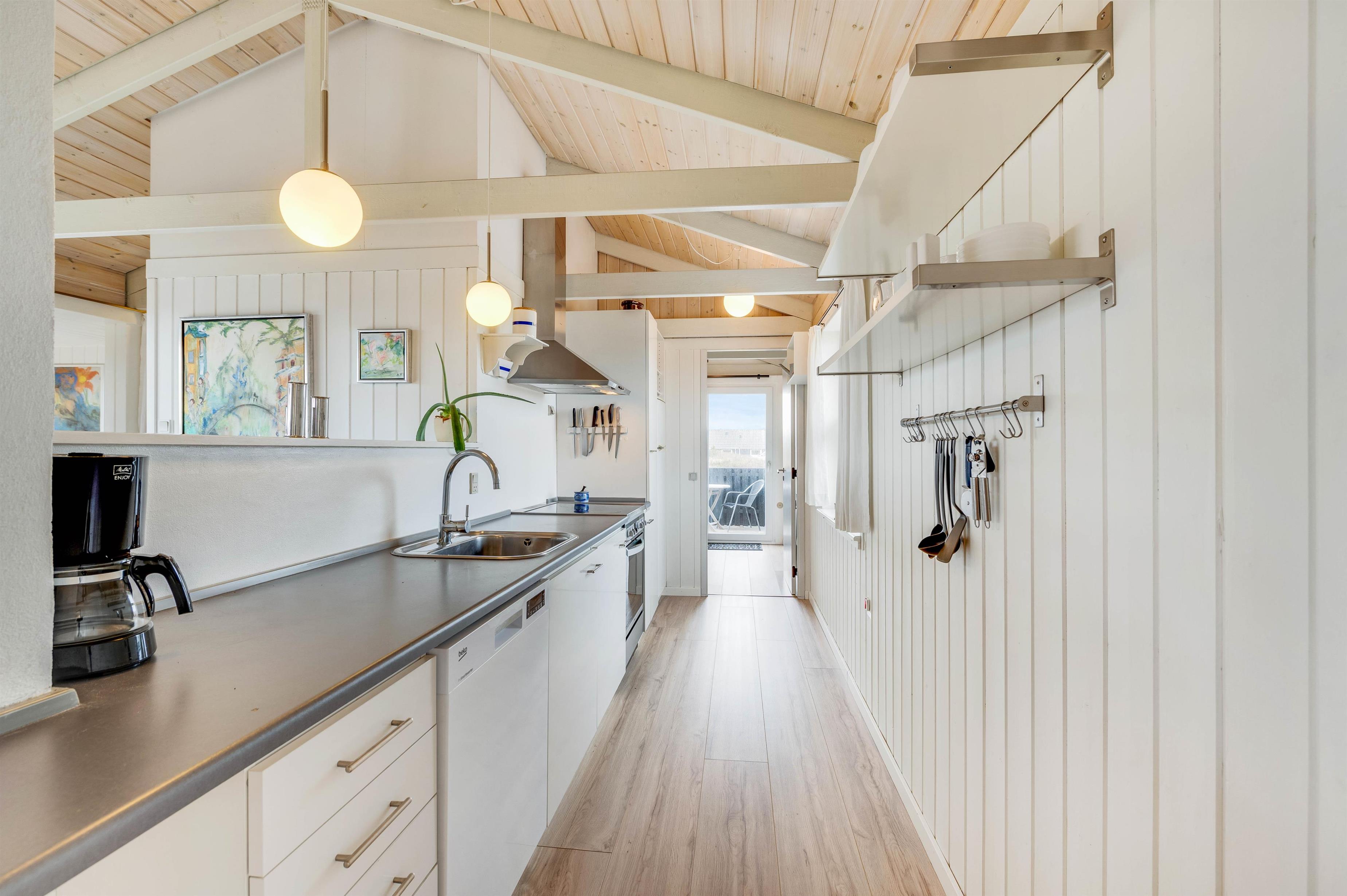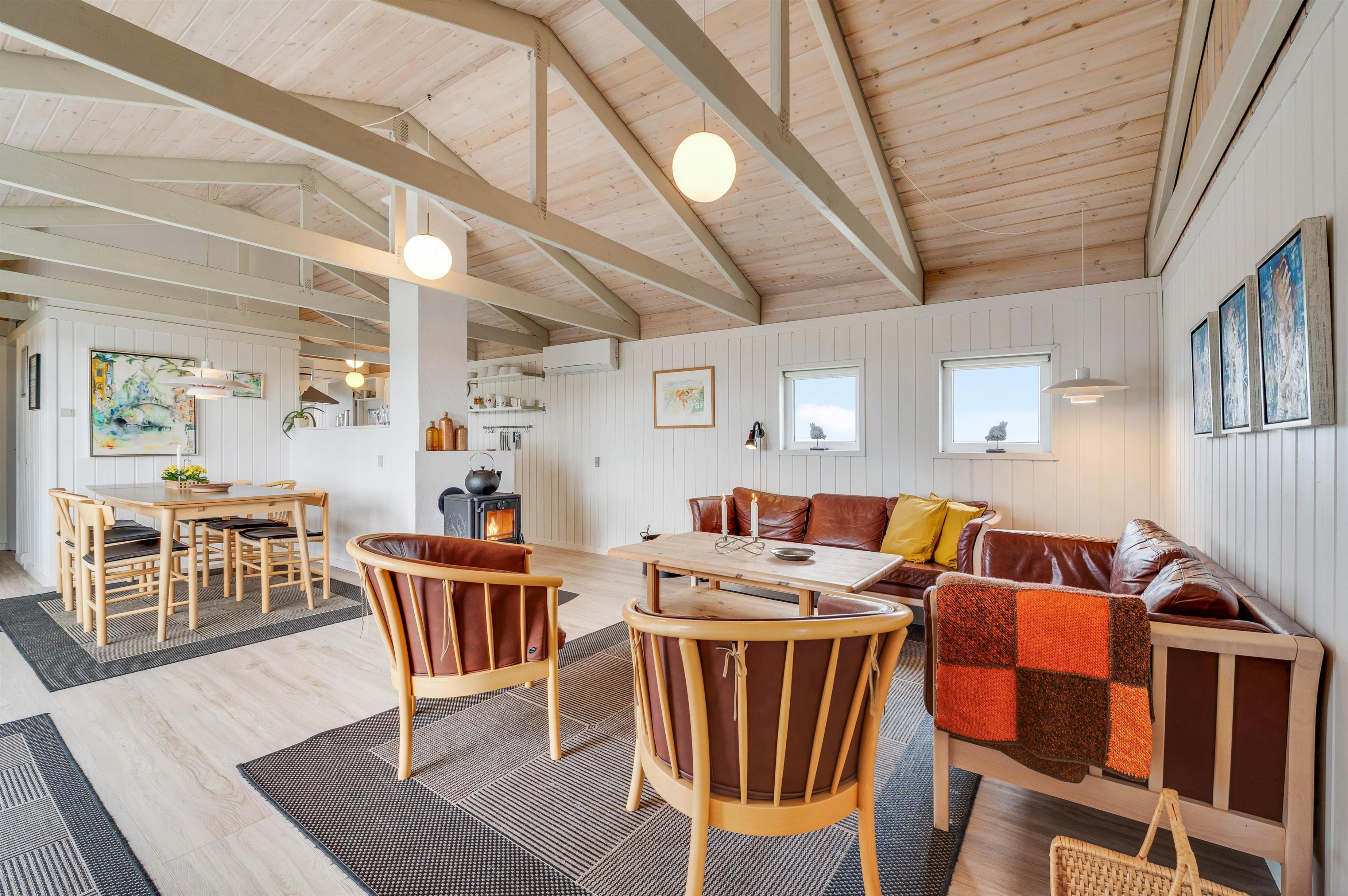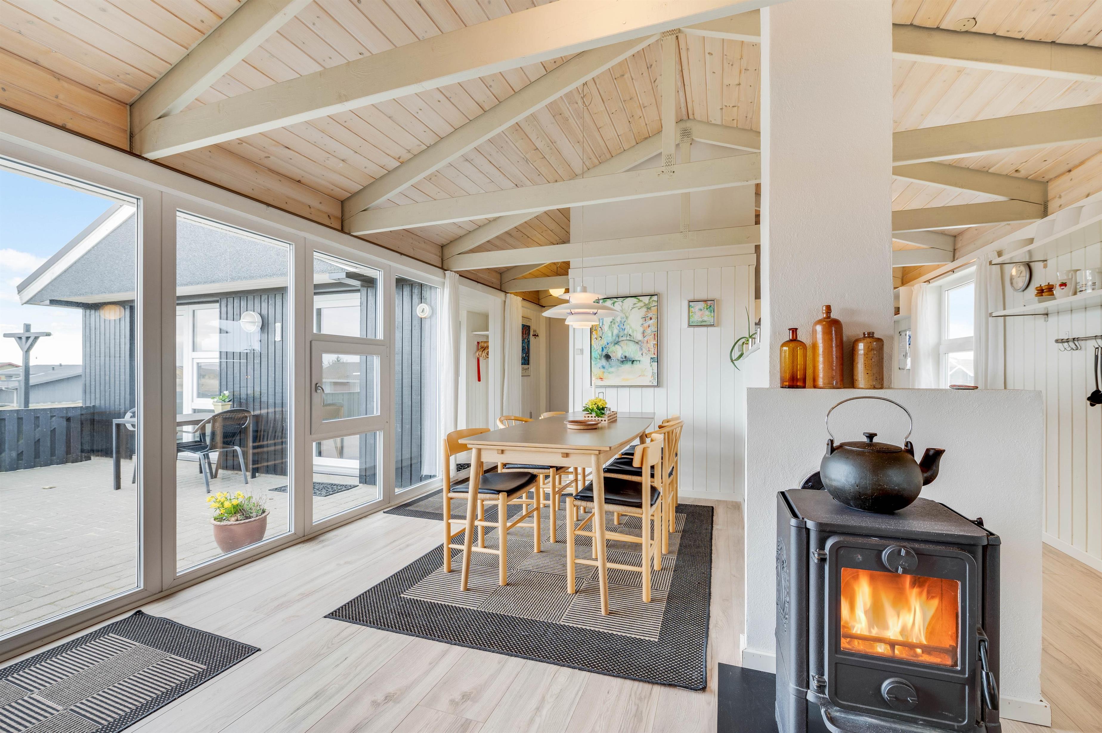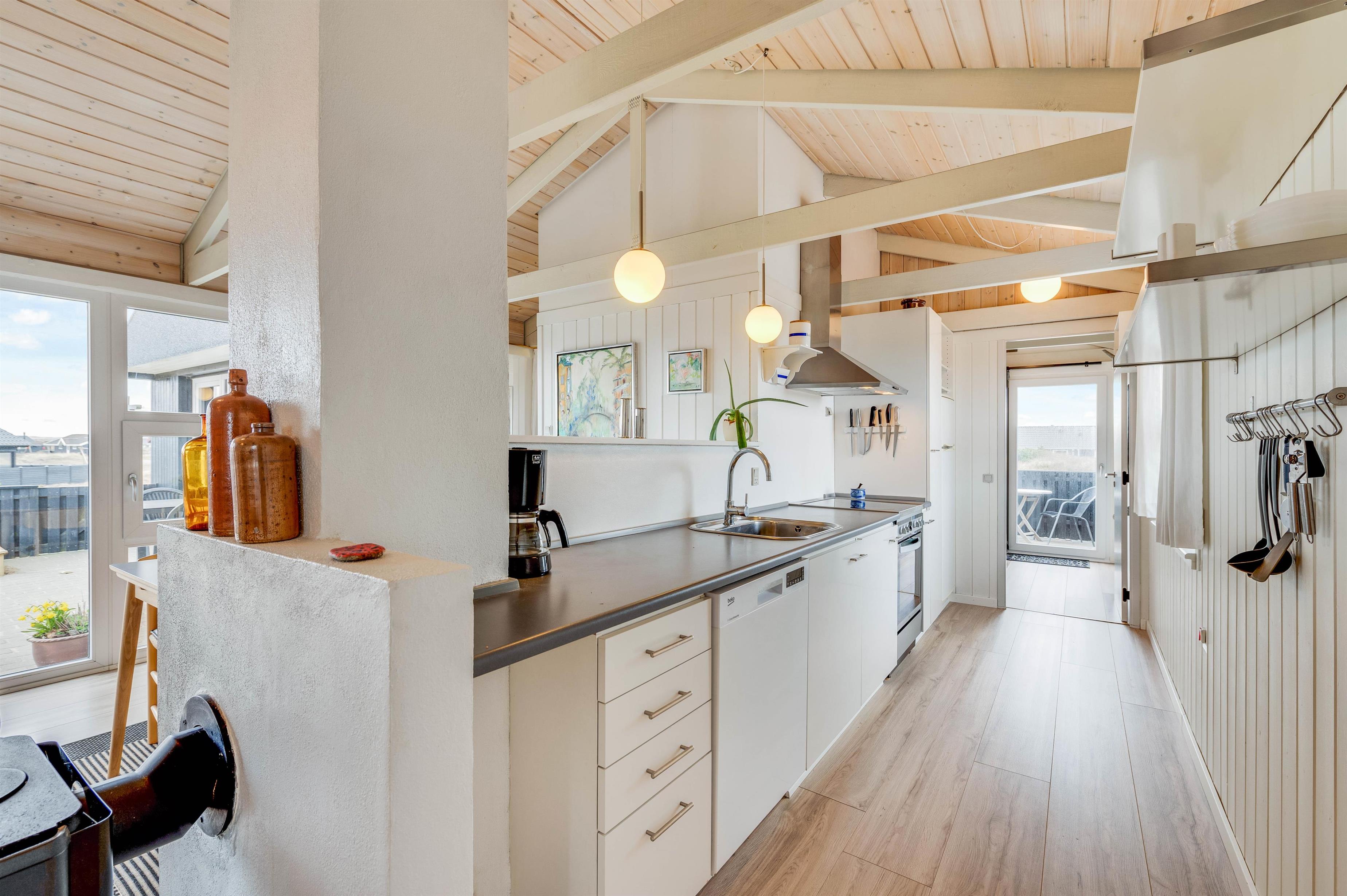 Sommerhusets køkken ligger i åben forbindelse med spiseplads og stuen. I stuen sikrer det hyggelige sofahjørne ved brændeovnen afslapning og hygge for hele familien. Feriehusets entré har rigeligt med plads til overtøj og sko efter hjemkomst fra en skøn gåtur ved stranden.