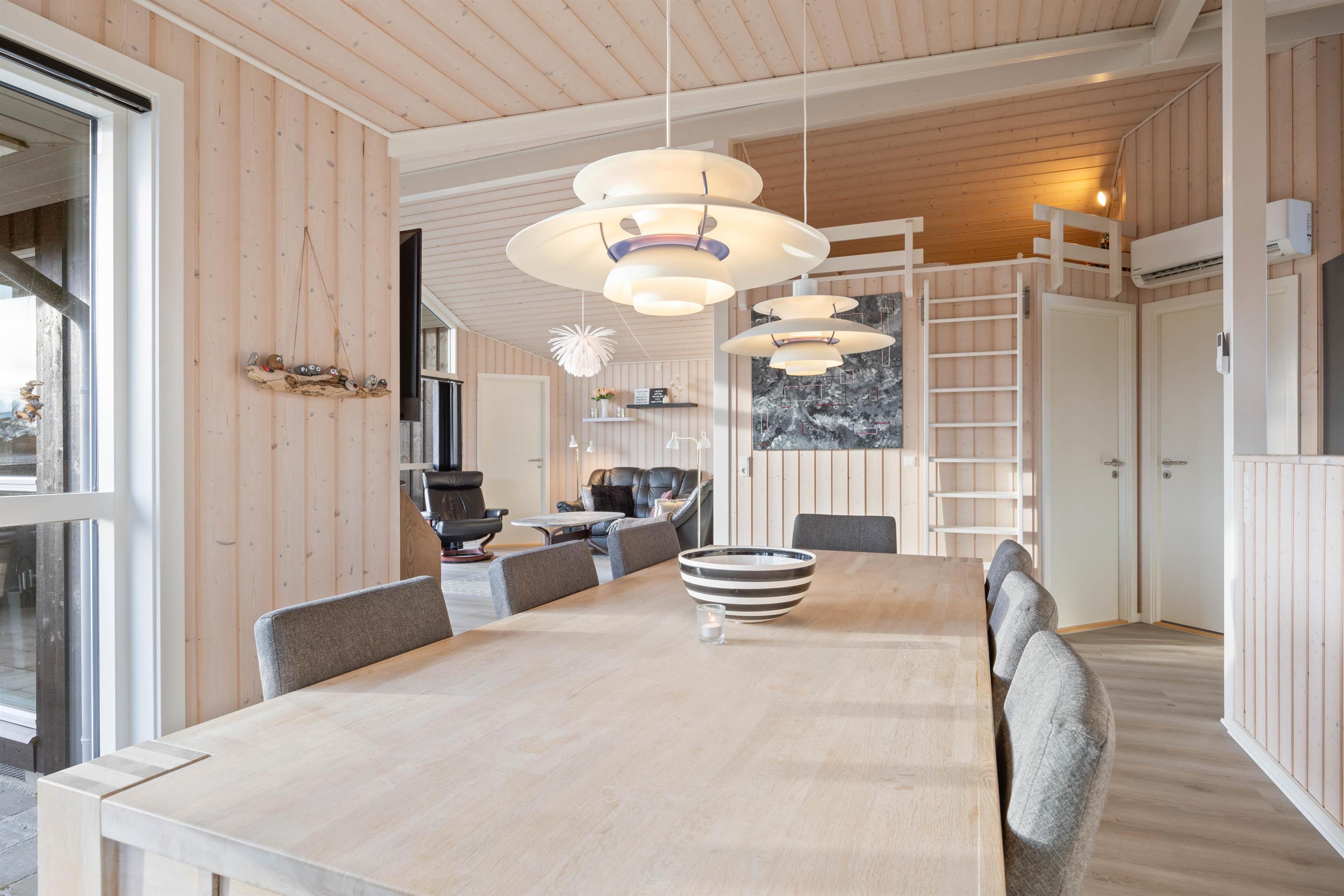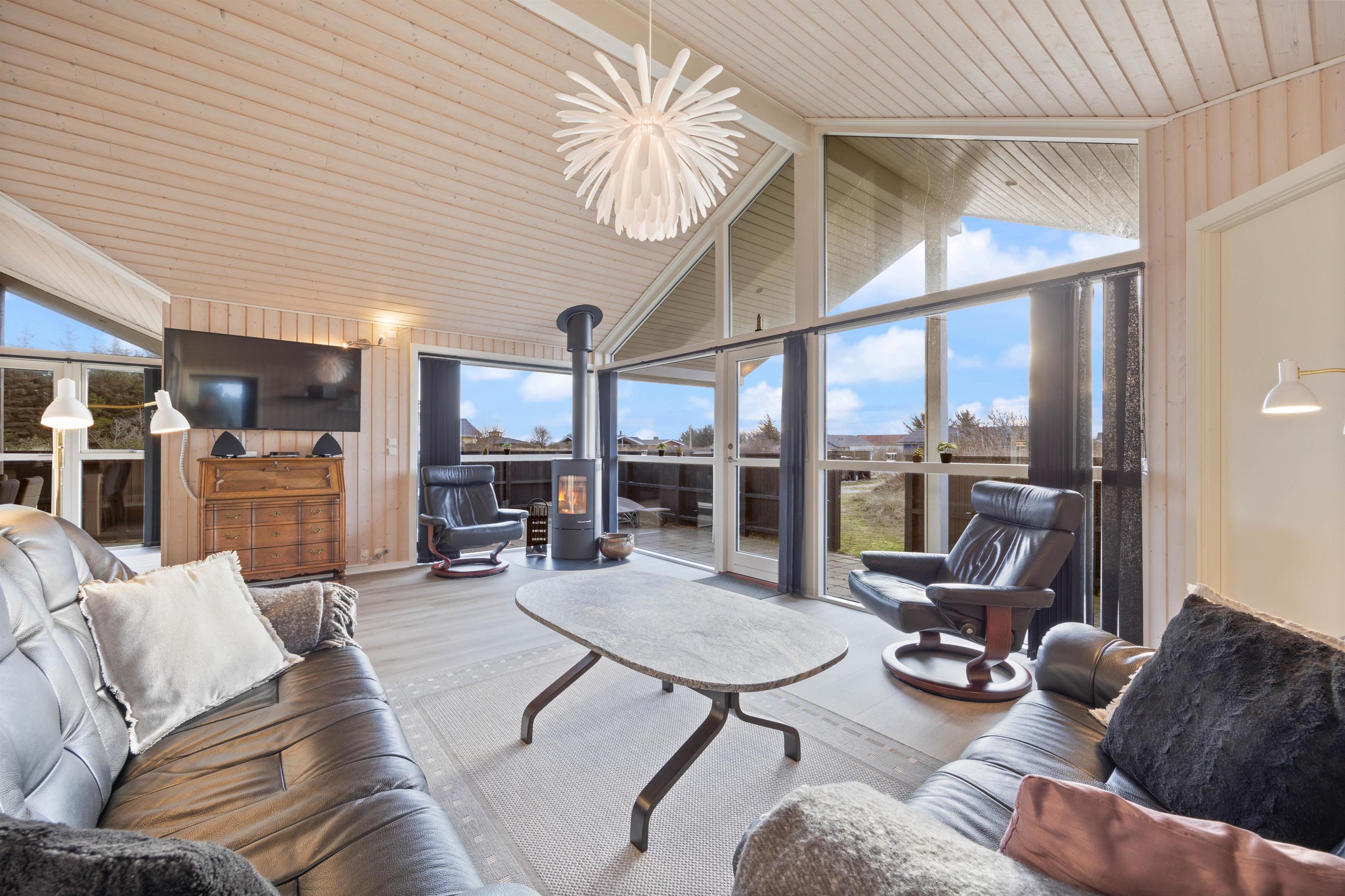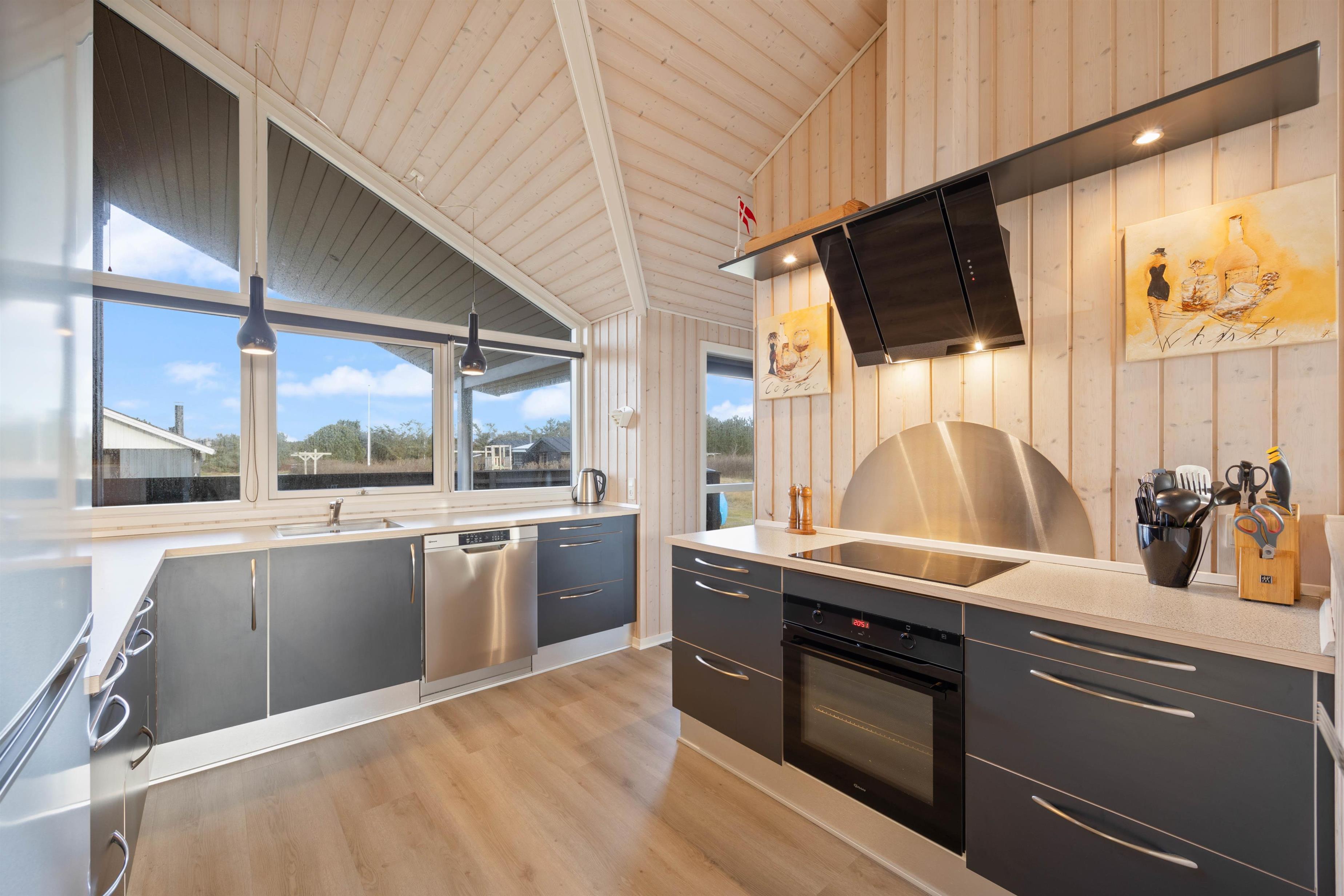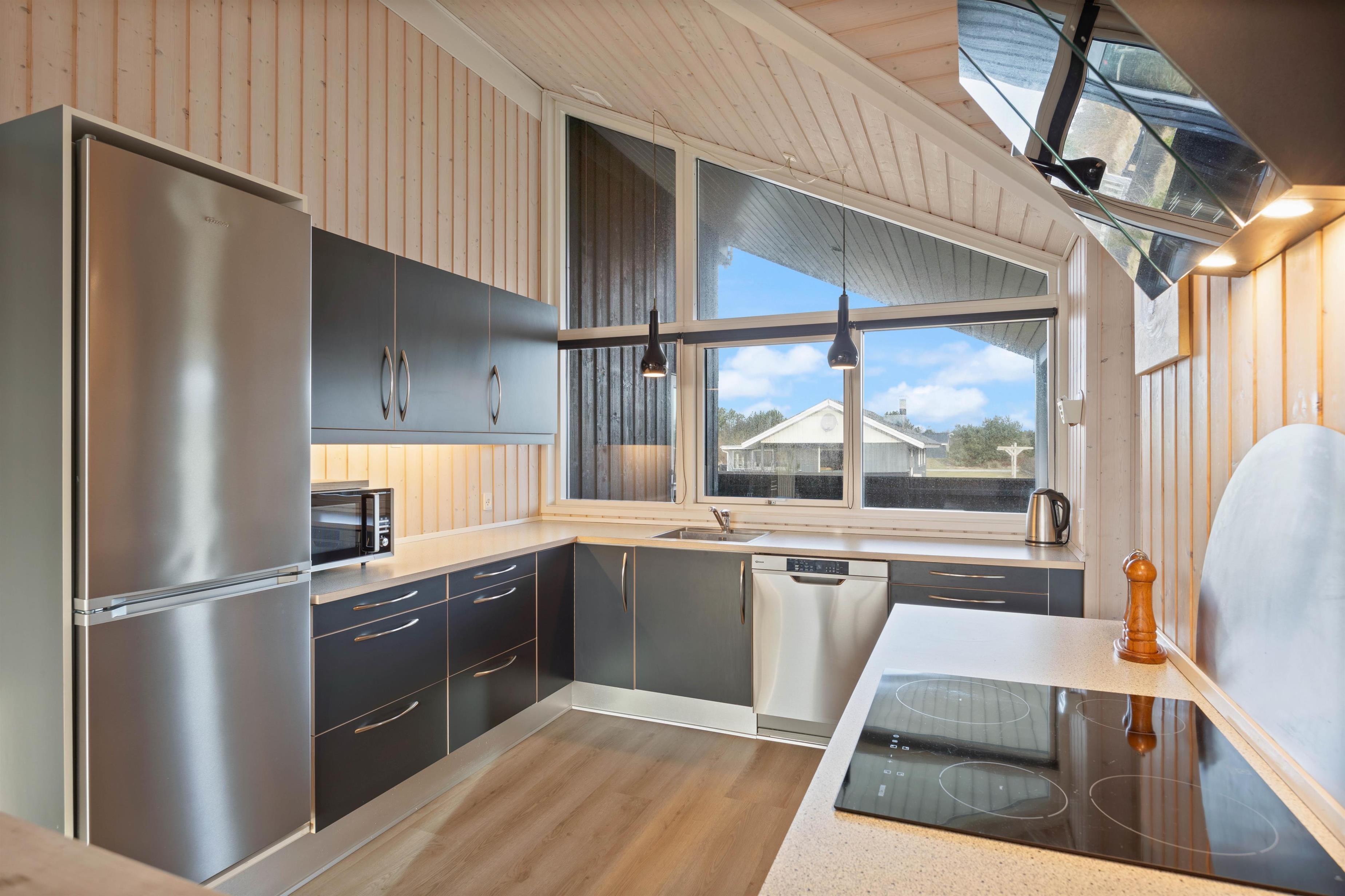 Op til 6 personer kan i dette sommerhus nyde godt at den fine indretning, og lade det danne grundlag for en skøn ferie ved Vesterhavet. I det hyggelige sofahjørne kan du kan sætte dig godt til rette og se en god film, surfe lidt på internettet eller læse en spændende bog, imens ilden knitrer i brændeovnen. Det åbne køkken i forbindelse med spiseplads og opholdsstuen indeholder alt, hvad I behøver for at forkæle hinanden med lækre måltider. Ved spisebordet kan nogle spille om opvasken, imens andre laver mad. I har dog opvaskemaskinen til hjælp. Den separate fryser på 92 l vil især glæde lystfiskere – her skulle være plads nok til en fisk eller to, hvis I har held med fiskestangen.