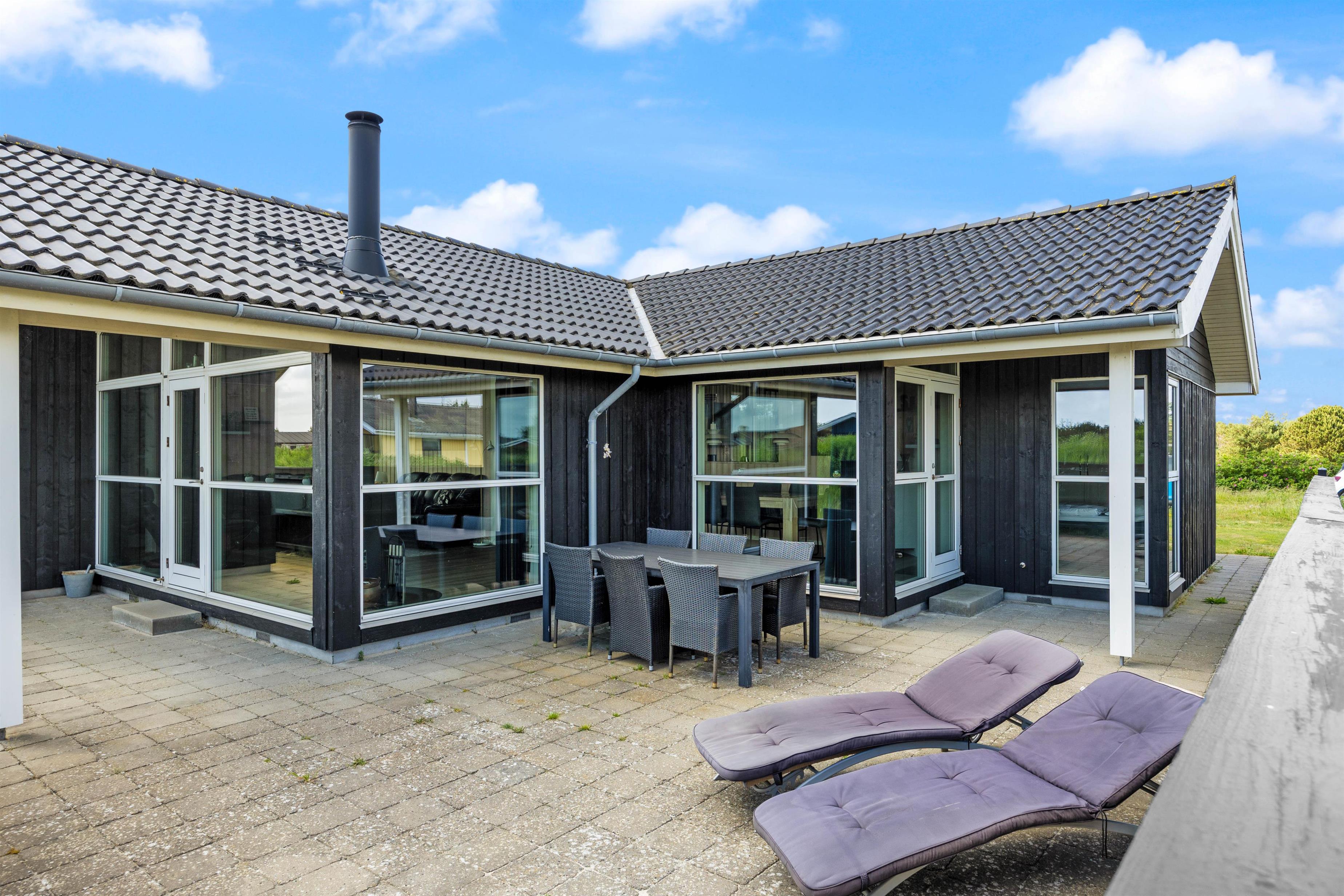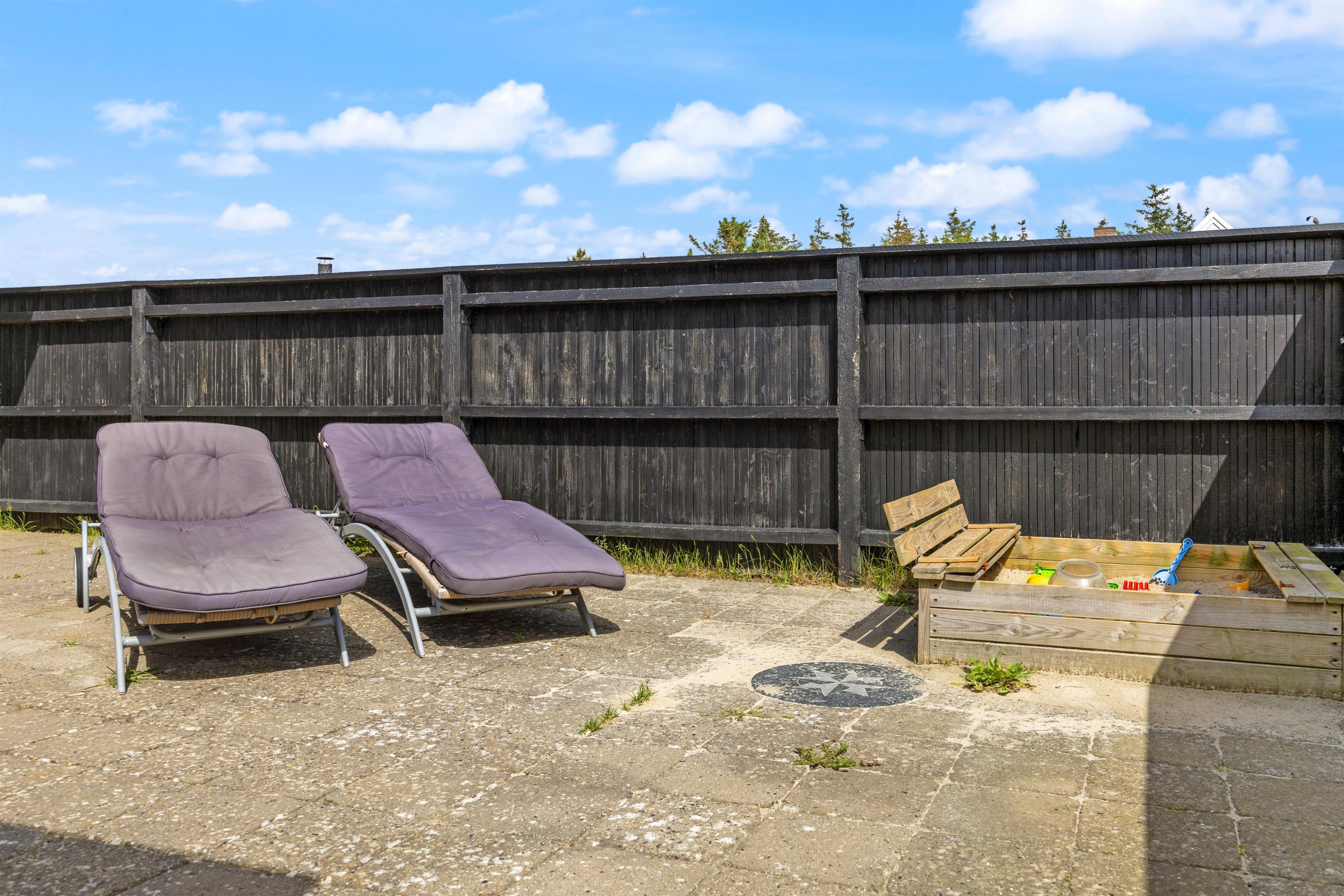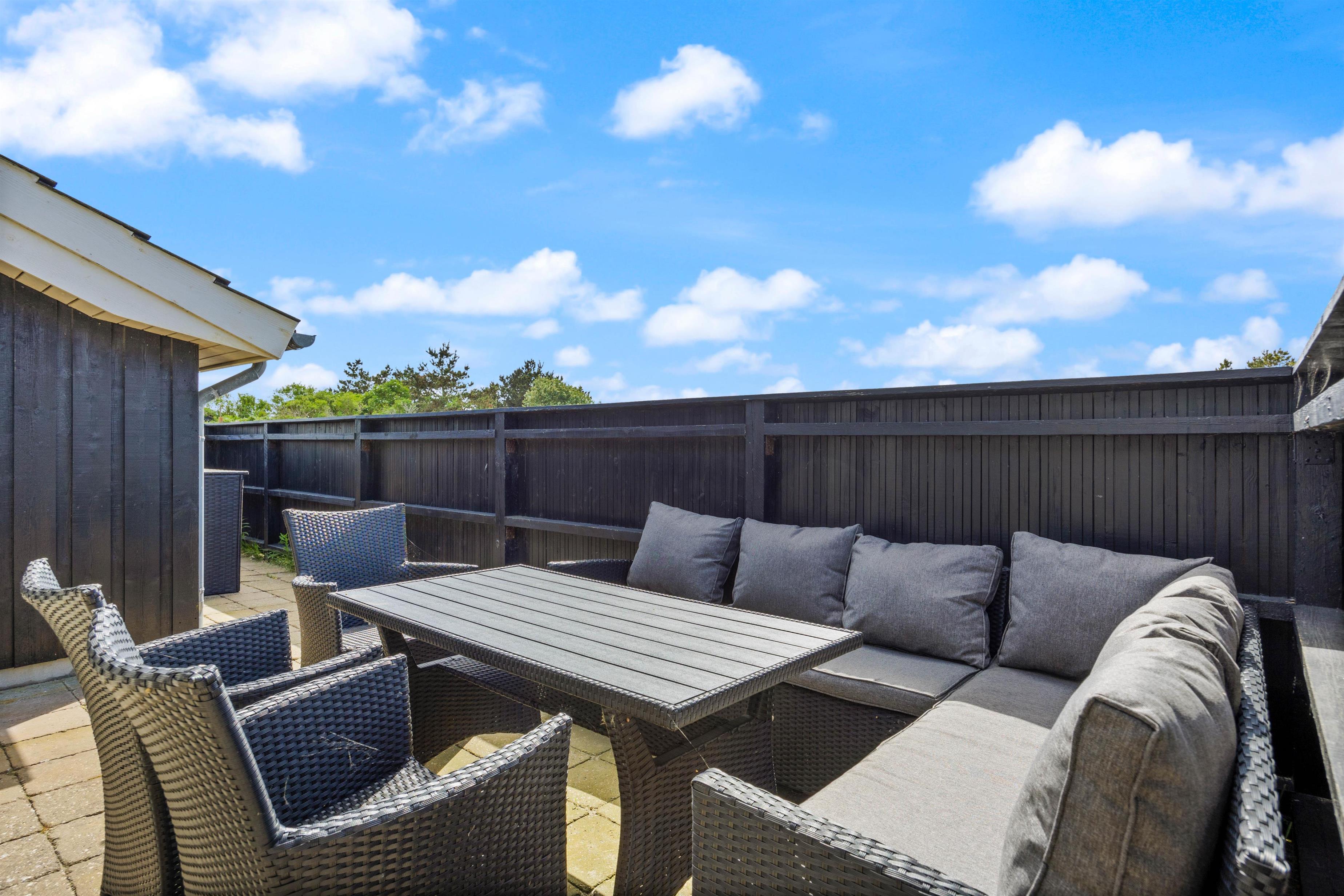 Den afskærmede terrasse tilbyder både sol og læ i de optimale vejrforhold. Slap af på de komfortable liggestole, eller indtag en kølende plads i skyggen under den overdækkede del af terrassen. Her kan I spise måltiderne udendørs – tænd for eksempel op i grillen, og nyd et lækkert grillmåltid imens vinden lægger sig, og solen går ned. Tæt på feriehuset har du også den lokale købmand, så du hurtigt kan købe ind eller hente friskt morgenbrød.