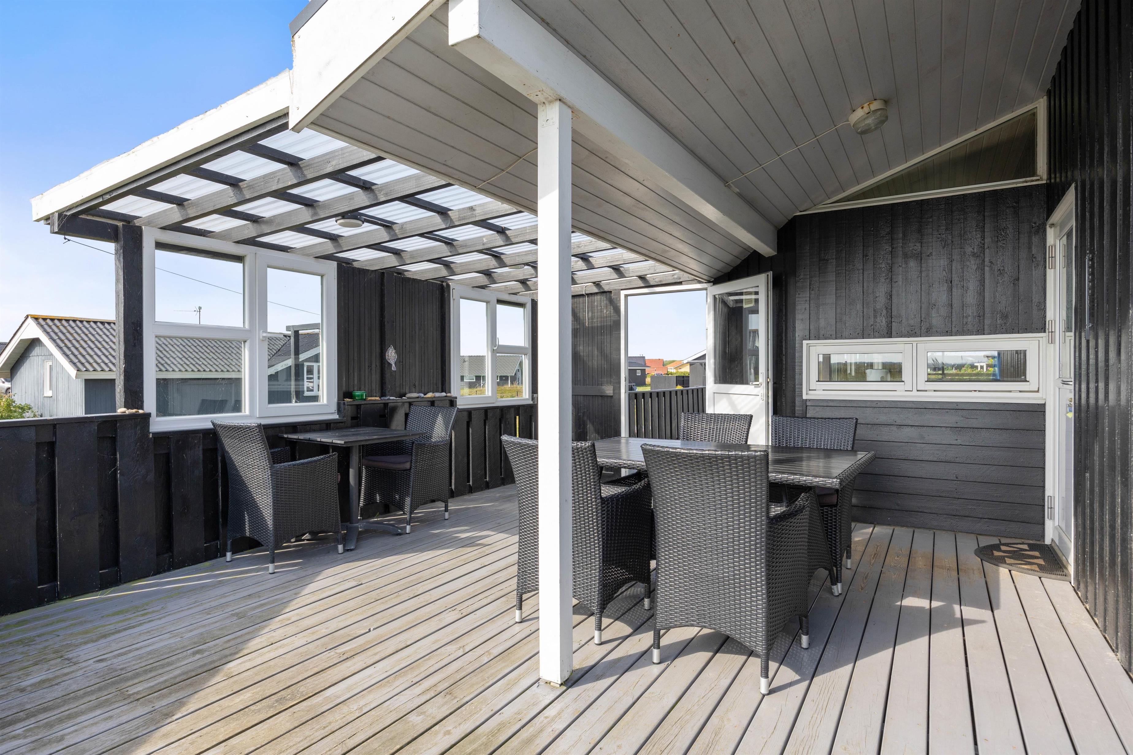 Ved feriehusets udendørsarealer er der plads til at nyde solskinstimer, slappe af og planlægge feriens udflugter. Feriehuset er omgivet af en dejlig træterrasse, som er lukket og delvist overdækket. Her kan I nyde en frokost i skyggen – måske I skal grille pølser og brød?