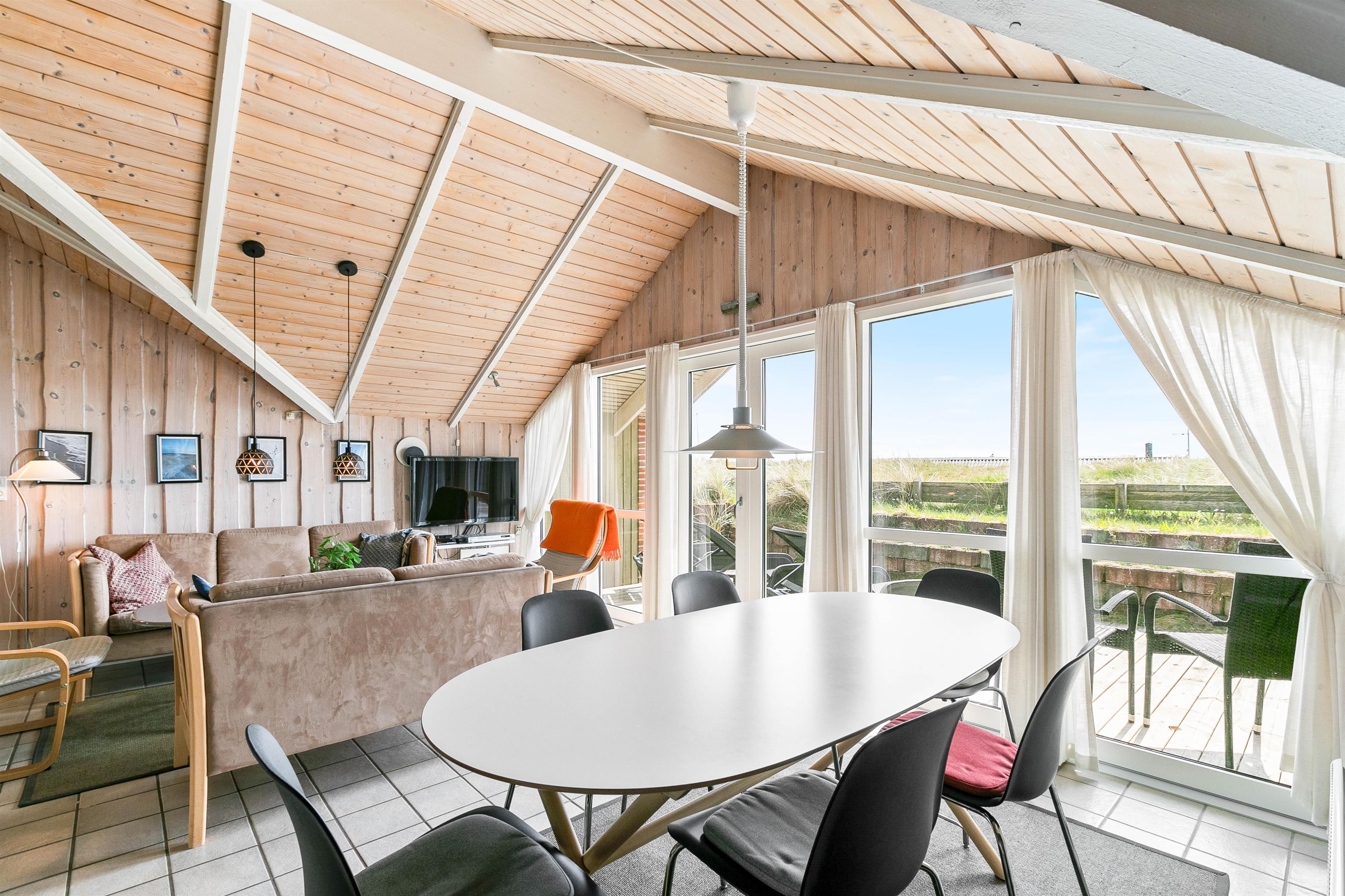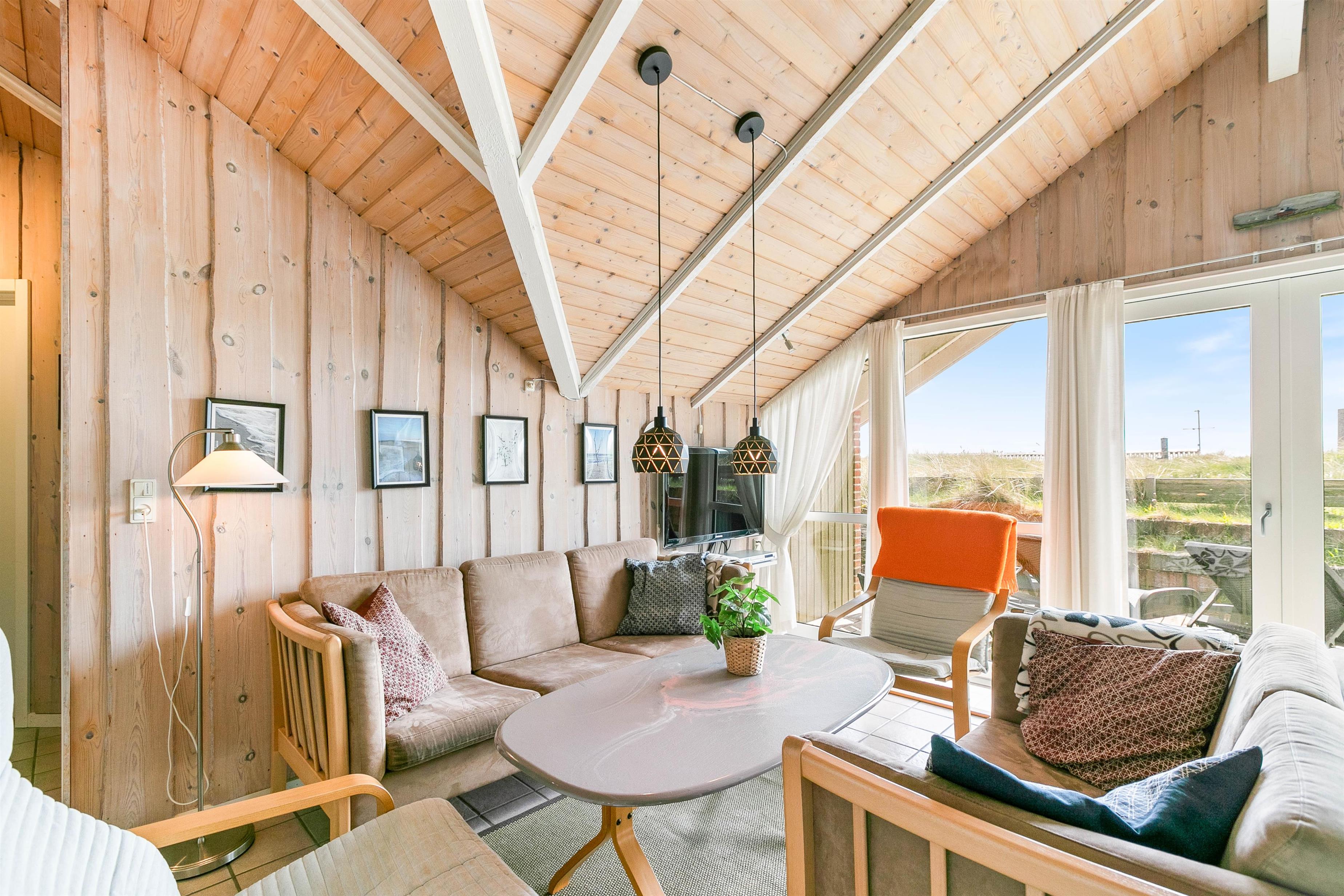 Køkkenet ligger midt i feriehuset og har vindue mod nord, men man kan fra køkkenet også se ud af det sydvendte vinduesparti. I køkkenet finder du en fryser på 100 L, en opvaskemaskine og en mikroovn. Stuen er hyggelig med brændeovn, flisegulv og loft til kip. Der er fladskærms-TV, DVD-afspiller, samt gratis trådløst internet. Fra stuen er der udgang mod syd til en dejlig terrasse.