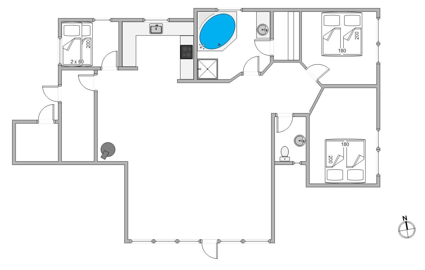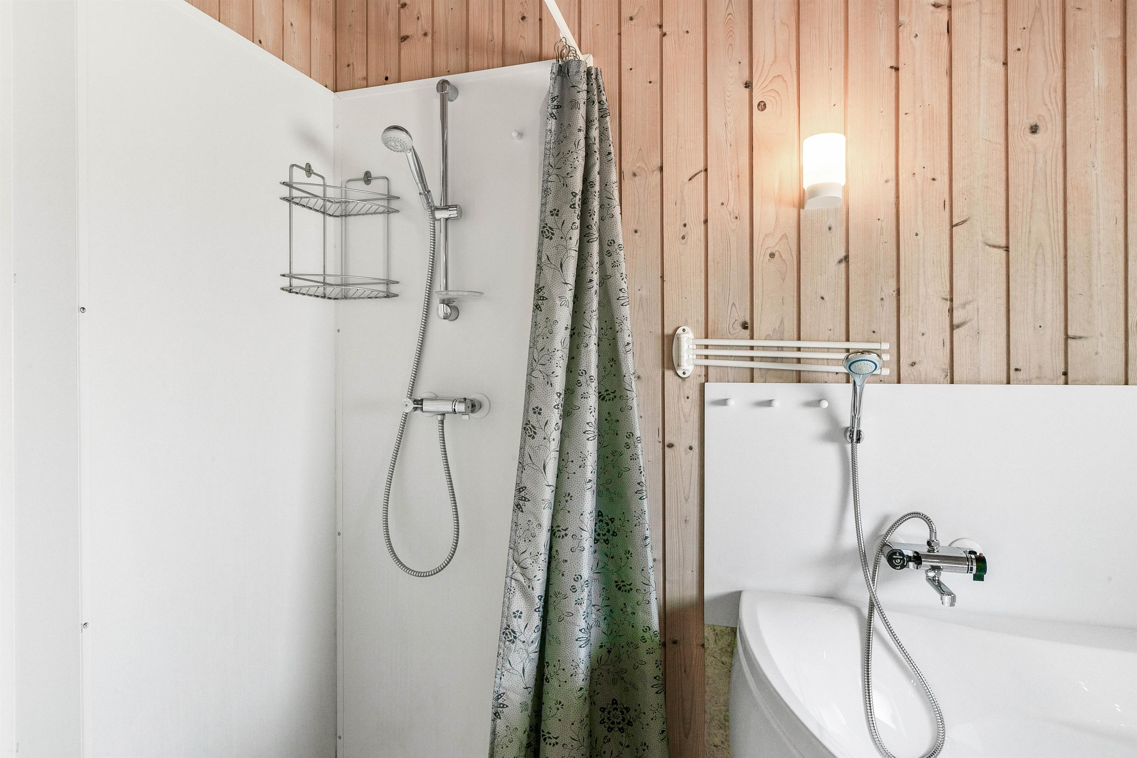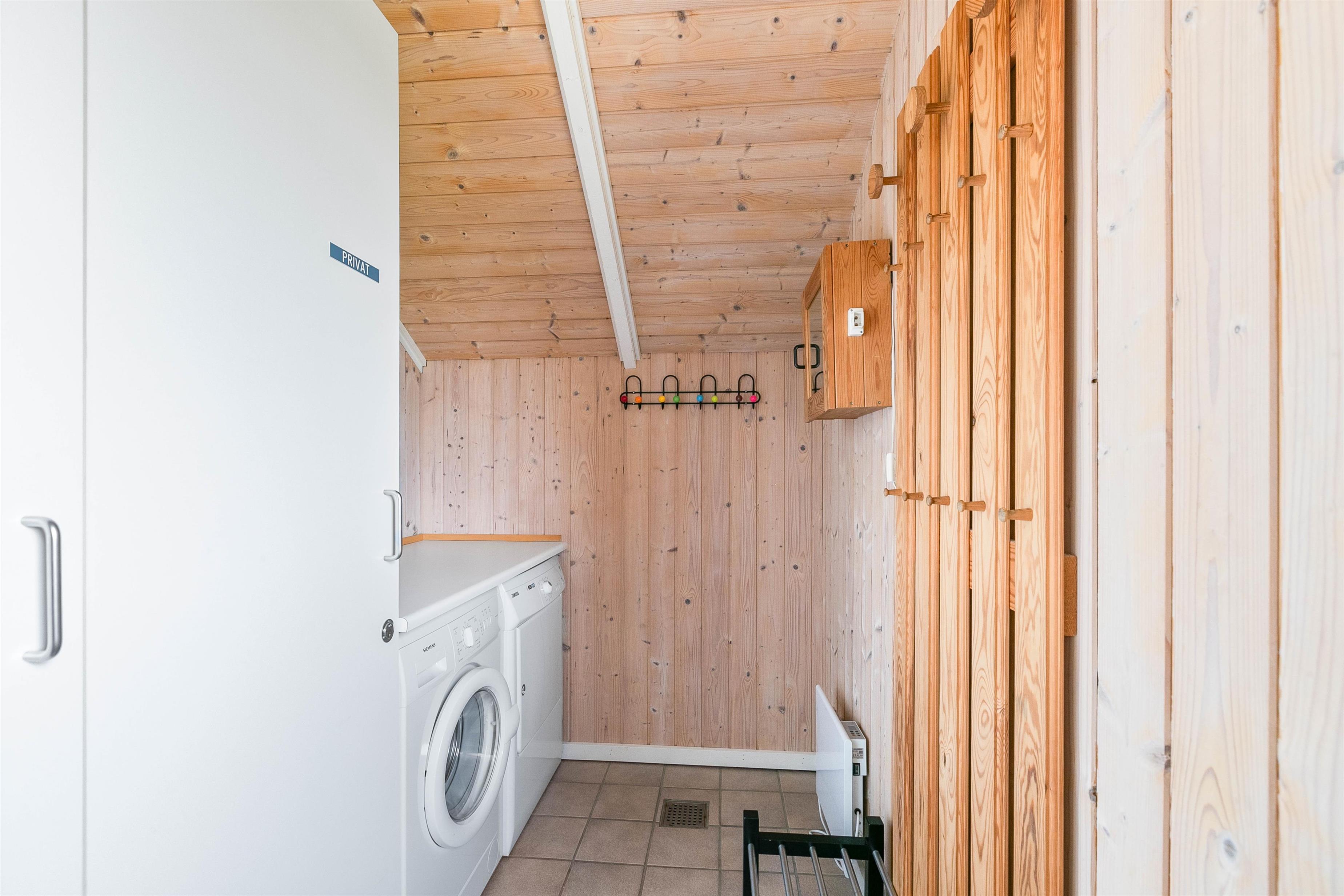 På badeværelset forefindes bruseniche, hjørnespa, sauna og ikke mindst gulvvarme. Toilet og håndvask er praktisk placeret i et andet rum over for badeværelset. Sommerhuset har også en vaskemaskine og en tørretumbler.