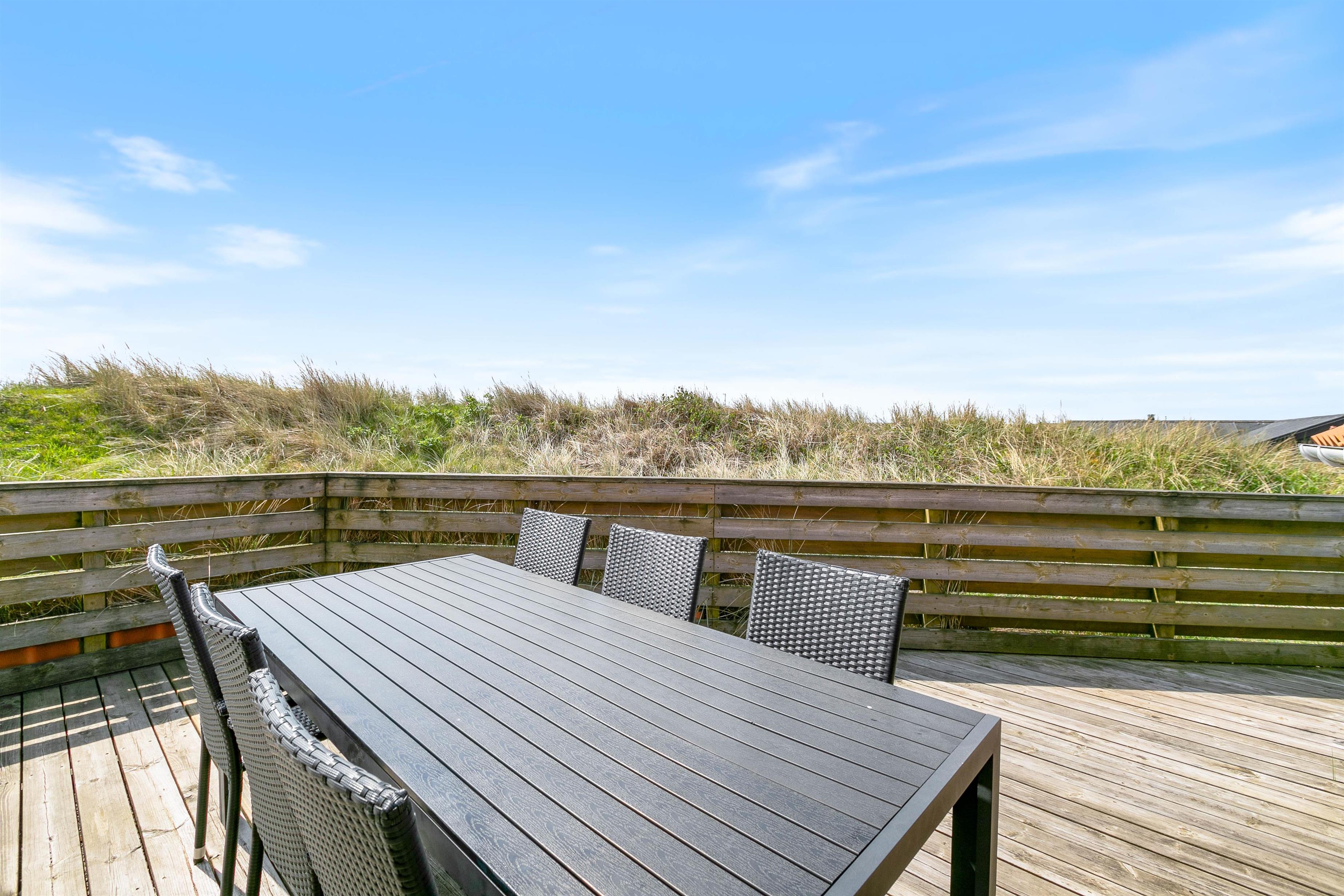 Til sommerhuset hører en god stor terrasse, som er delvist lukket og strækker sig omkring sommerhuset fra syd til vest. Mod syd er den desuden delvist overdækket. Mod øst er der en mindre terrasse, hvor du kan nyde morgenkaffen, mens solen og resten af familien langsomt står op.