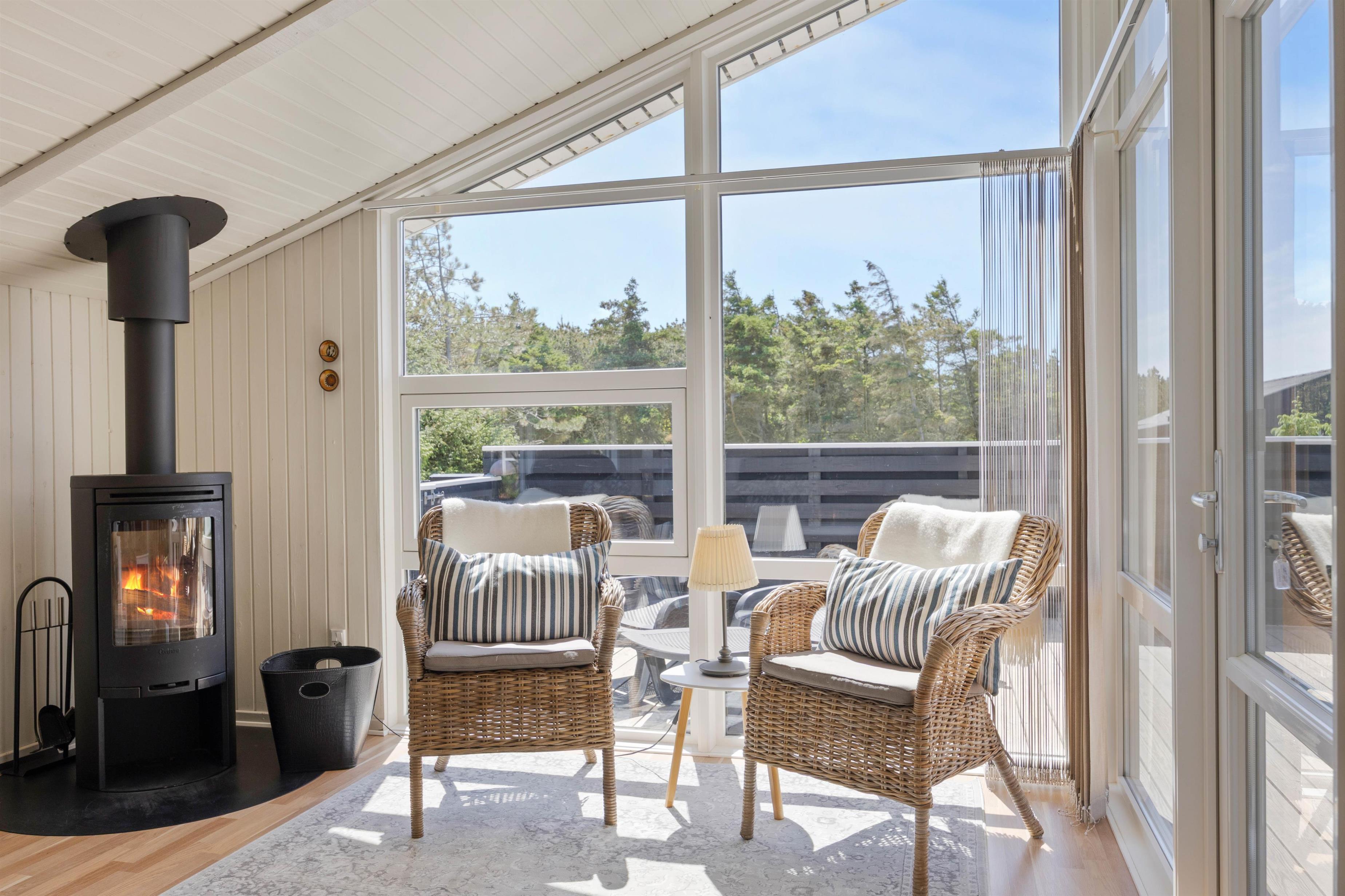 Træd direkte fra opholdsrummet ud på den lukkede terrasse, som er delvist overdækket. Terrassen ved sommerhuset i Bjerregård er både overdækket og lukket, hvilket gør, at den kan benyttes uanset vejret. Også børn er der sørget godt for. I haven er der en gynge og en sandkasse, så de kan lege frit. Den lukkede terrasse giver desuden tryghed og sikkerhed for dem.
