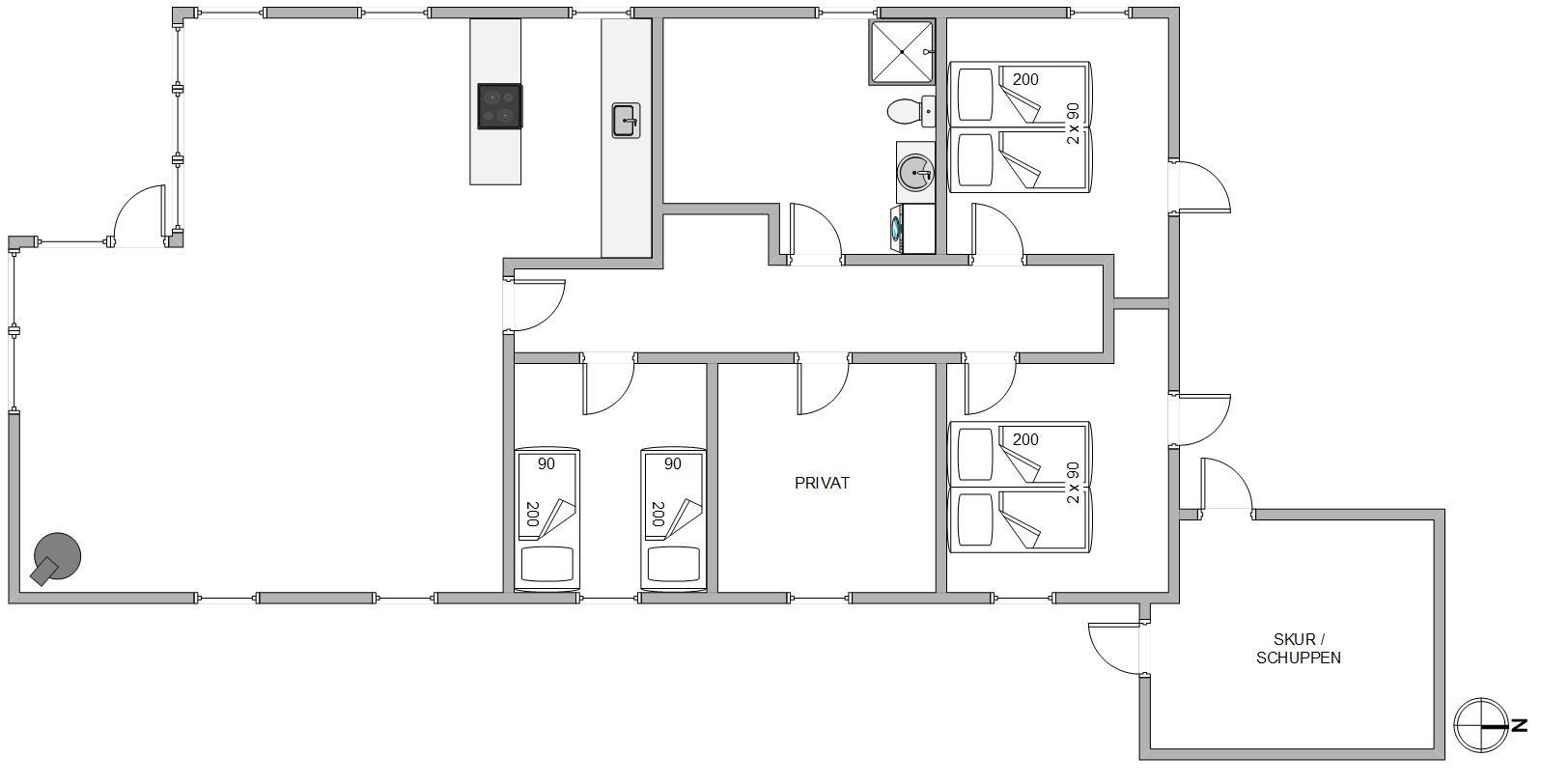 Sommerhuset på Humlegårdsvej 32 har plads til op til 6 personer og er dermed ideelt for familier eller en lille gruppe venner. Det centrale opholdsrum forener køkken, spisestue og stue. Det lyse opholdsrum med store vinduer lukker masser af dagslys ind og skaber en behagelig og lys atmosfære. Med brændeovn i opholdsrummet kan I tænde op og nyde varmen fra gløderne på køligere aftener. Især om morgenen, når brændeovnen endnu ikke er tændt, fungerer den energibesparende varmepumpe som en omkostningseffektiv varmekilde.