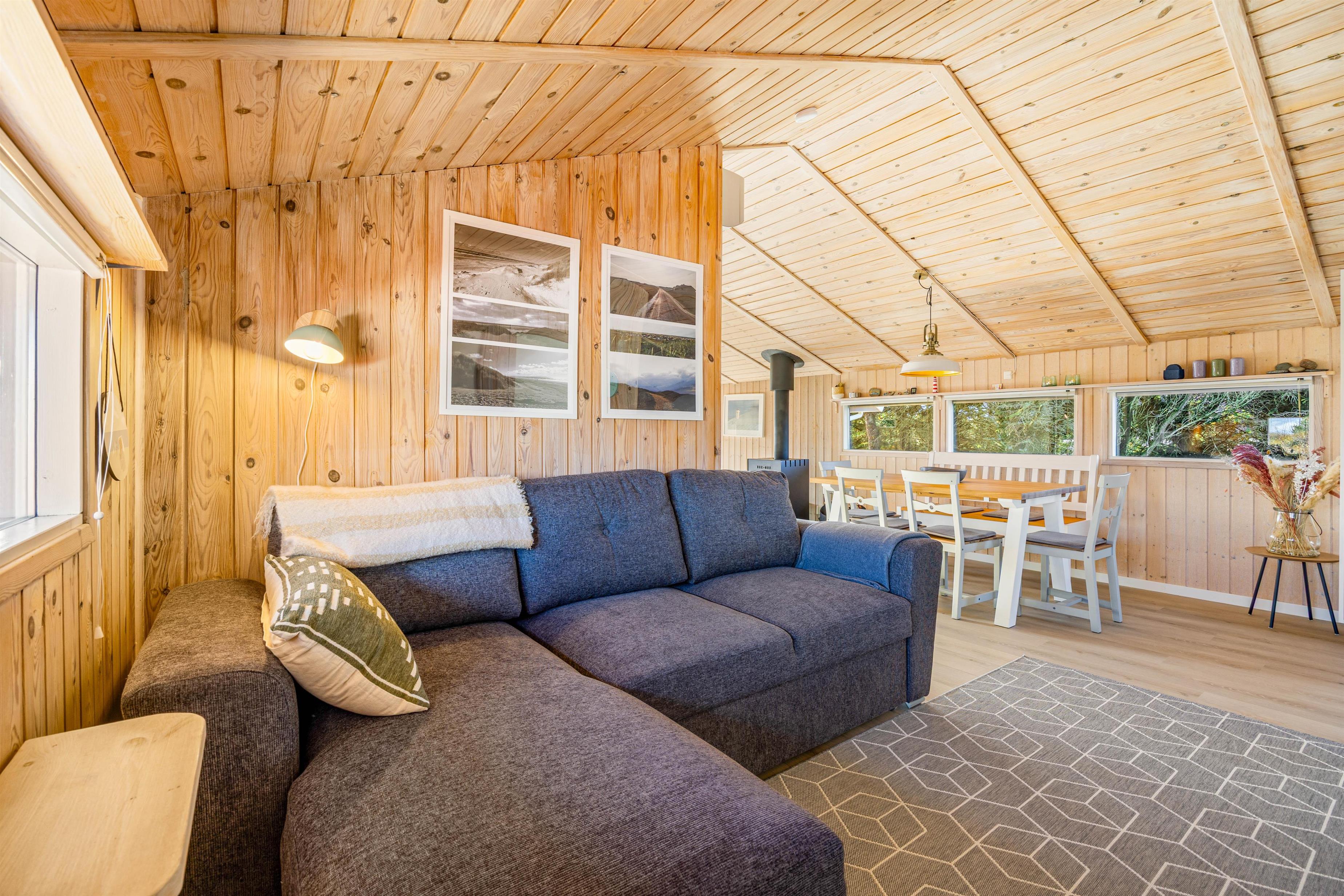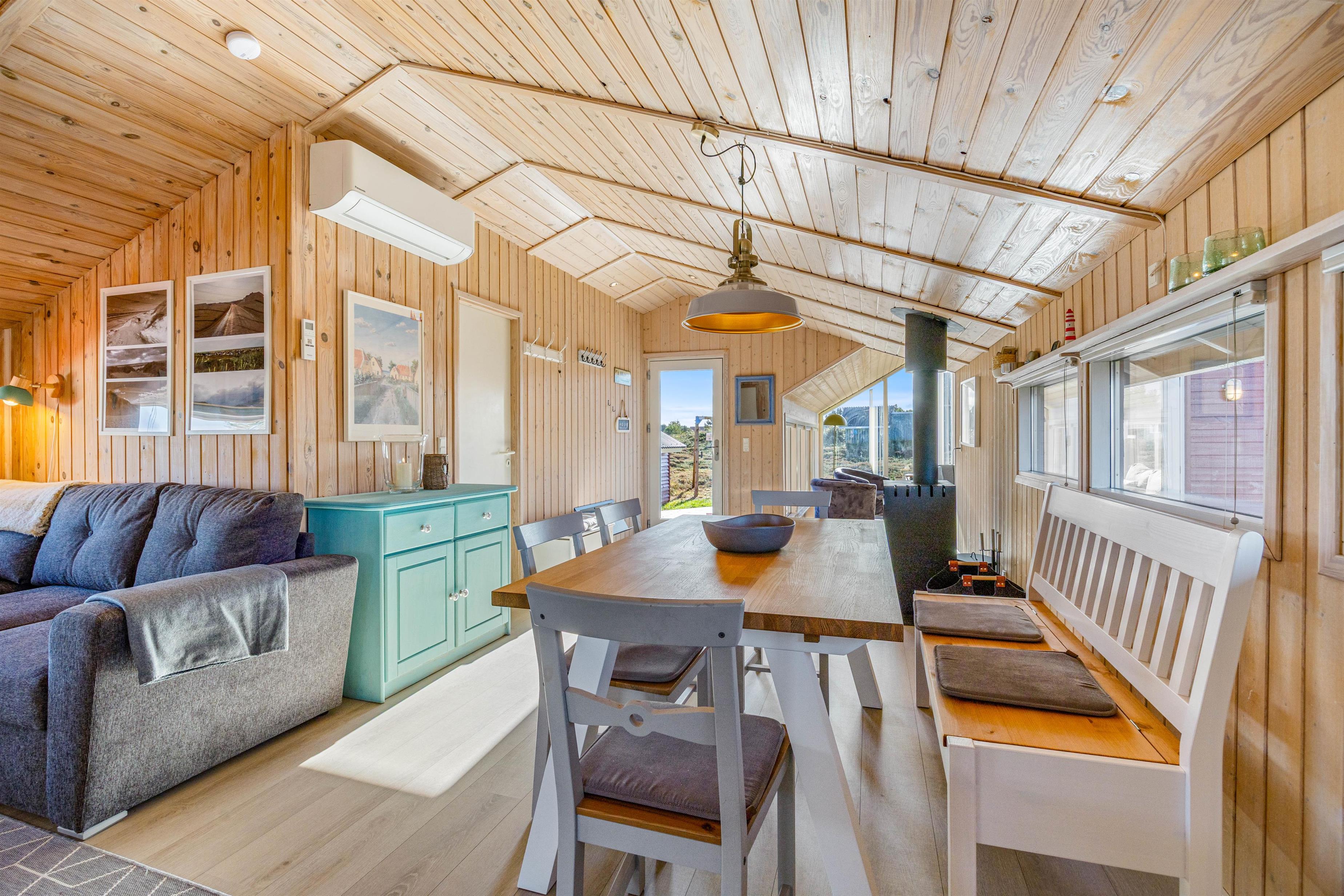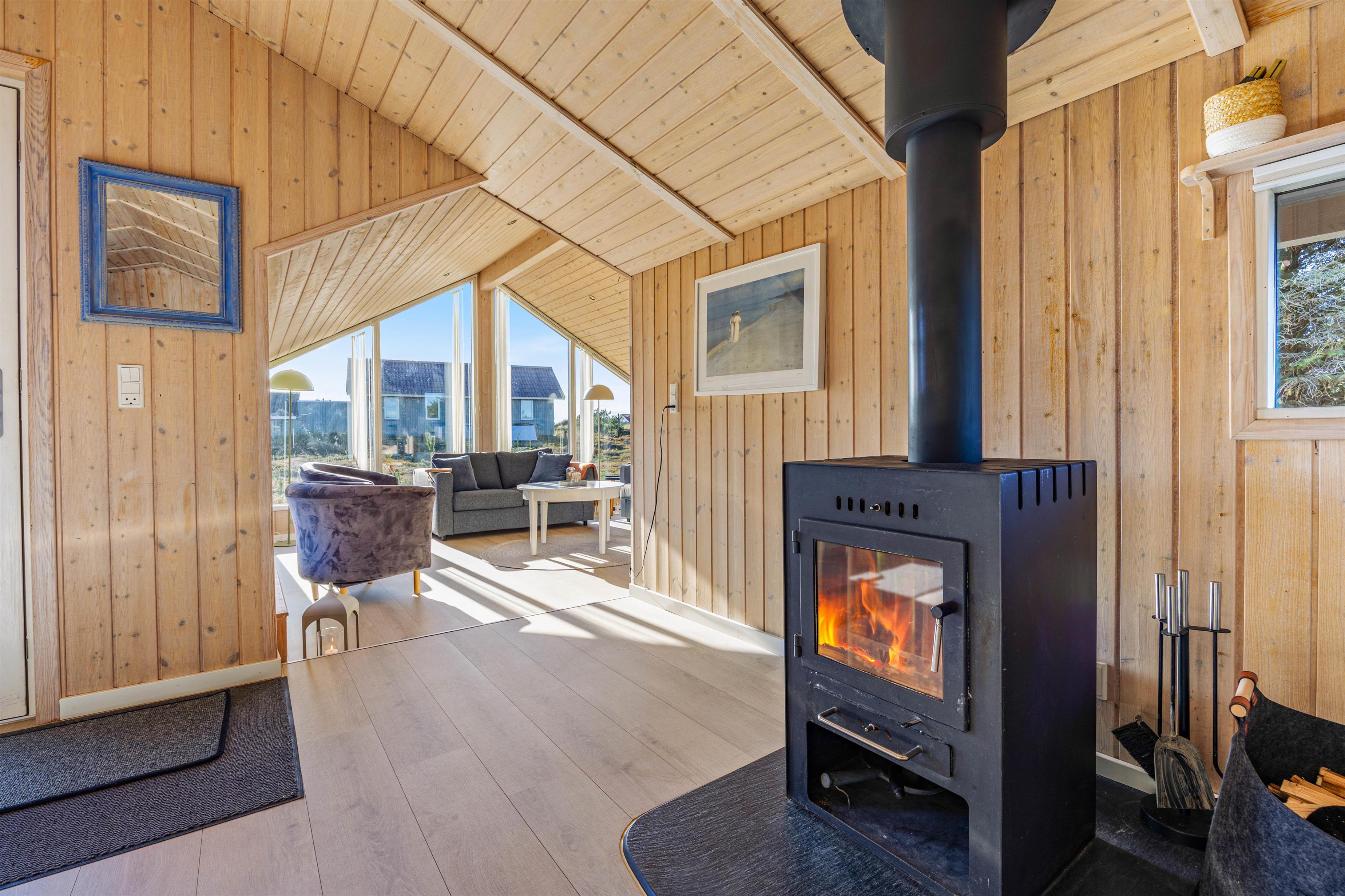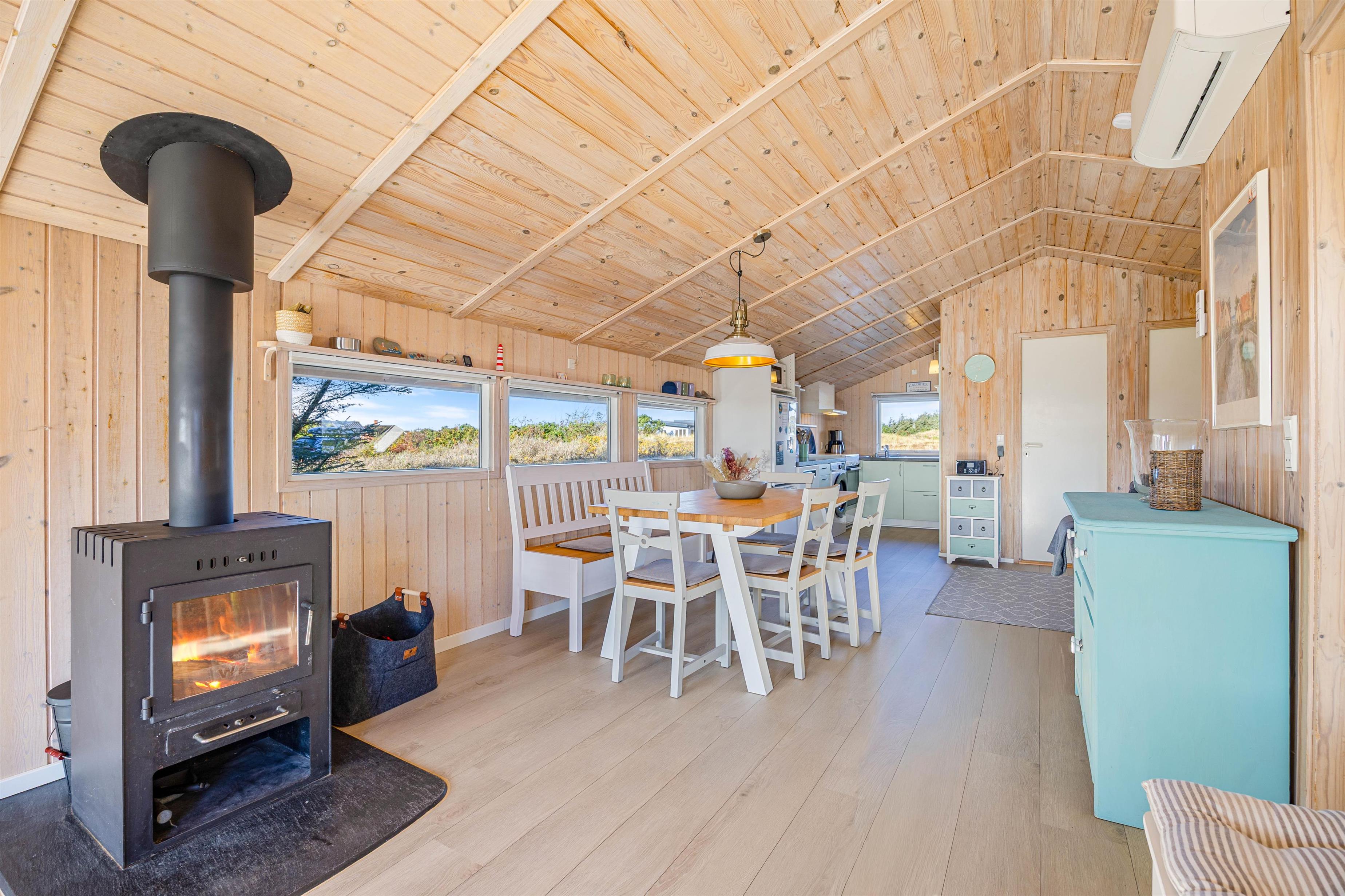 Feriehuset er af ældre dato og emmer af klassisk sommerhusstemning. I stuen kan I samles omkring brændeovnen, som skaber varme og hygge på kølige aftener, mens en varmepumpe sørger for et behageligt indeklima. Badeværelset er med gulvvarme, så I får en behagelig start på dagen.