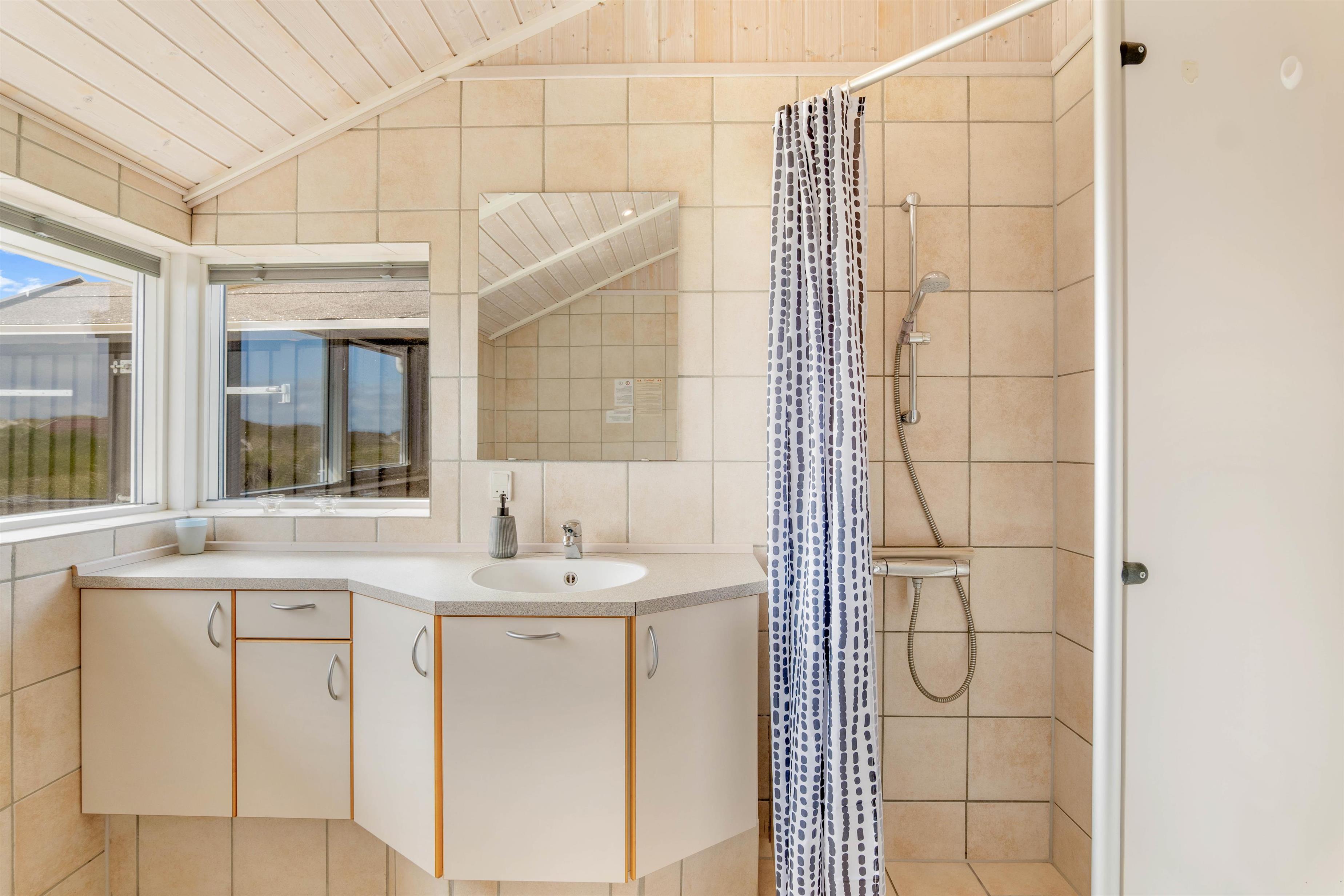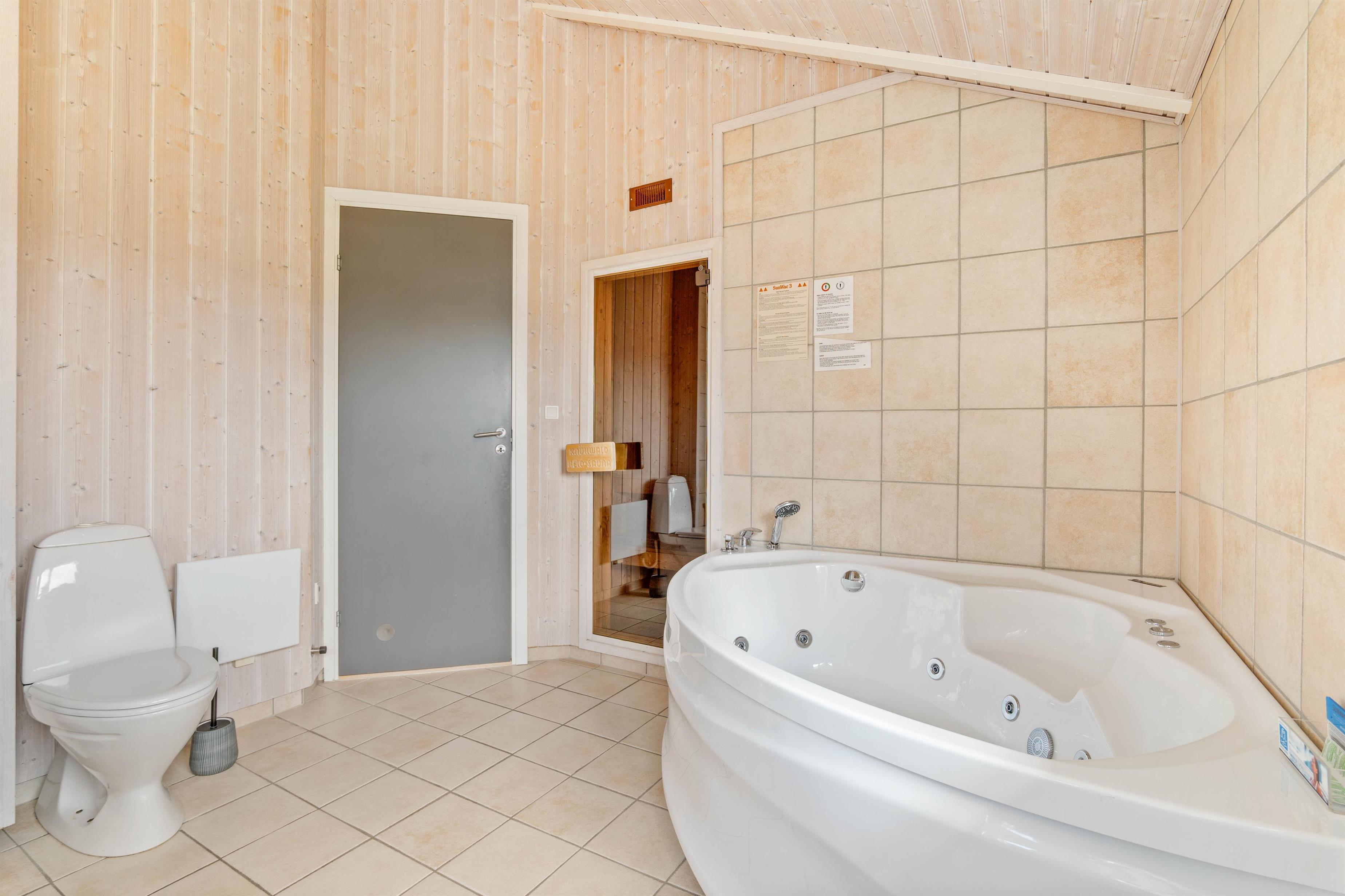 På badeværelset er der lagt op til en afslappende stund i saunaen eller spabadet efter en god dag i naturen.