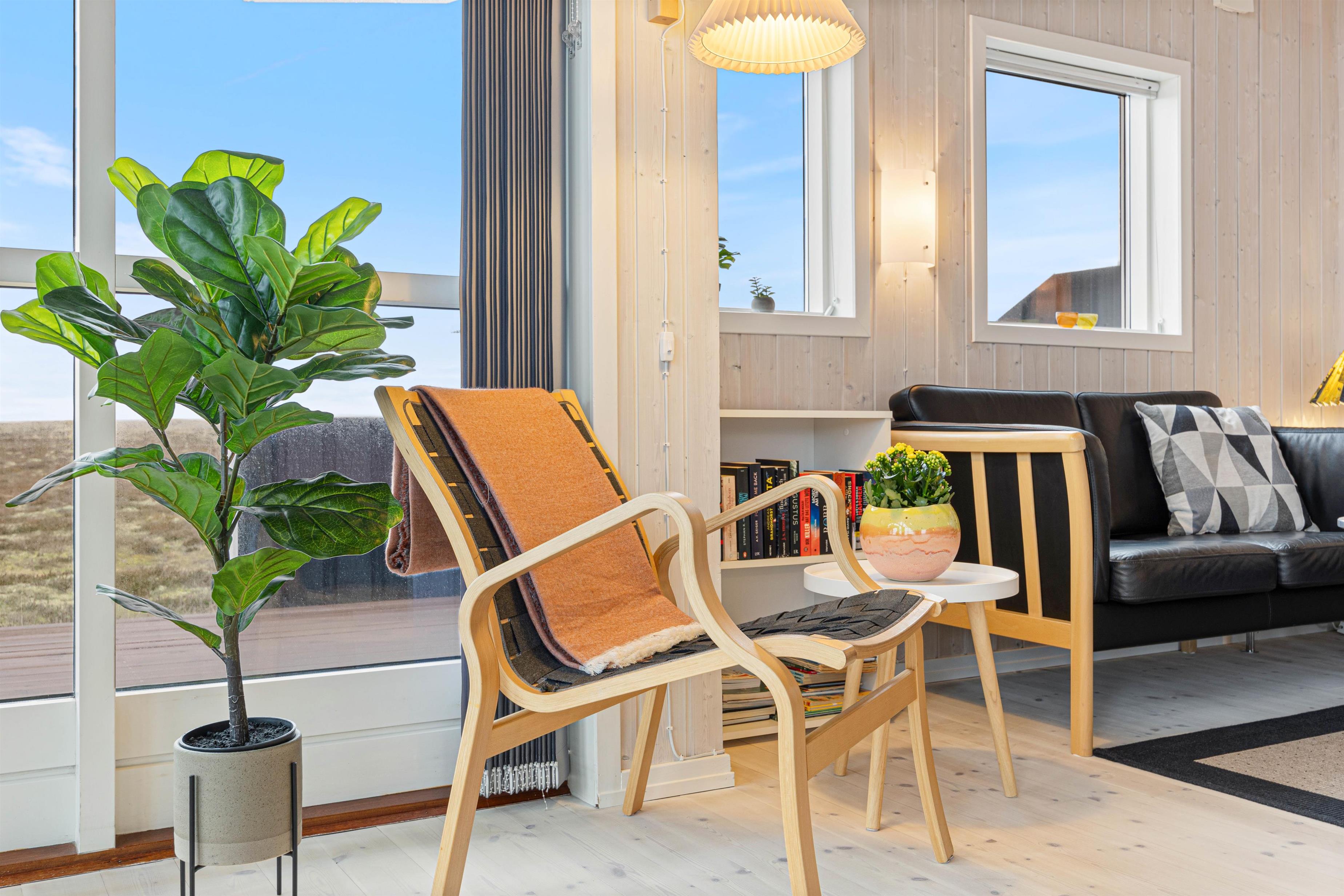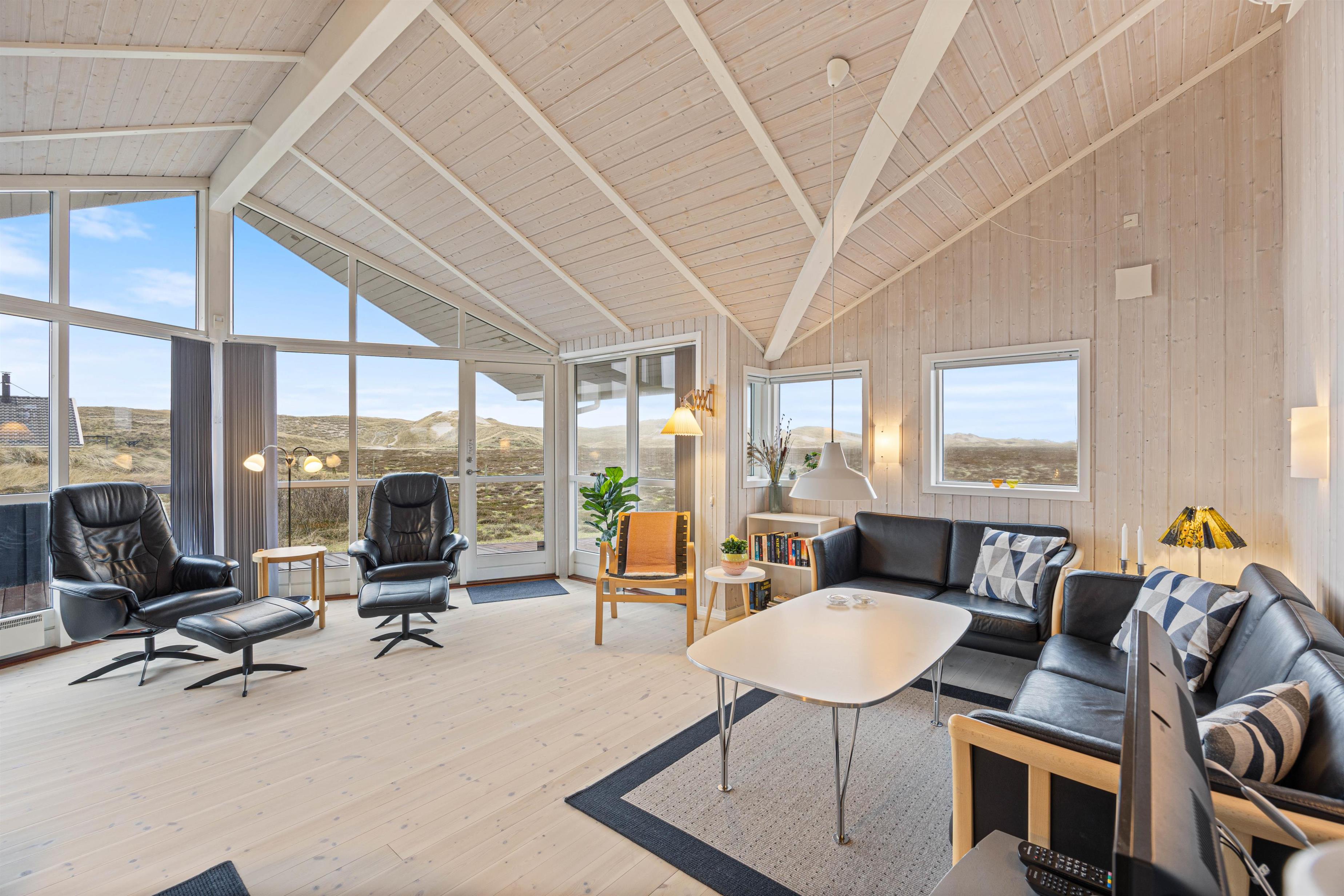 På Bjerregårdsvej 356 finder I midt i sommerhuset den åbne opholdsstue med et stort vinduesparti, som giver et skønt lysindfald i rummet. Sæt jer godt til rette i sofaen og nyd den skønne udsigt over klitlandskabet, mens brændeovnen spreder varme og ekstra hyggelig feriestemning.