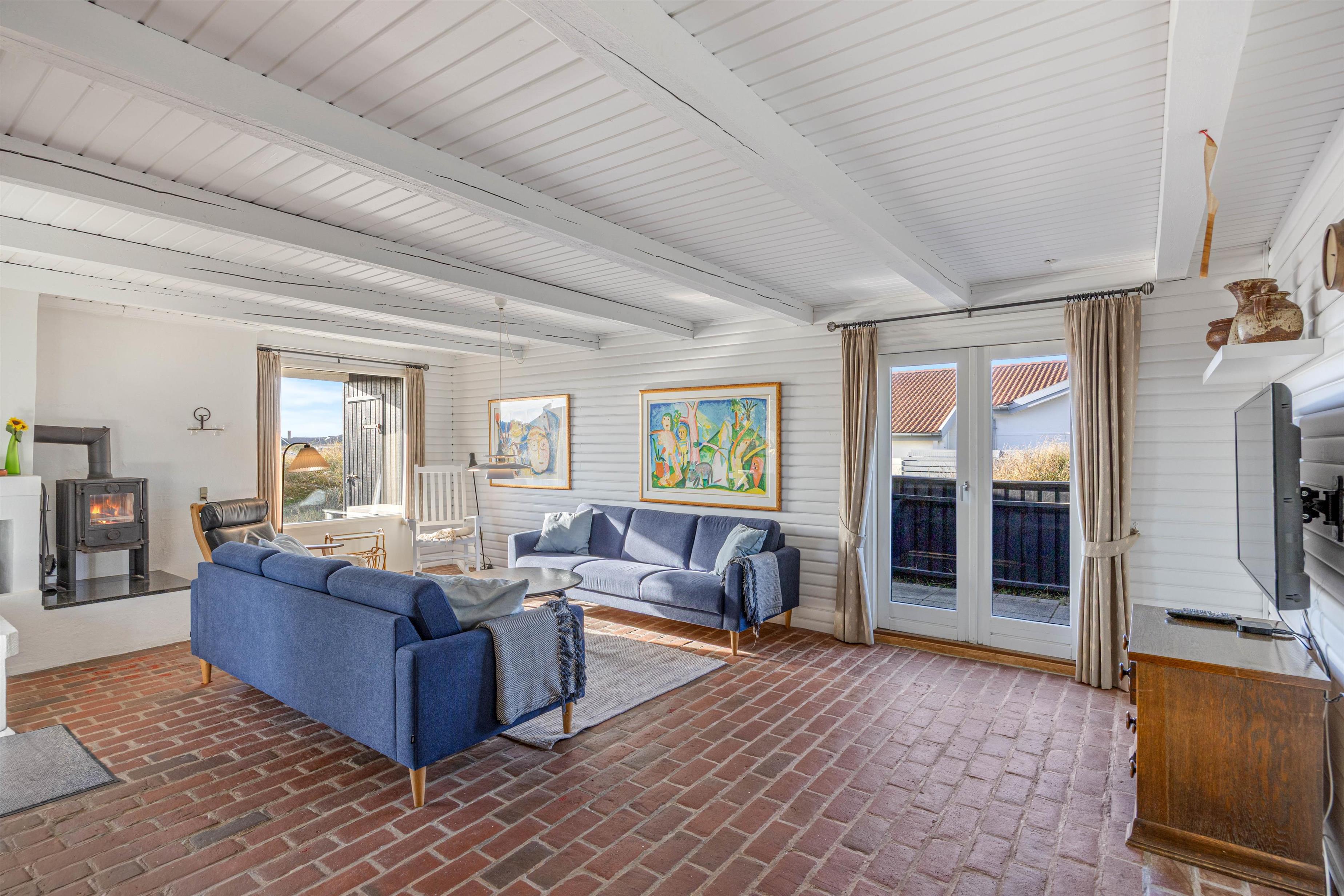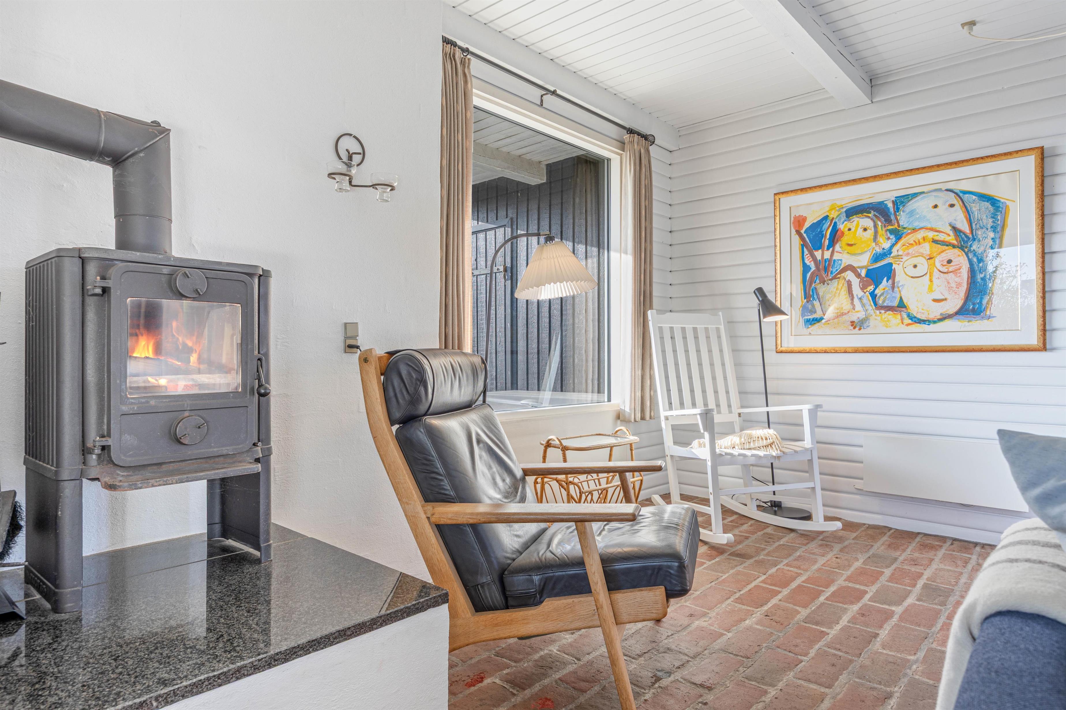 Sommerhuset er indrettet med køkken i åben forbindelse med stuen. Her er hvidmalede træ vægge og lofter, samt et flot flisegulv. Stuen er hyggelig indrettet med brændeovn, fladskærm og gode møbler. Fra stuen er der udgang til terrassen.