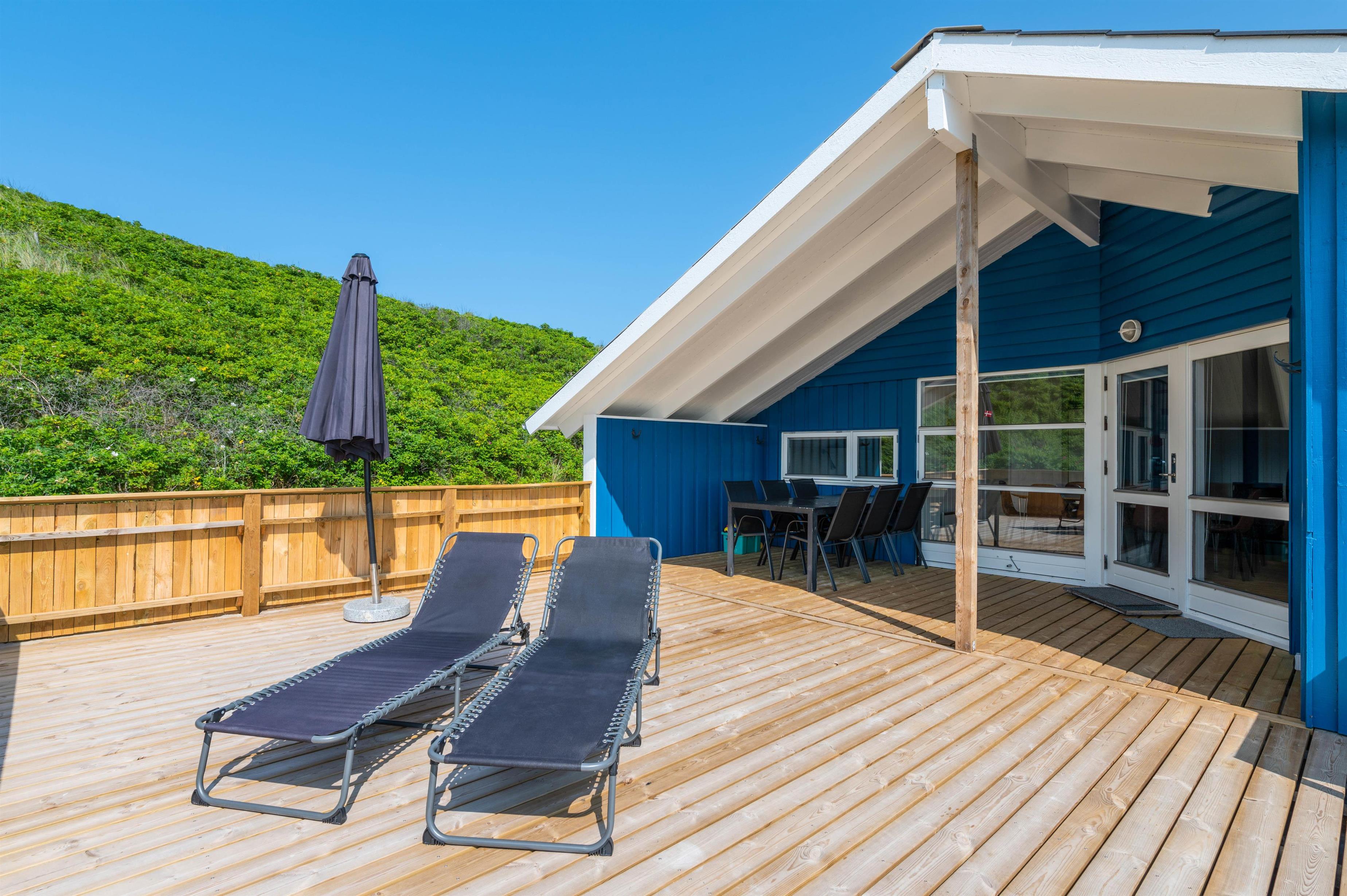 Rauhesvej 76 har en skøn og helt lukket sydvendt terrasse. Den er desuden delvist overdækket og delvist afskærmet. Fra terrassen er der en smuk udsigt til klitlandskabet, som fuldendes af den friske duft fra Vesterhavet. Her er der mulighed for hyggelige grillaftener, ligesom terrassen og gyngerne ved sommerhuset er ideel for familier med små børn og hund.
