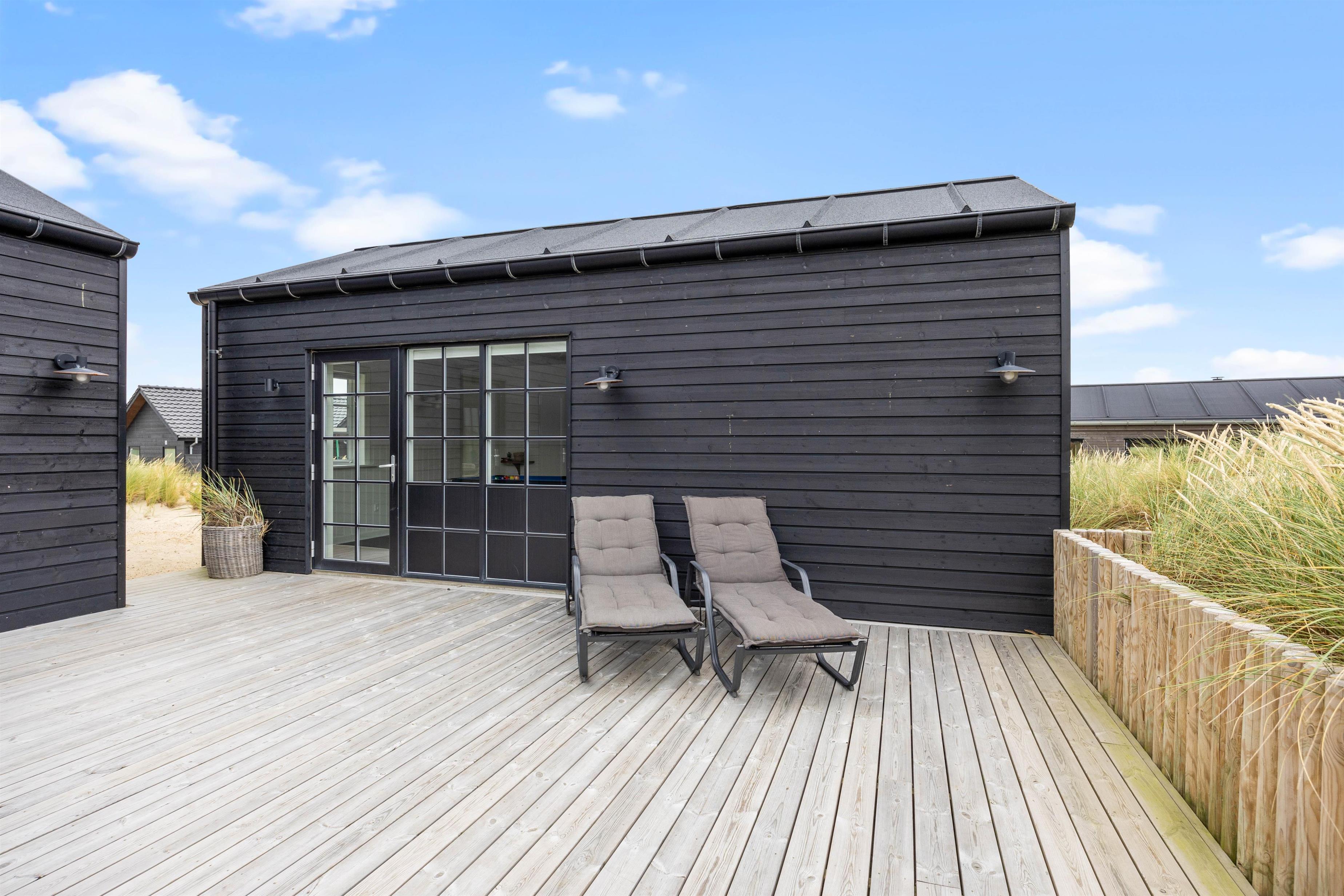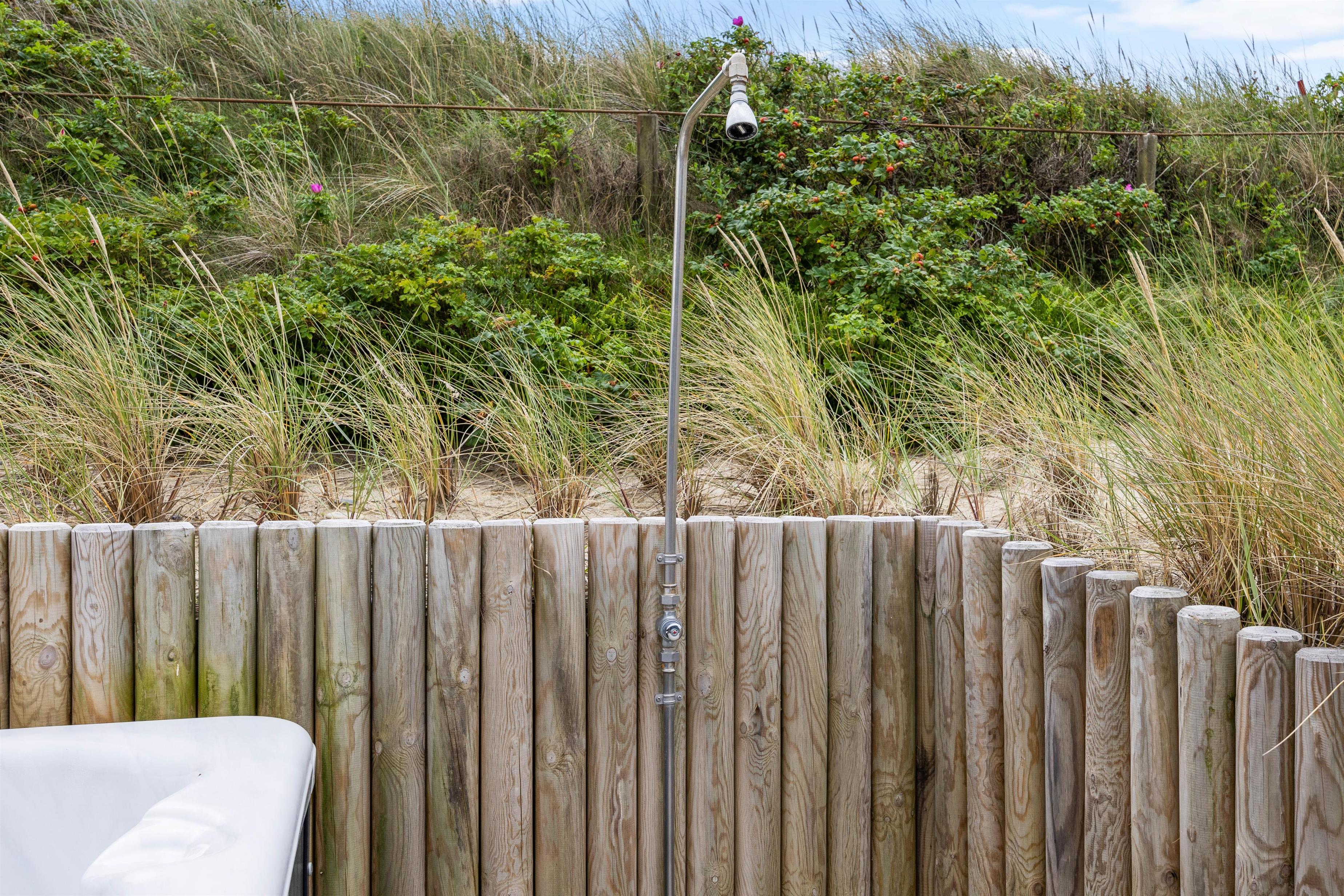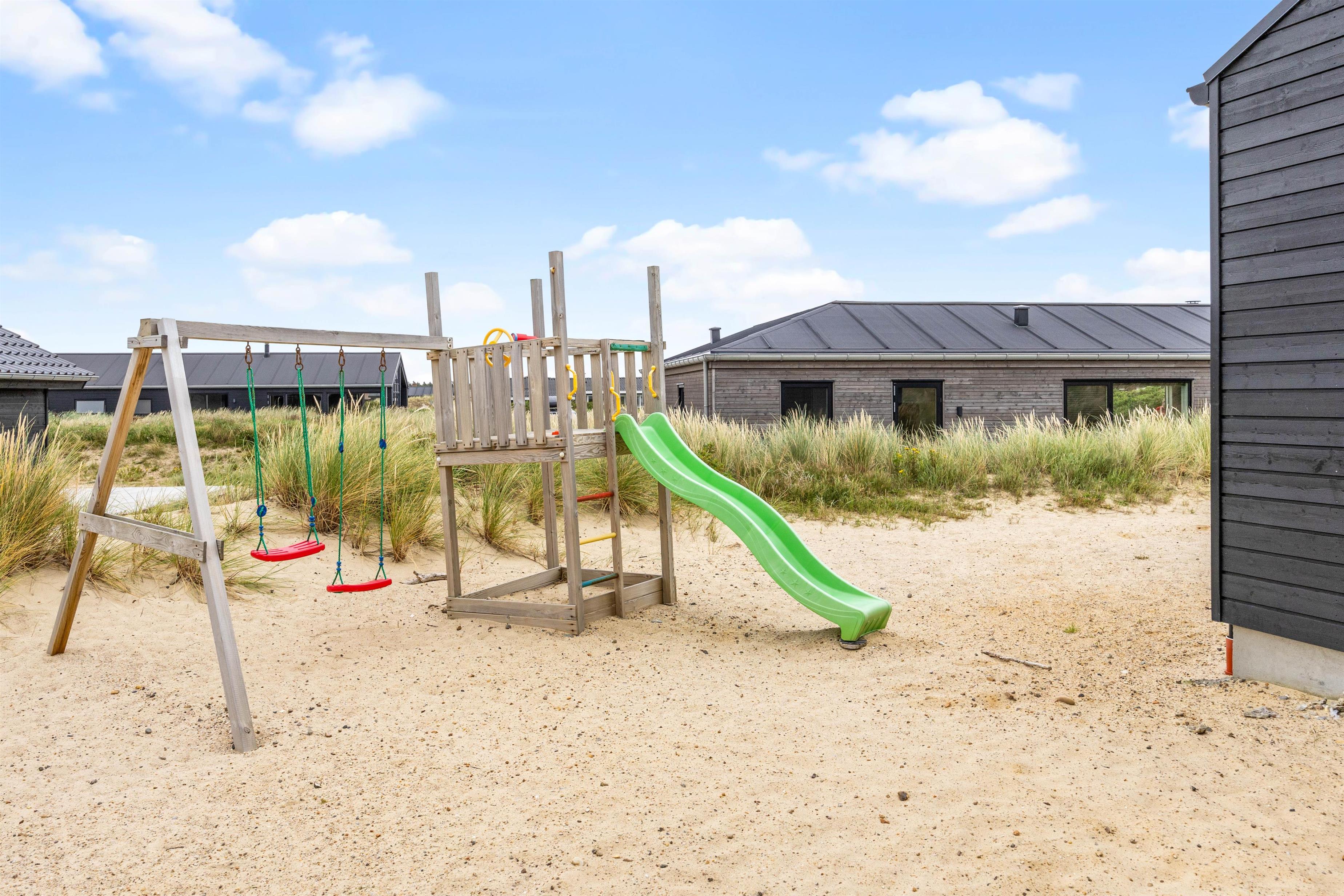 Udendørs er selve beliggenheden enestående med kun 50 meter til havet. Selv om der ligger flere sommerhuse i området, er I helt ugenerte her, da sommerhuset er omgivet af sandvolde med marehalm. Terrasseområdet er inddelt i flere afsnit, hvor der fra indendørspoolen er udgang til et spaområde med udespa, solsenge og udebruser. Udebruseren kan benyttes fra april til november. Der er et afsnit med sofa og lænestole, og et afsnit med gasgrill og spisemøbler. Her vil I altid kunne finde en plet med læ og lys til at læse en god bog eller bare nyde den friske luft. Til de små er der gyngestativ med tårn og rutchebane, så de kan brænde krudt af her.