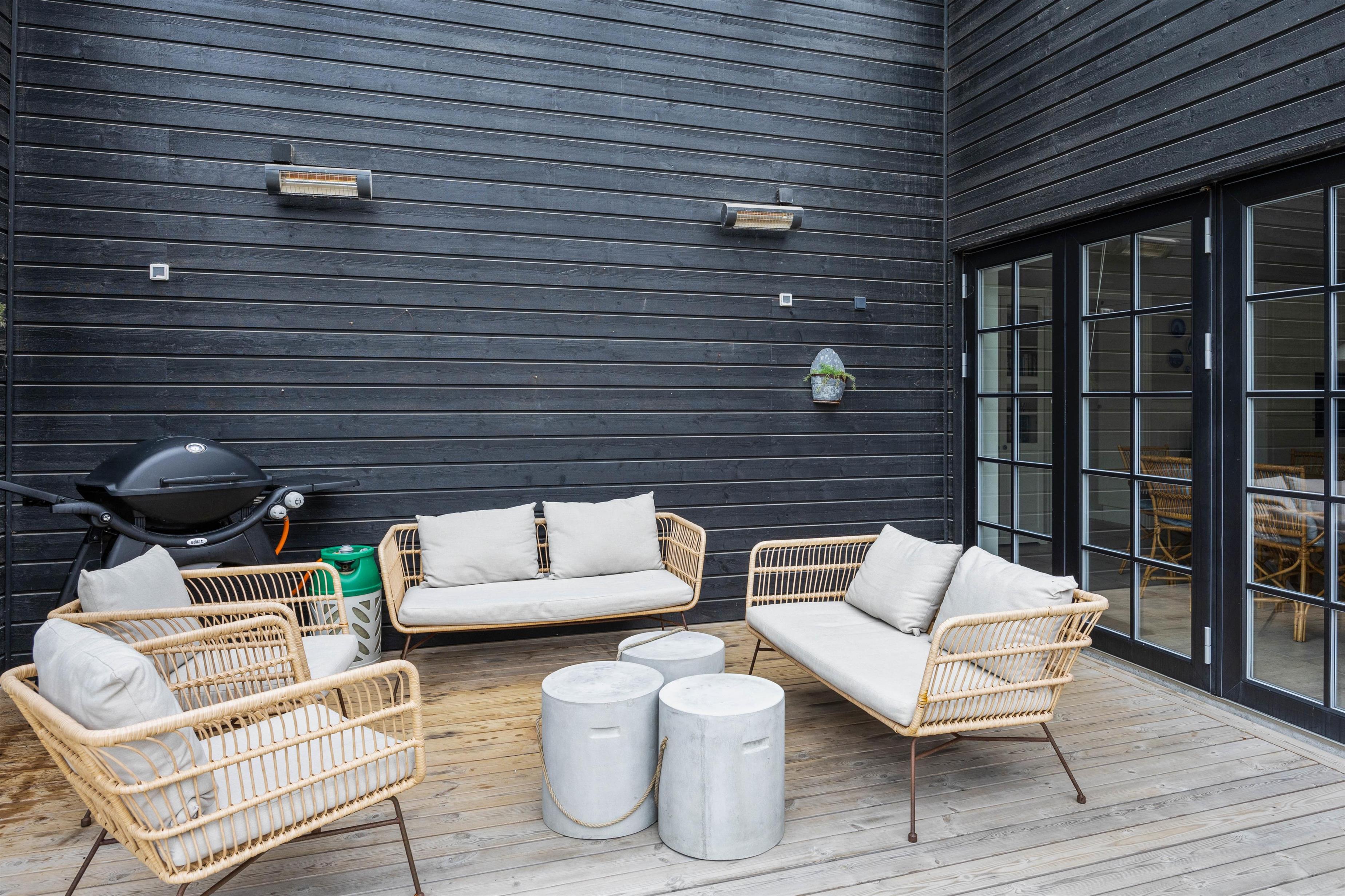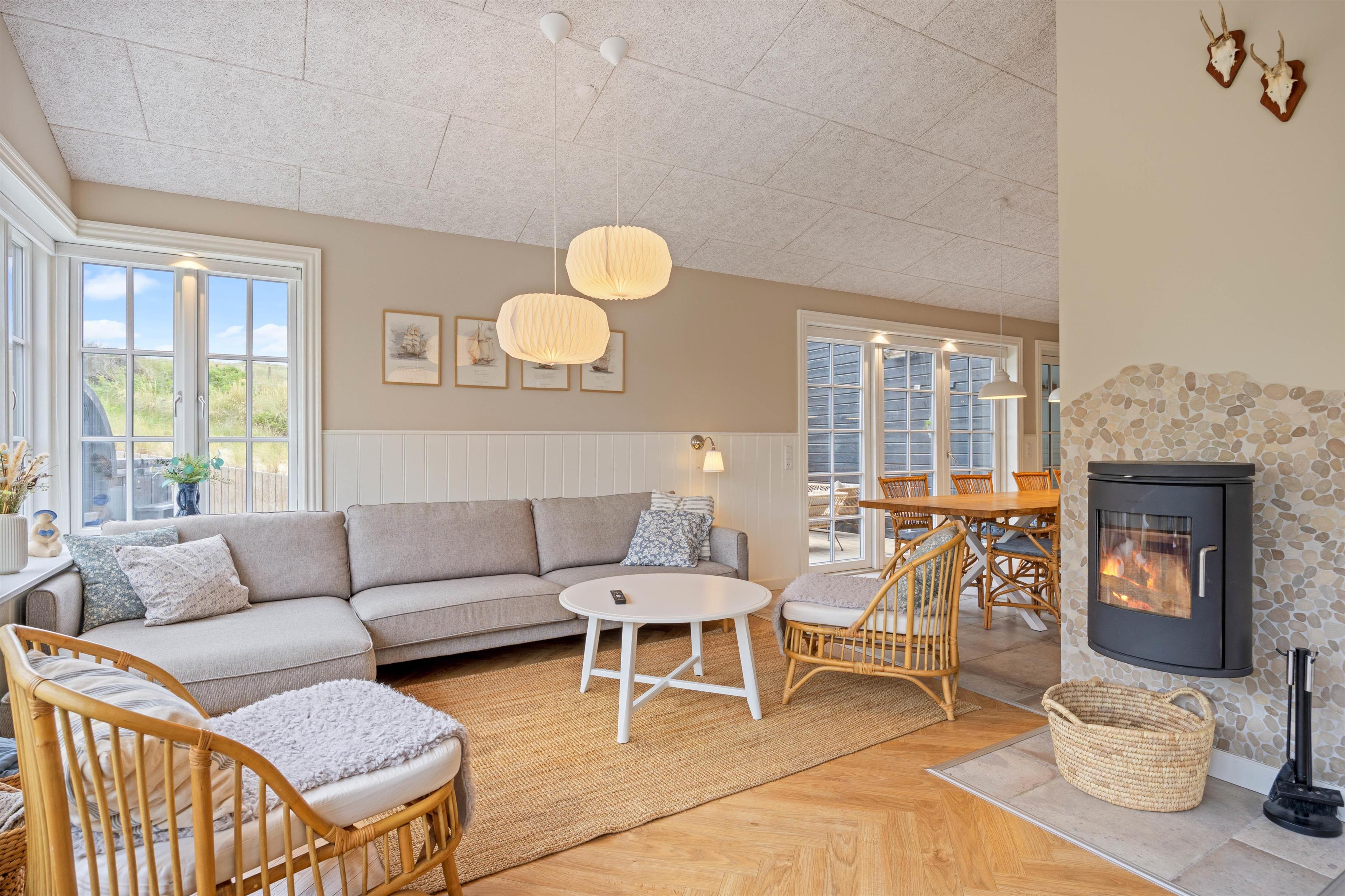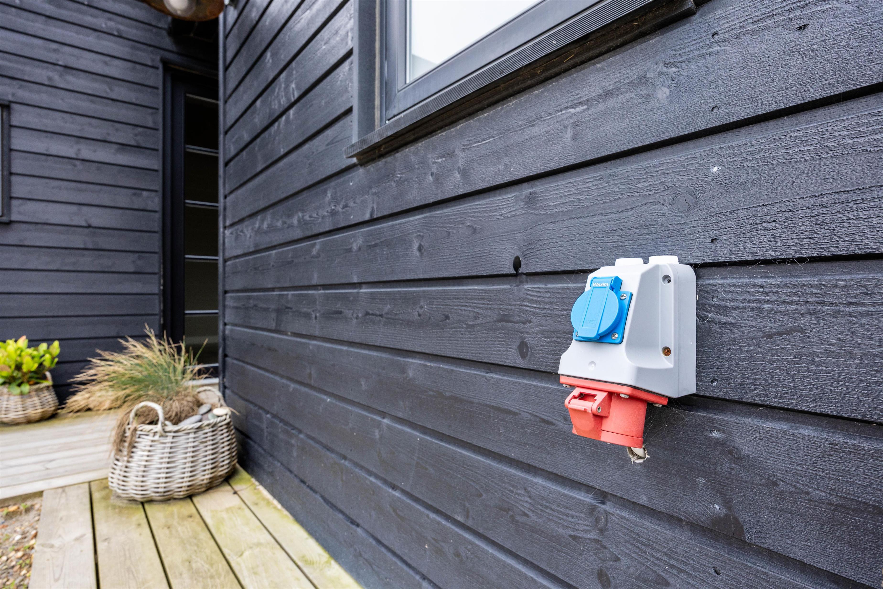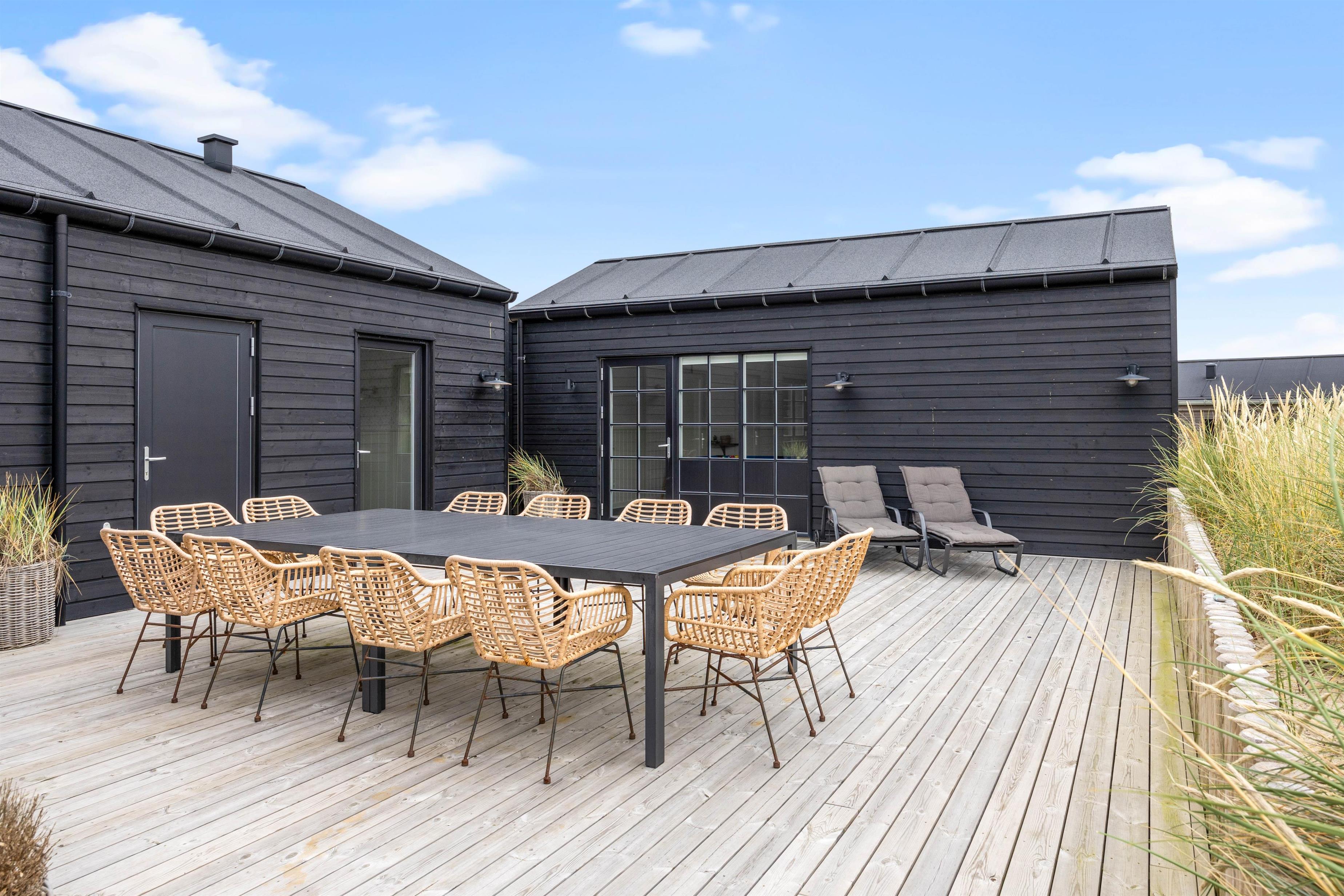 Udendørs er selve beliggenheden enestående med kun 50 meter til havet. Selv om der ligger flere sommerhuse i området, er I helt ugenerte her, da sommerhuset er omgivet af sandvolde med marehalm. Terrasseområdet er inddelt i flere afsnit, hvor der fra indendørspoolen er udgang til et spaområde med udespa, solsenge og udebruser. Udebruseren kan benyttes fra april til november. Der er et afsnit med sofa og lænestole, og et afsnit med gasgrill og spisemøbler. Her vil I altid kunne finde en plet med læ og lys til at læse en god bog eller bare nyde den friske luft. Til de små er der gyngestativ med tårn og rutchebane, så de kan brænde krudt af her.