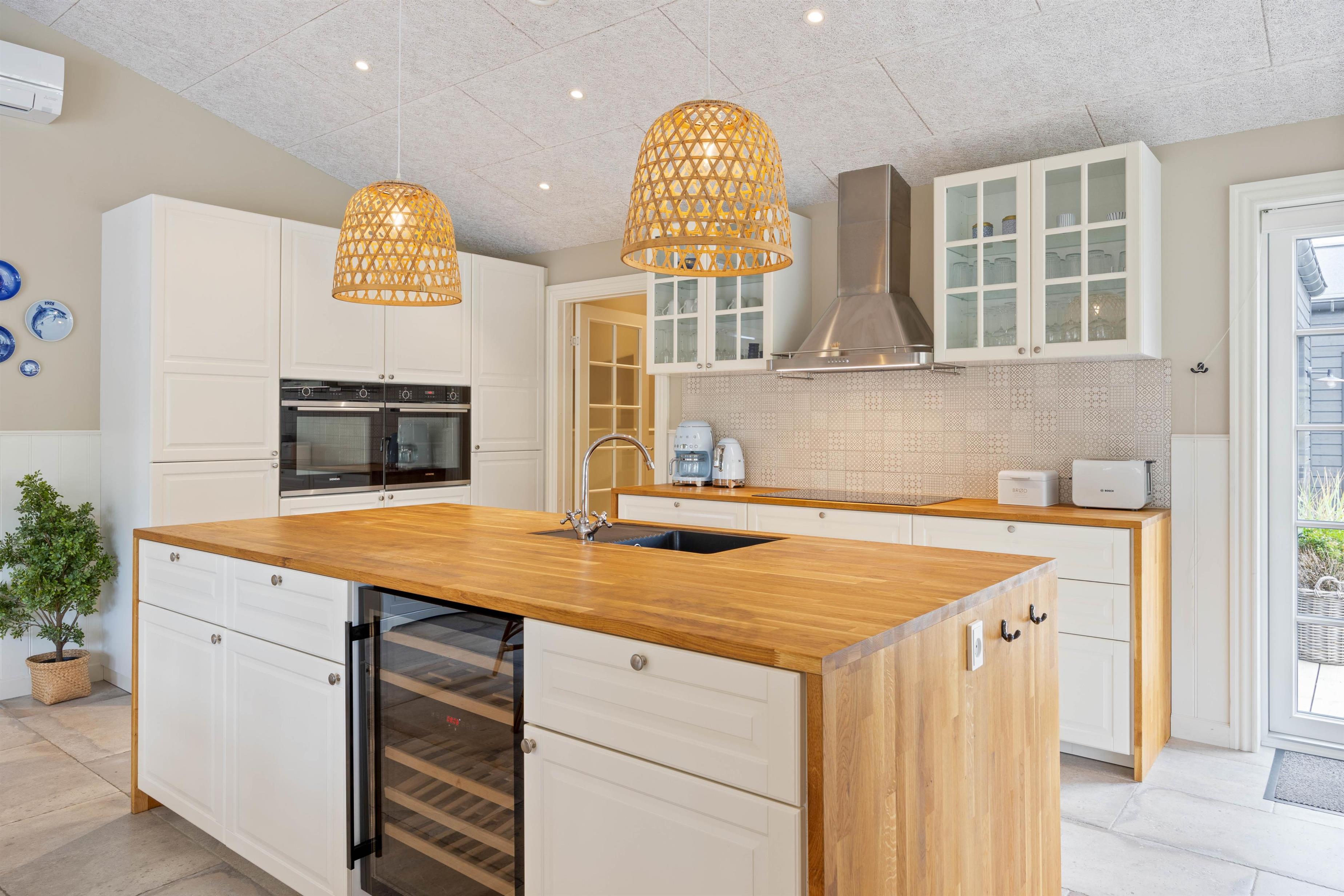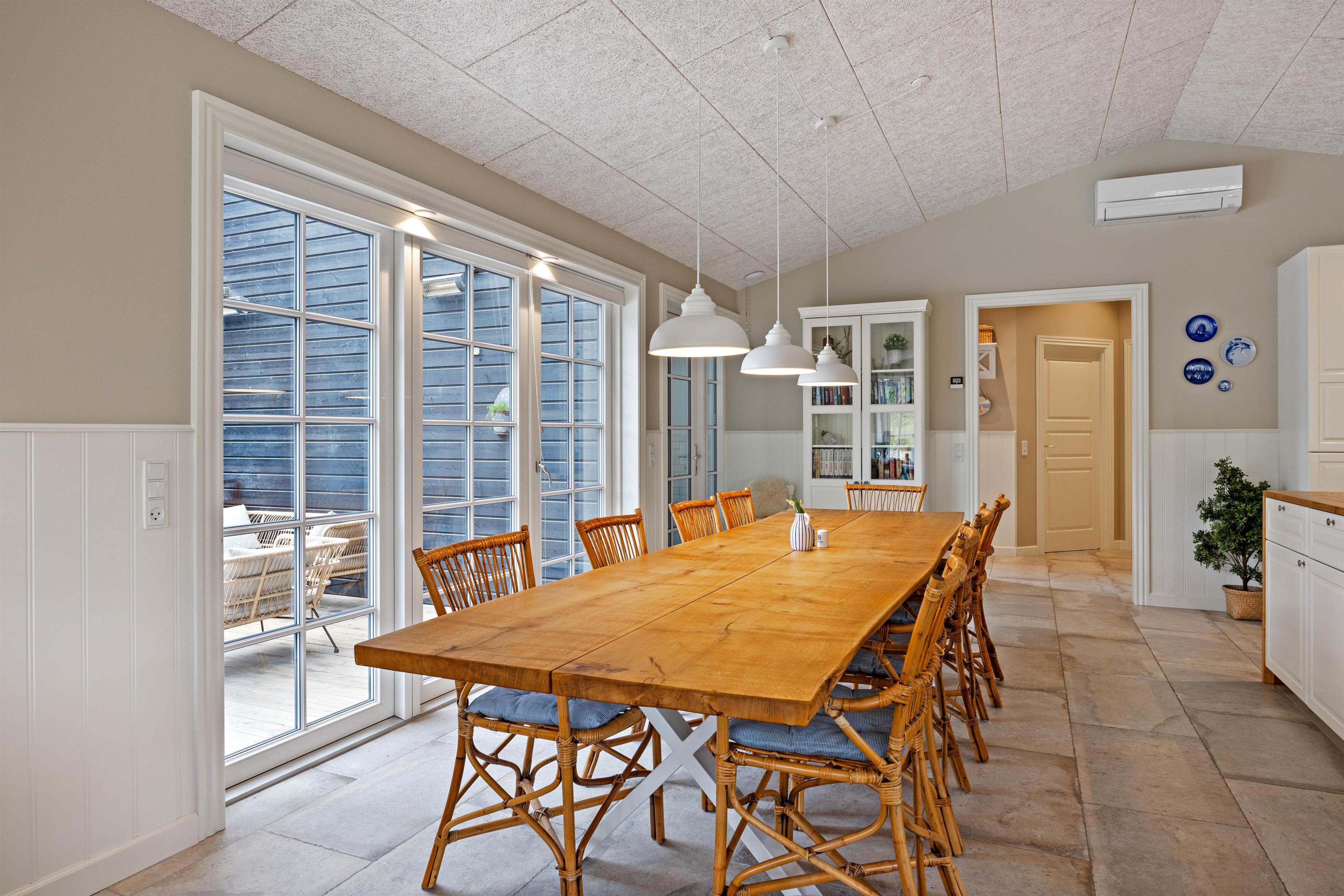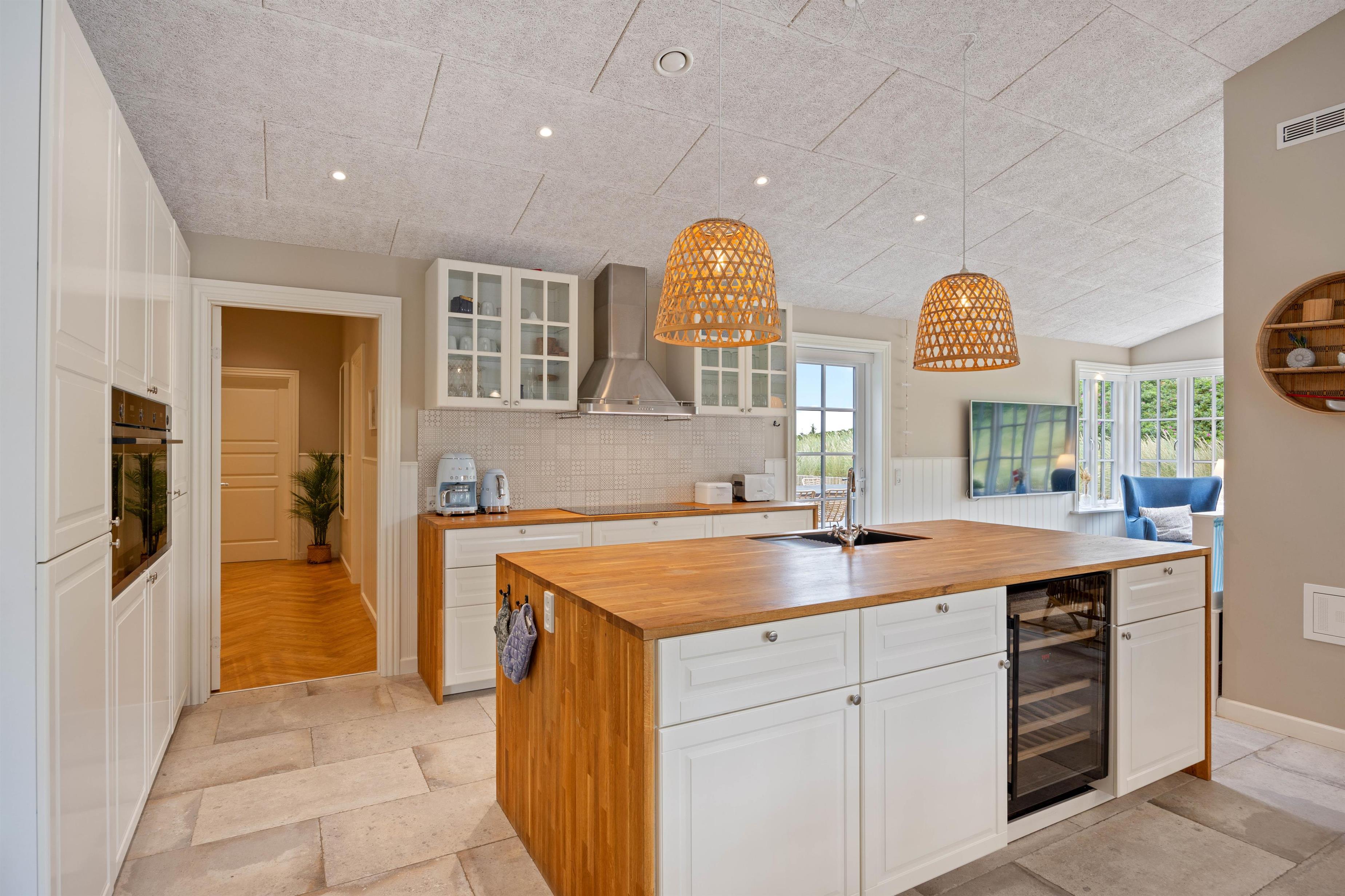 I dette rummelige sommerhus på 230 kvadratmeter er køkken/alrummet det naturlige mødested for feriehusets beboere. Her mødes man til dagens måltider – hvis ikke, de indtages ude på terrassen. Eller man slapper af med brætspil eller en TV-serie foran brændeovnen. Det fine lysindfald gennem de brede partier med sprossevinduer og de lyse, nordiske farver giver et varmt og inspirerende miljø. I det åbne køkken er alt, hvad I behøver for at fremstille de hjemmelavede og lækre måltider, som indtages ved spisebordet.