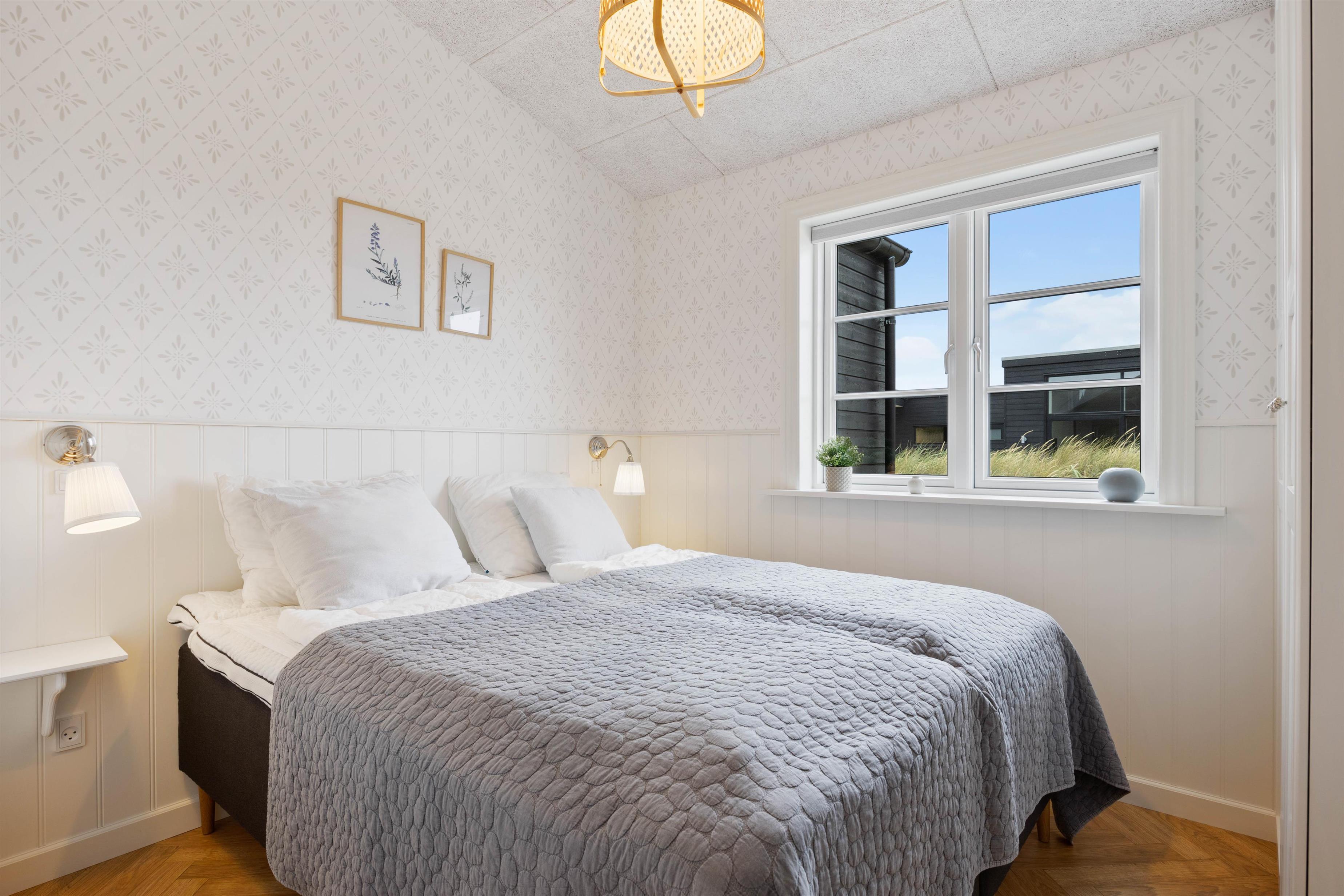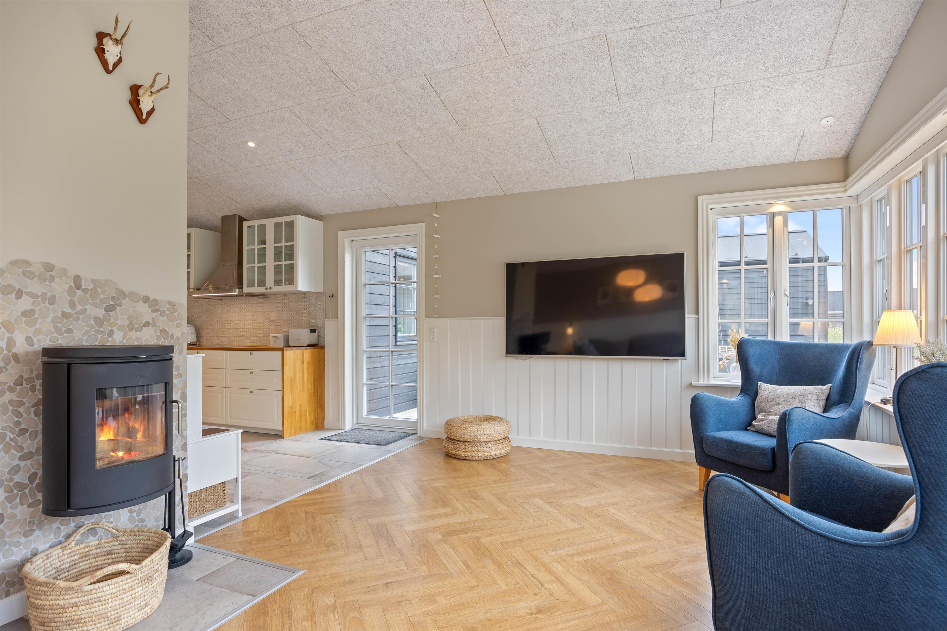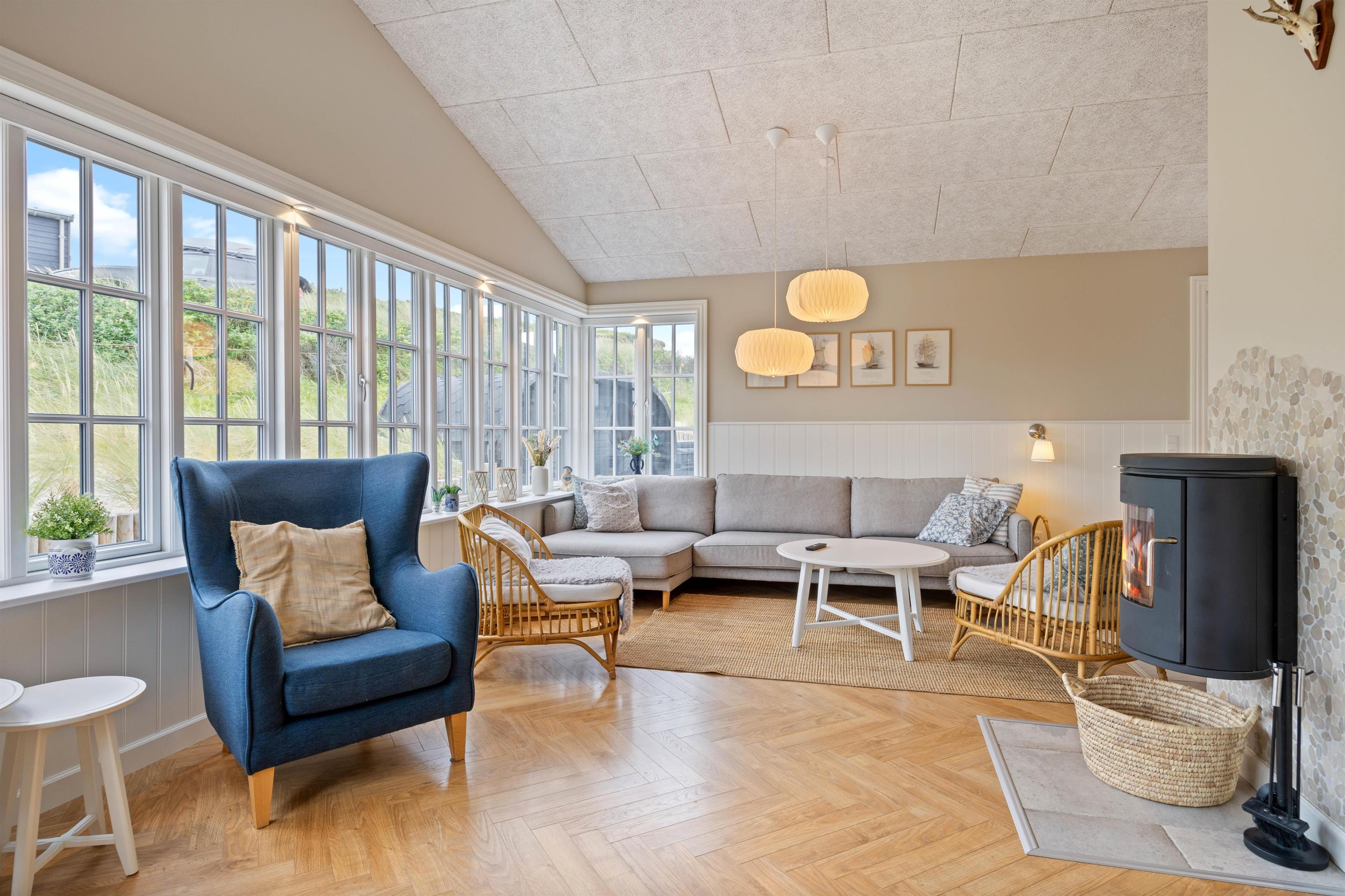 I dette rummelige sommerhus på 230 kvadratmeter er køkken/alrummet det naturlige mødested for feriehusets beboere. Her mødes man til dagens måltider – hvis ikke, de indtages ude på terrassen. Eller man slapper af med brætspil eller en TV-serie foran brændeovnen. Det fine lysindfald gennem de brede partier med sprossevinduer og de lyse, nordiske farver giver et varmt og inspirerende miljø. I det åbne køkken er alt, hvad I behøver for at fremstille de hjemmelavede og lækre måltider, som indtages ved spisebordet.