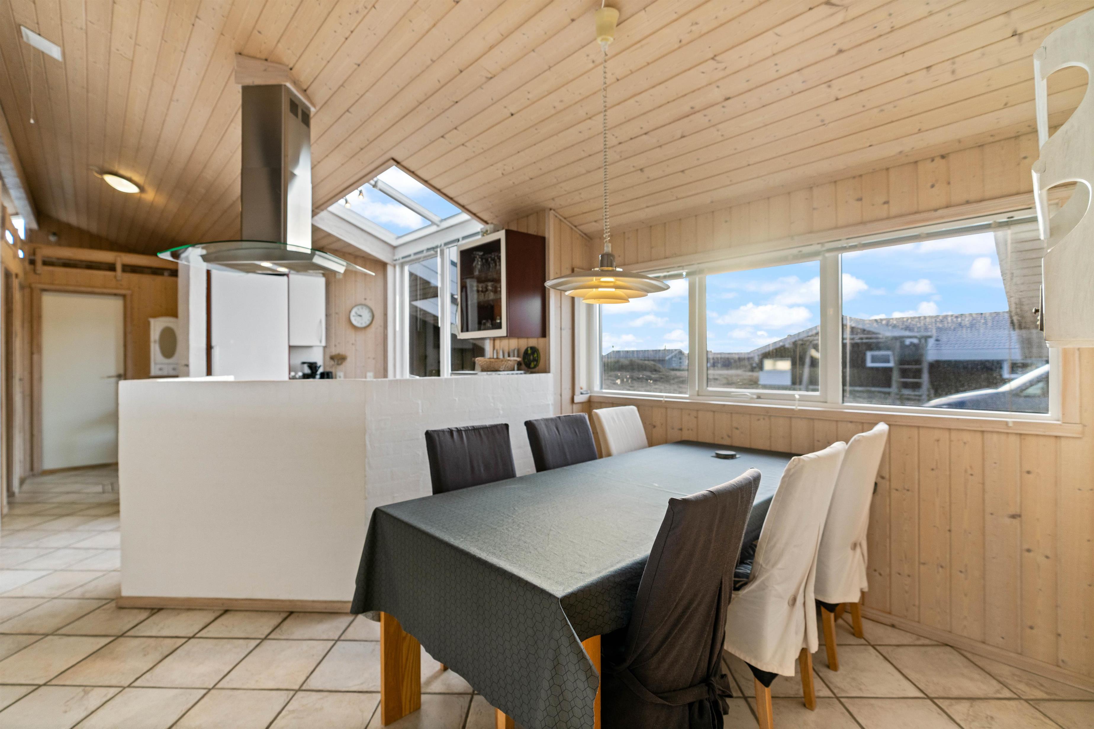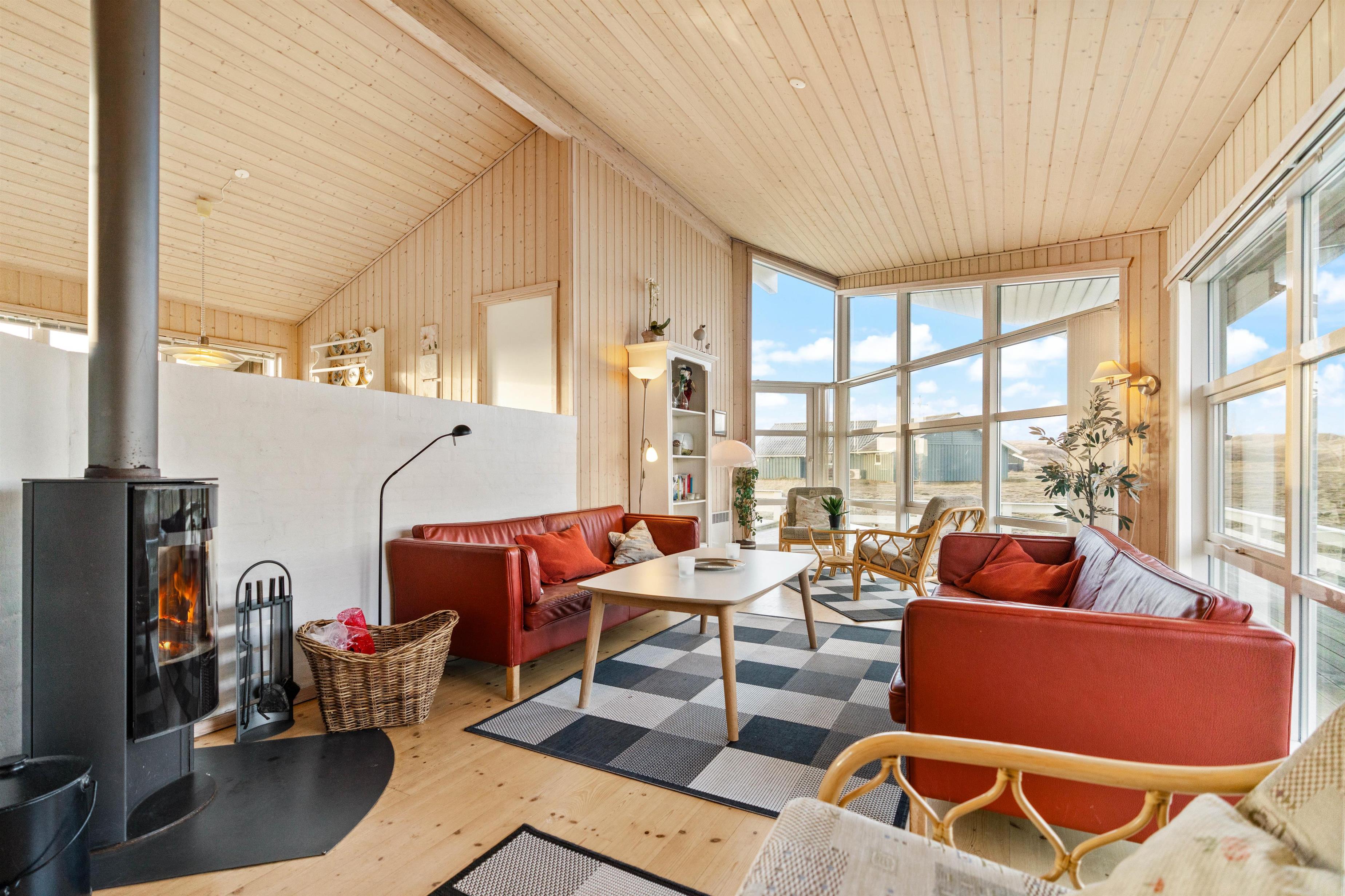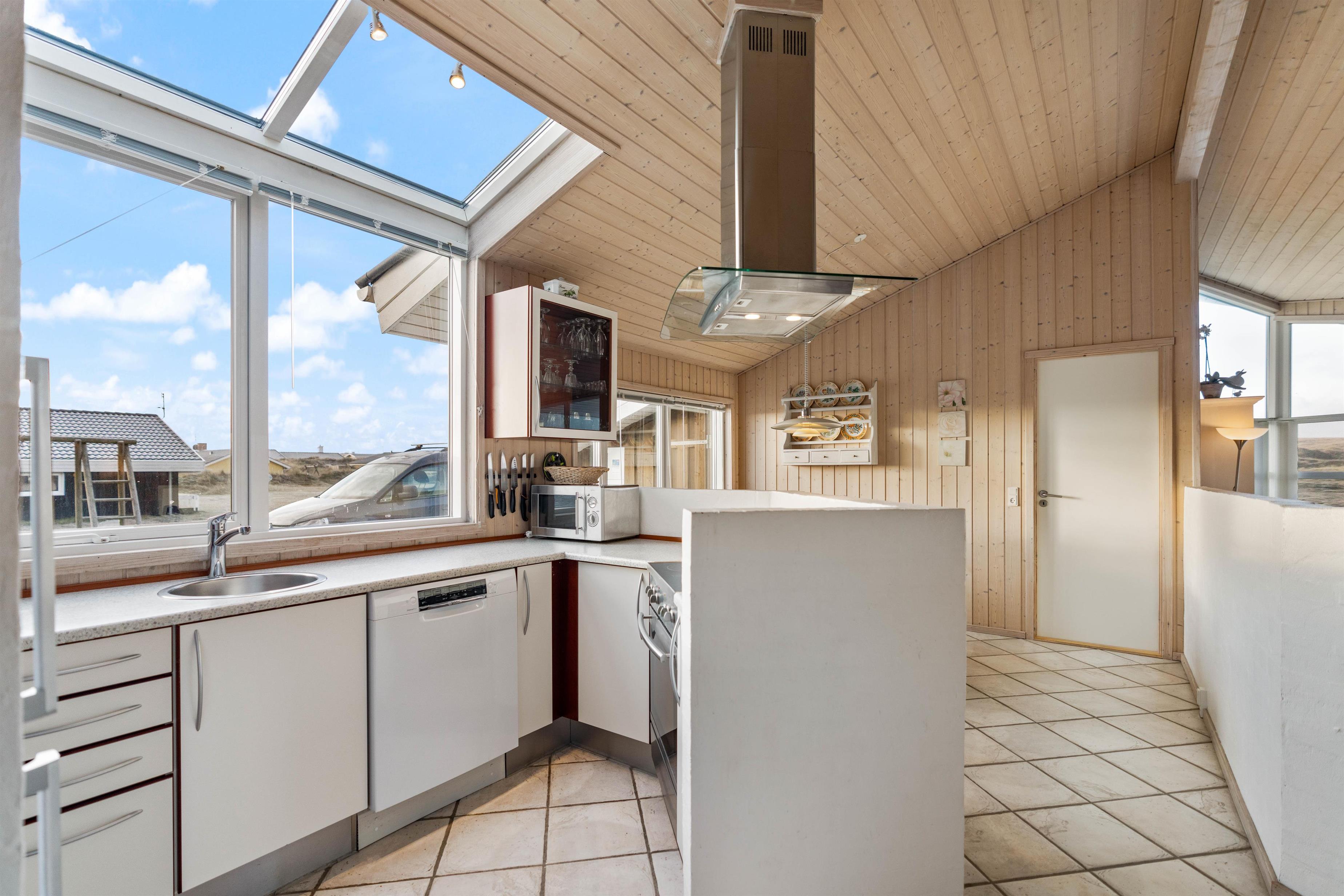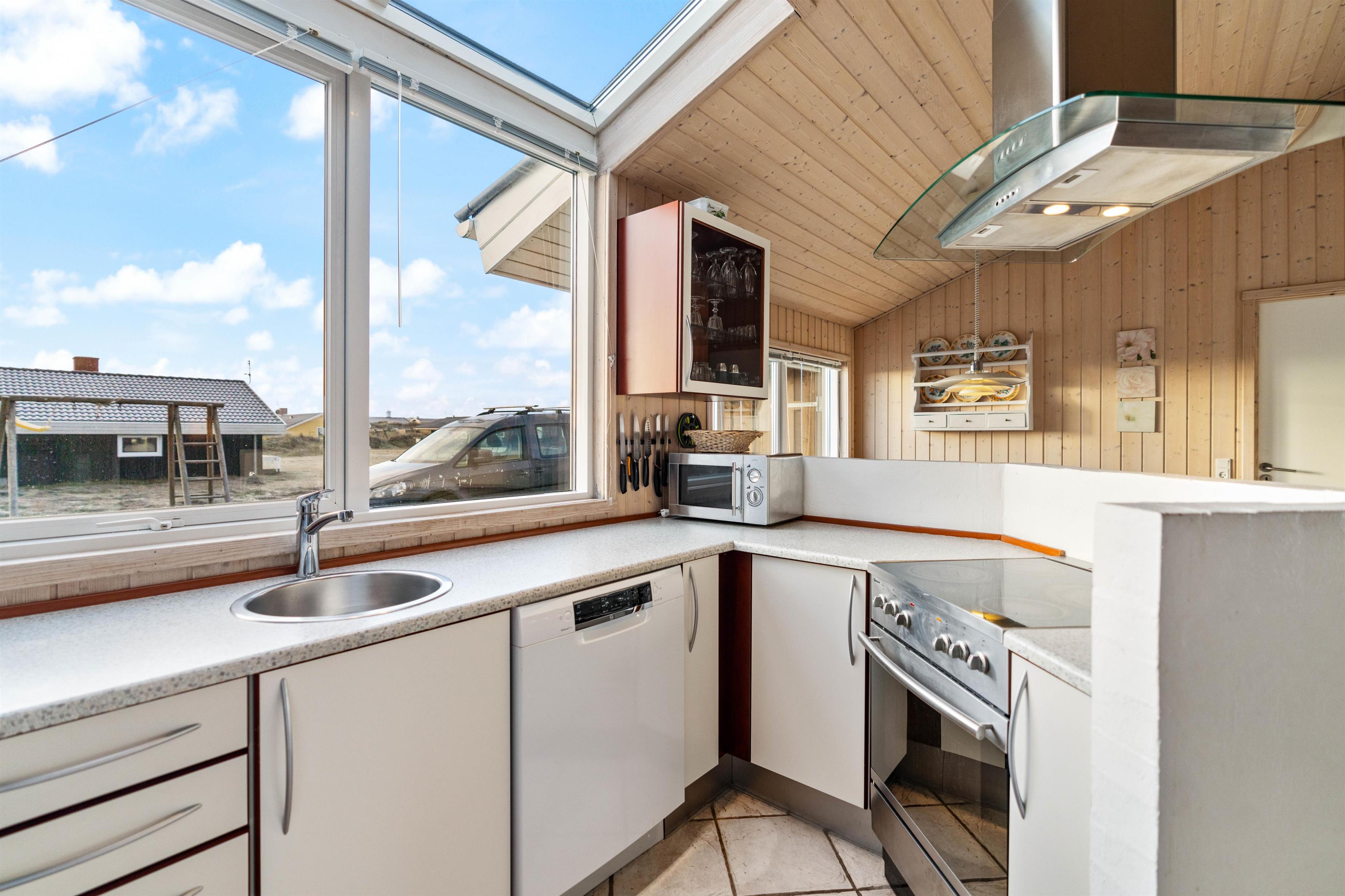 Køkkenet er i åben forbindelse med spiseområde. Fra spiseområdet kommer du via et par trin ned i den hyggelige, forsænkede stue. Stuen er pænt indrettet med en hyggelig brændeovn, og herfra kan du nyde den flotte udsigt over heden til klitterne. Sommerhuset er desuden udstyret med gratis trådløst internet og en energibesparende varmepumpe.
