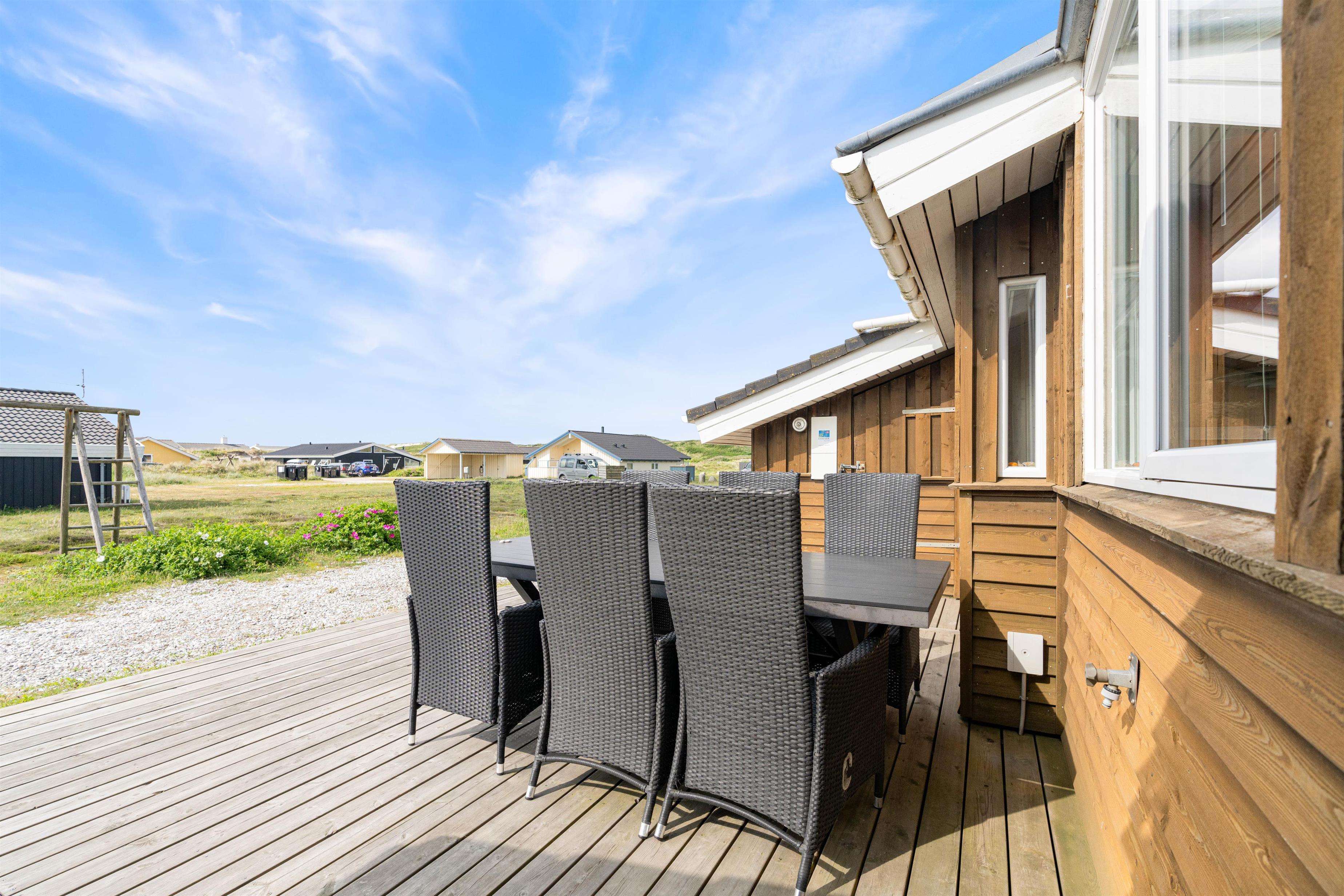 Det rummelige sommerhus er omgivet af en stor terrasse, der er udstyret med havemøbler, liggestole og grill. Her er en vidunderlig fred og ro samt udsigt over den vidstrakte hede og til klitterne.