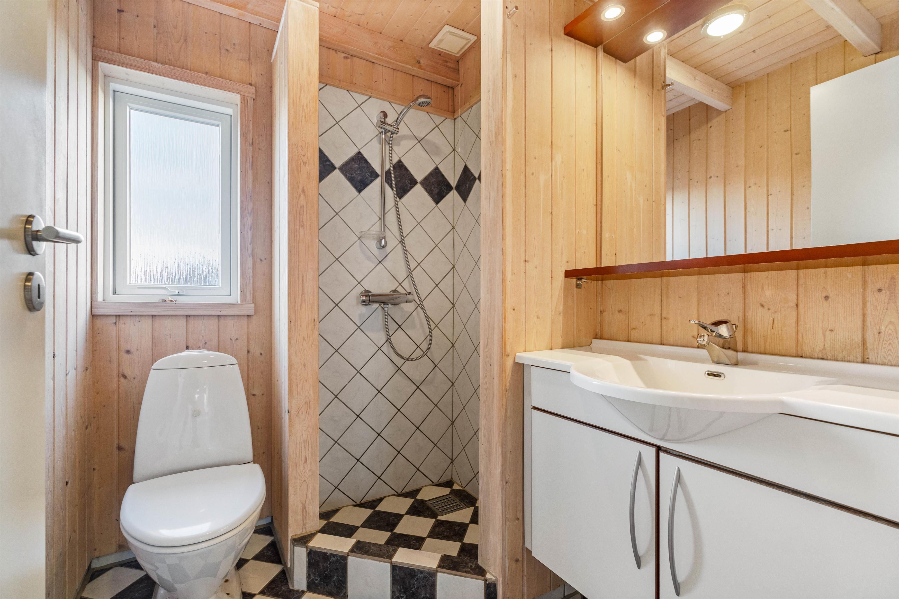 Badeværelset med gulvvarme har spa og adgang til feriehusets sauna. Her er der virkelig lagt op til afslapning og velvære efter en oplevelsesrig feriedag med familien. Desuden er der gæstetoilet med bruseniche. Feriehuset råder også over en vaskemaskine samt tørretumbler, hvilket særligt er praktisk med små børn, så I altid kan have rent og tørt tøj til rådighed.