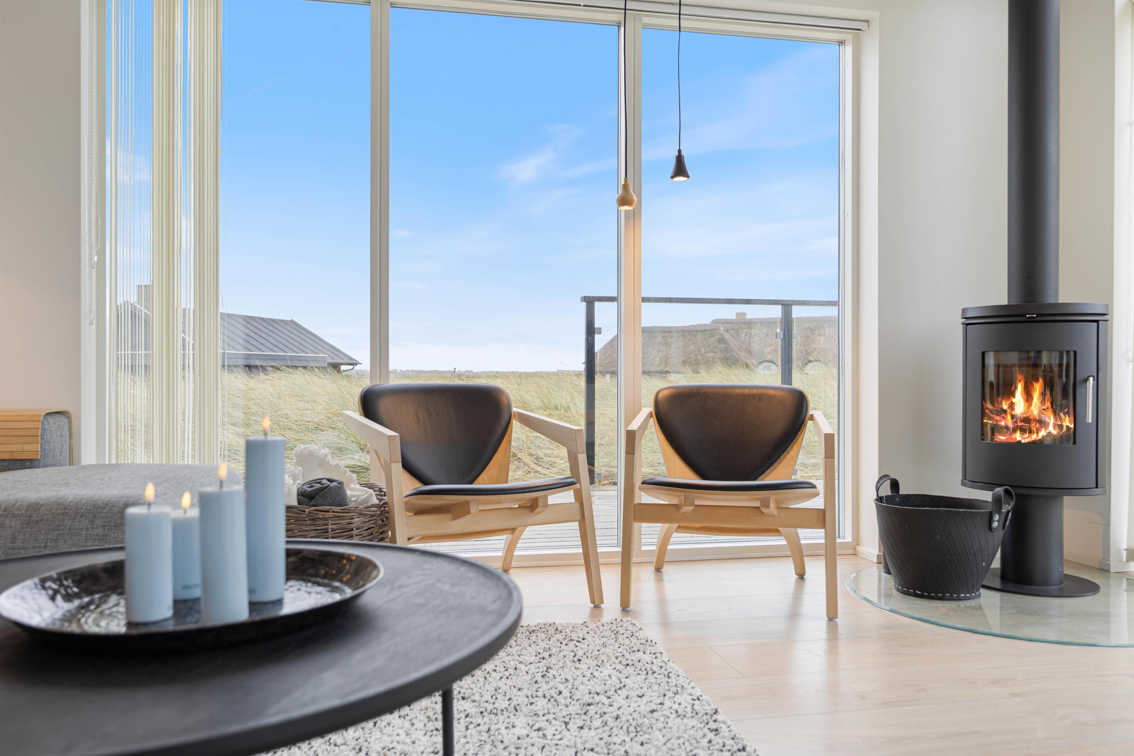 Når du bor i første klitrække, som i dette sommerhus, bliver du nærmest ét med naturen. De bølgende marehalmsklædte klitter og det fredede hedeareal mod syd er ren helse for sjælen. Og du har næsten altid mulighed for at opholde dig på terrassen, idet den strækker sig hele vejen rundt om feriehuset. Fra terrassen er både duften og lyden af Vesterhavet en vanedannende oplevelse – ikke mærkeligt, at mange vender tilbage hertil år efter år.