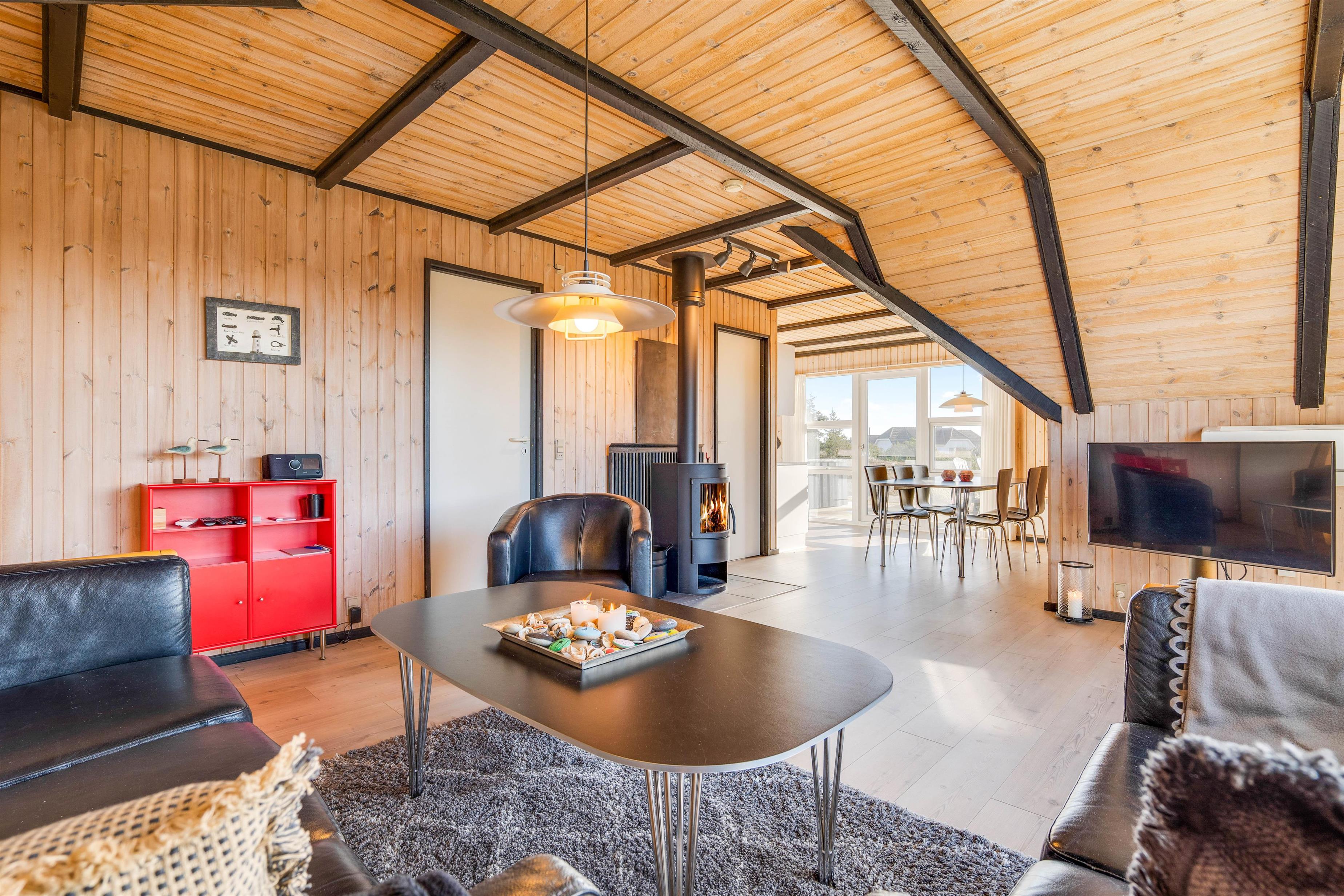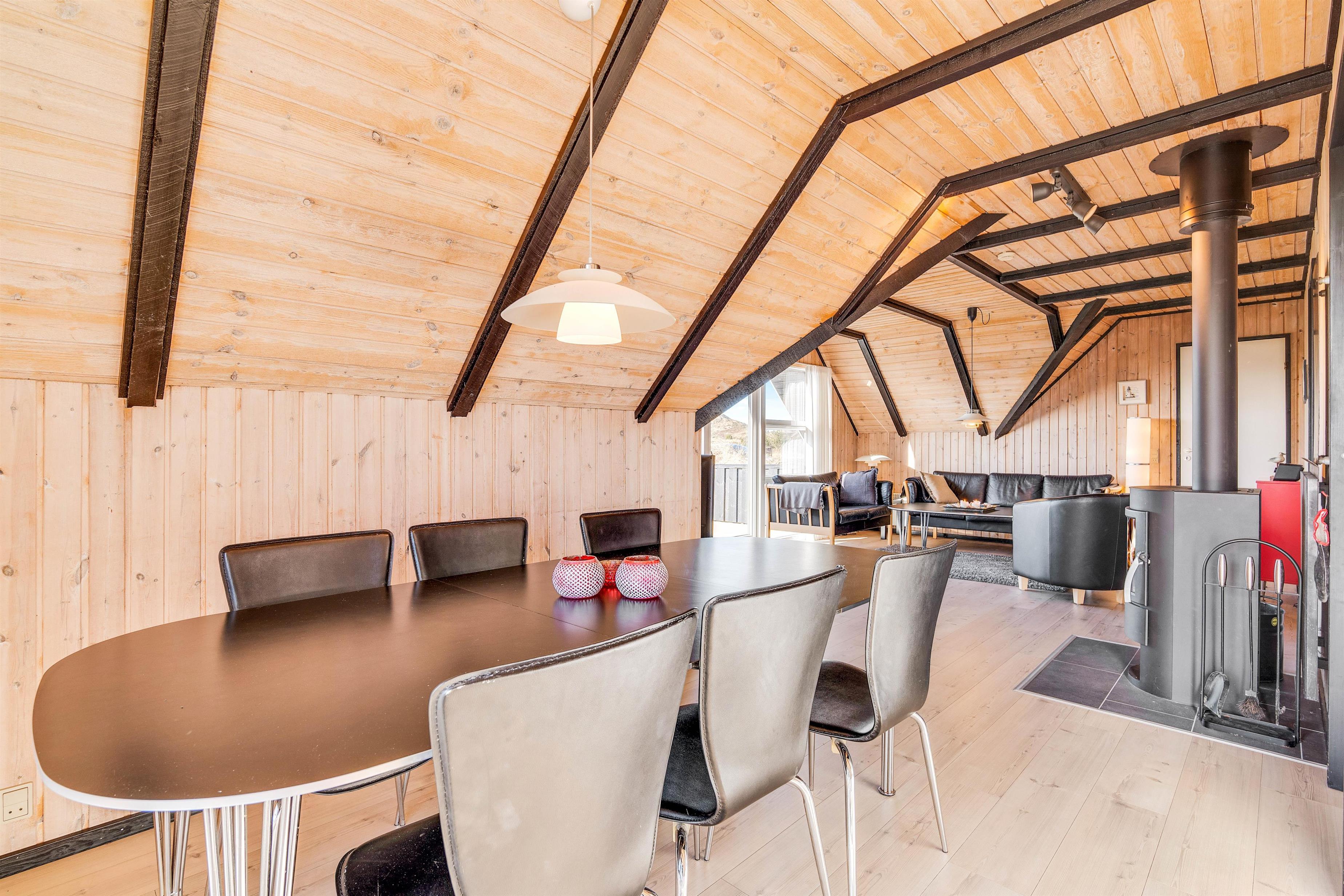Feriehusets hjerte er helt sikkert den åbne køkken/stue-afdeling med brændeovnen godt placeret i midten. Her er lyse trælaminatgulve og rustikke trævægge og lofter. Fra stuen er der udgang til en dejlig vestvendt terrasse, og fra køkkenet er der udgang til lækker sydvendt terrasse.