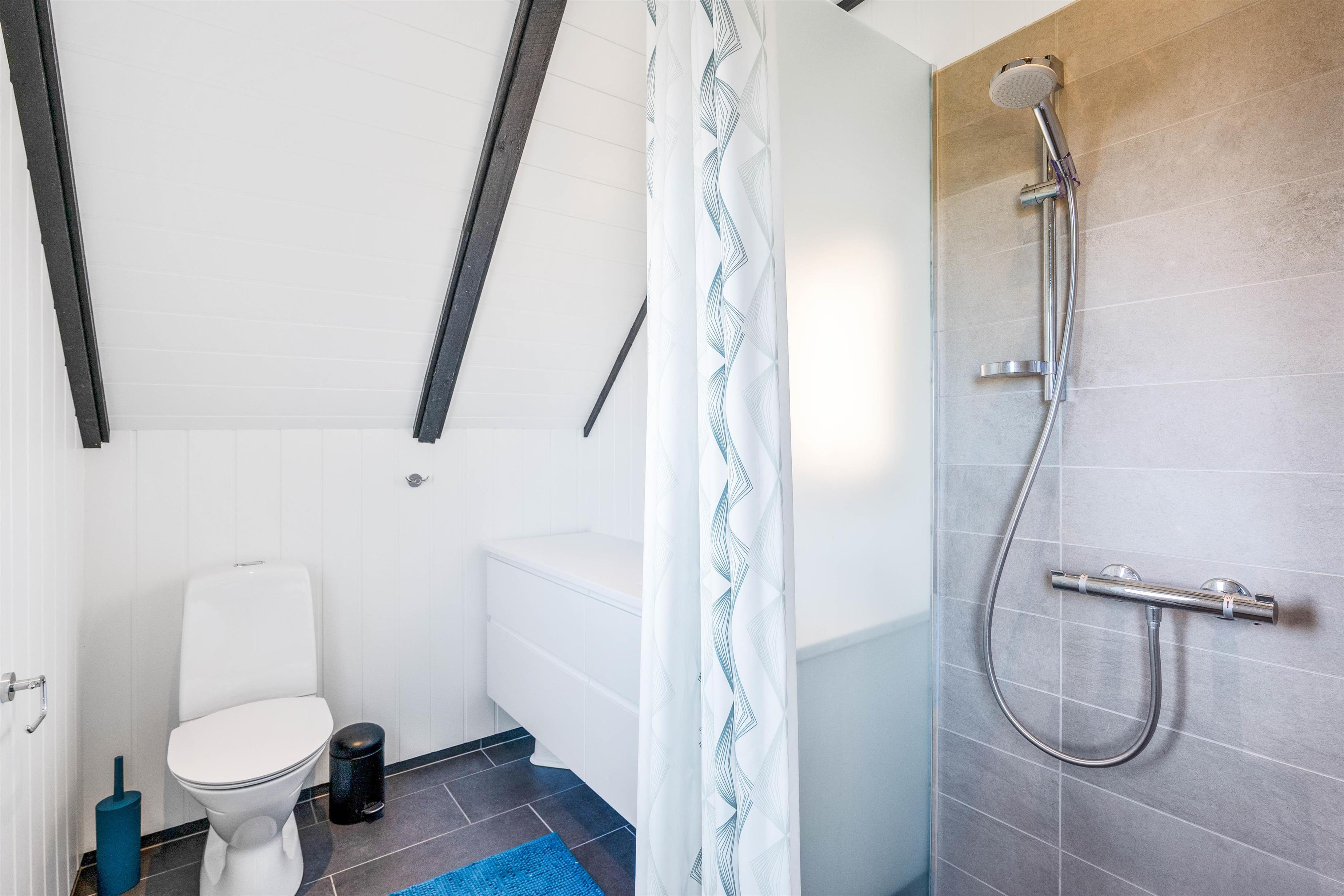 Det lyse og moderne indrettede badeværelse har flotte vægfliser i brusenichen samt på gulvet, hvor der også er behagelig gulvvarme til de lidt koldere morgener.
