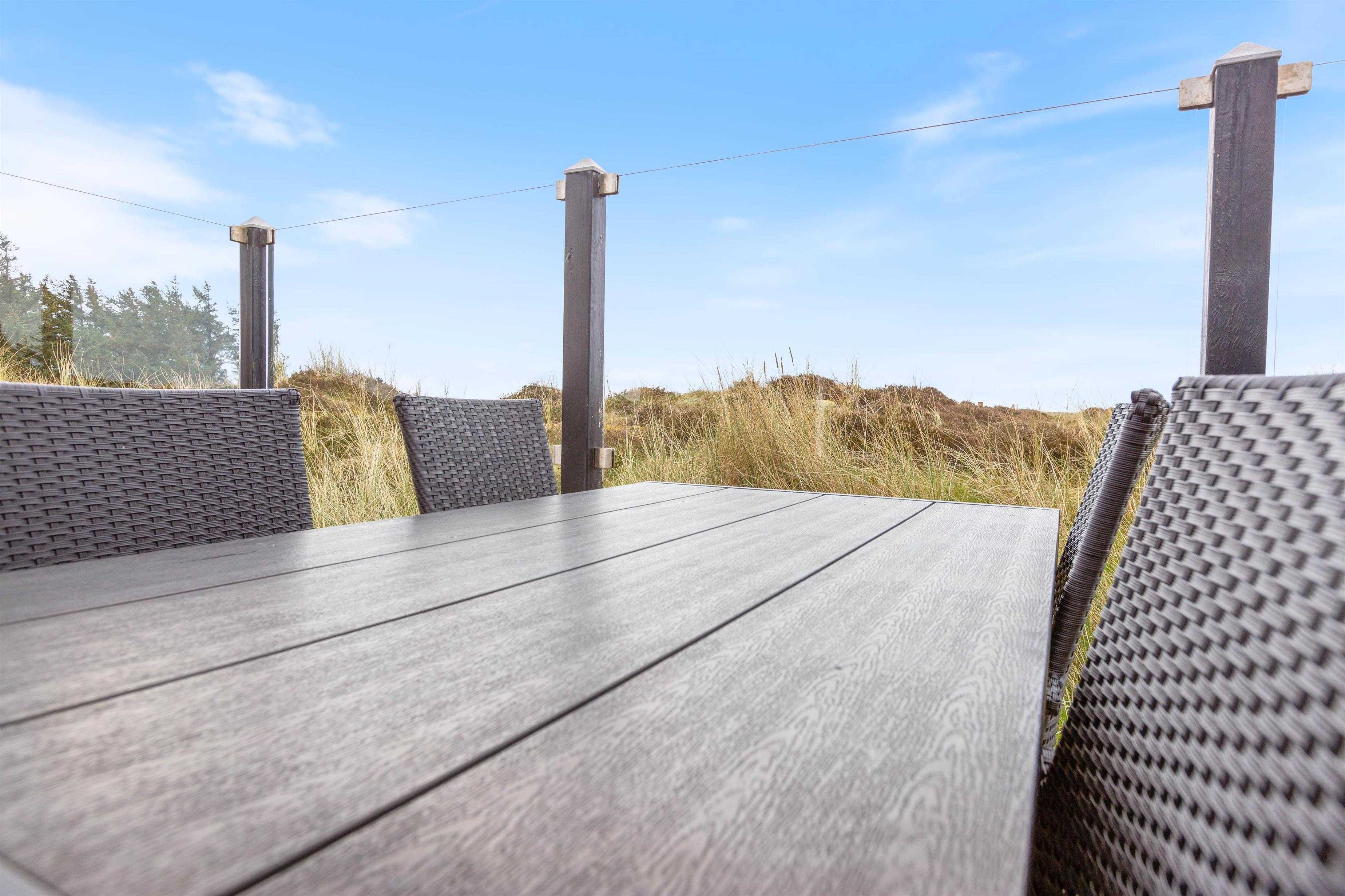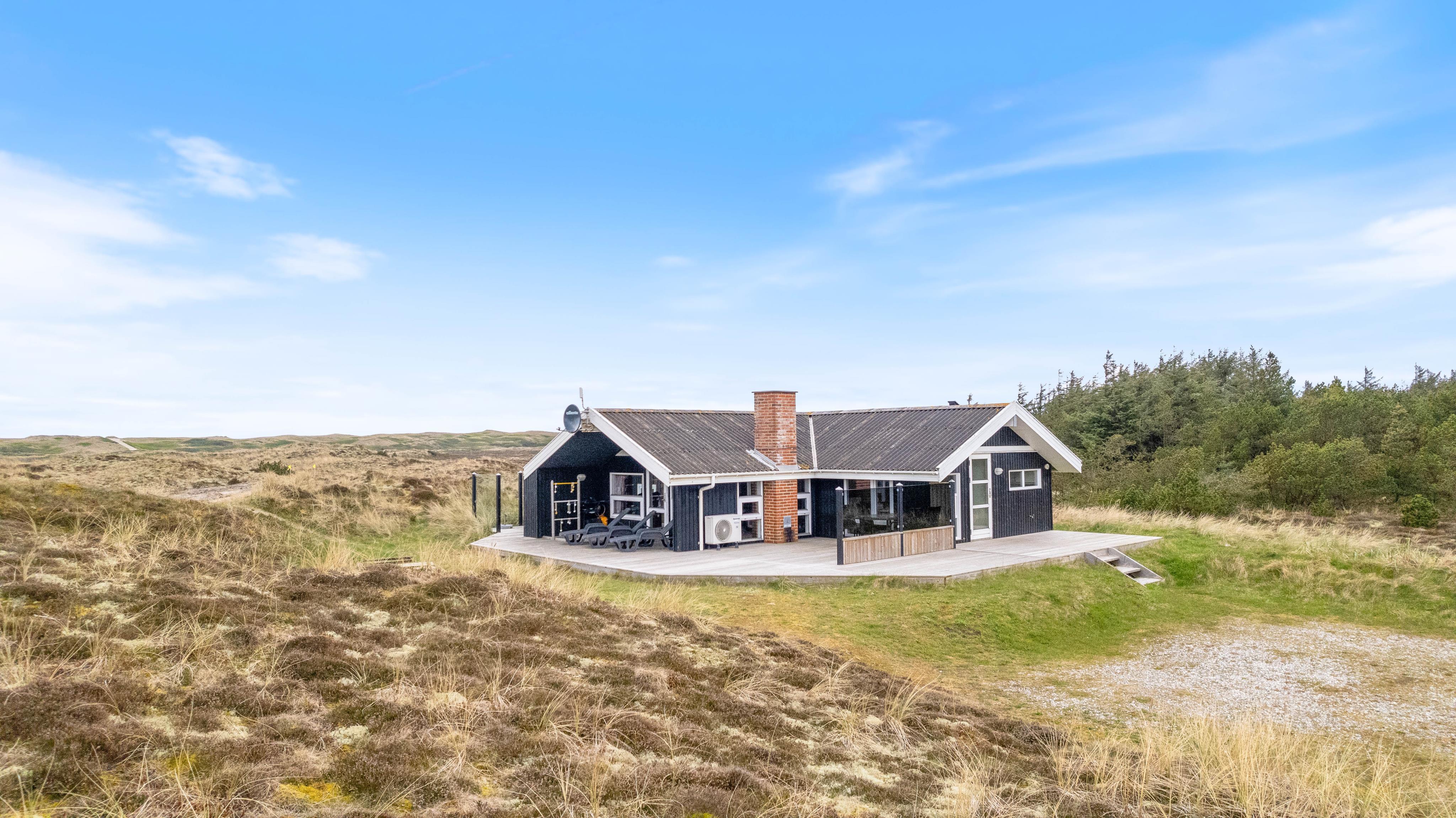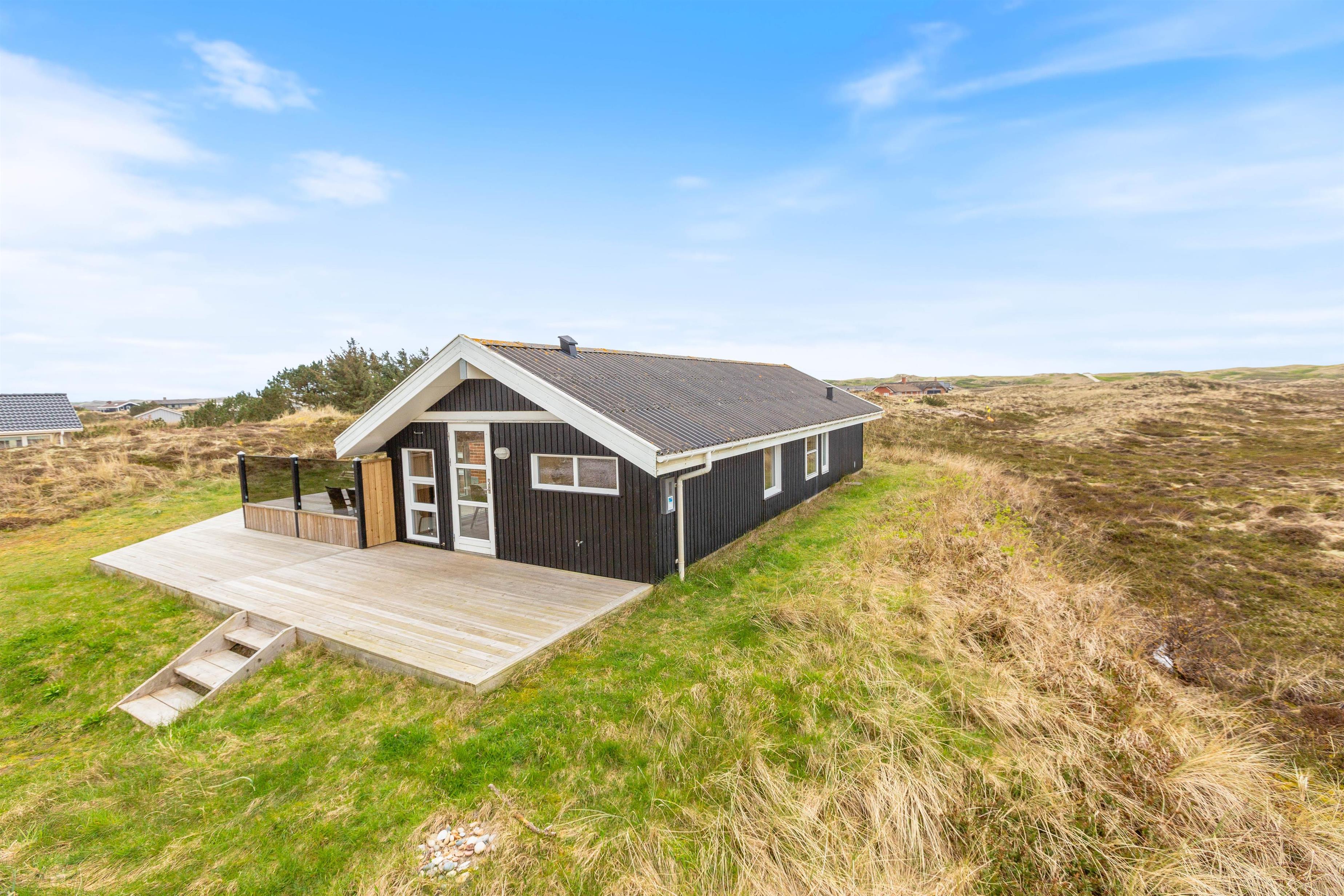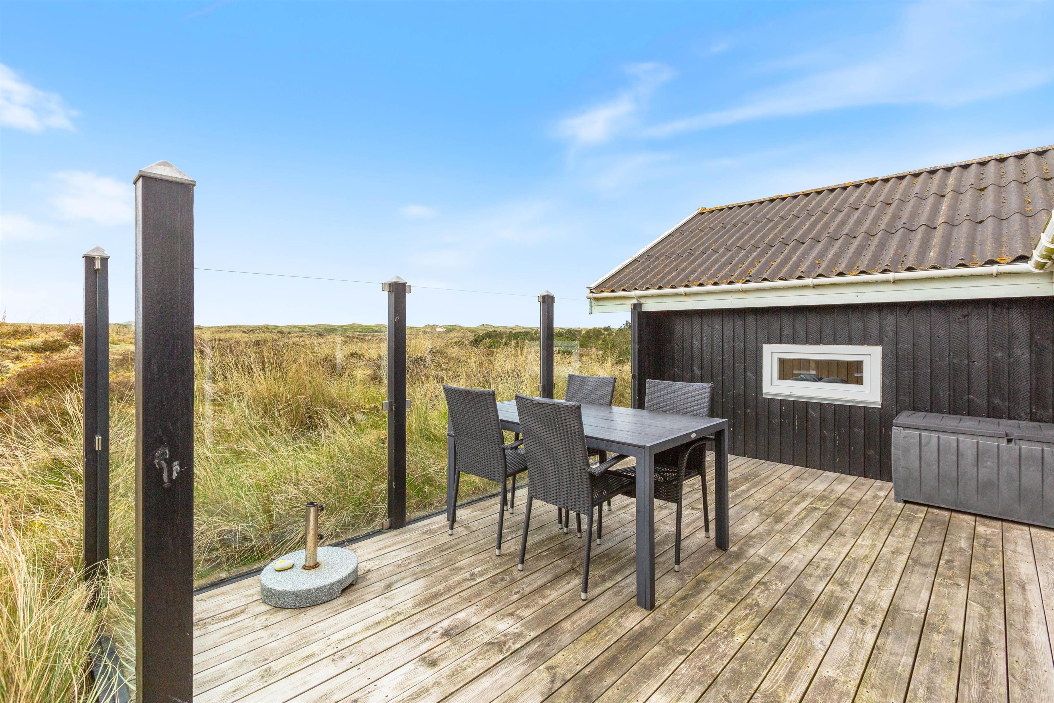 Feriehuset har en helt fantastisk beliggenhed på en naturgrund i Bjerregård. Rundt om sommerhuset går en stor, åben træterrasse med afskærmning på den ene side, og dagen lang kan I følge solen rundt og nyde det gode vejr og den smukke udsigt til klitlandskabet.