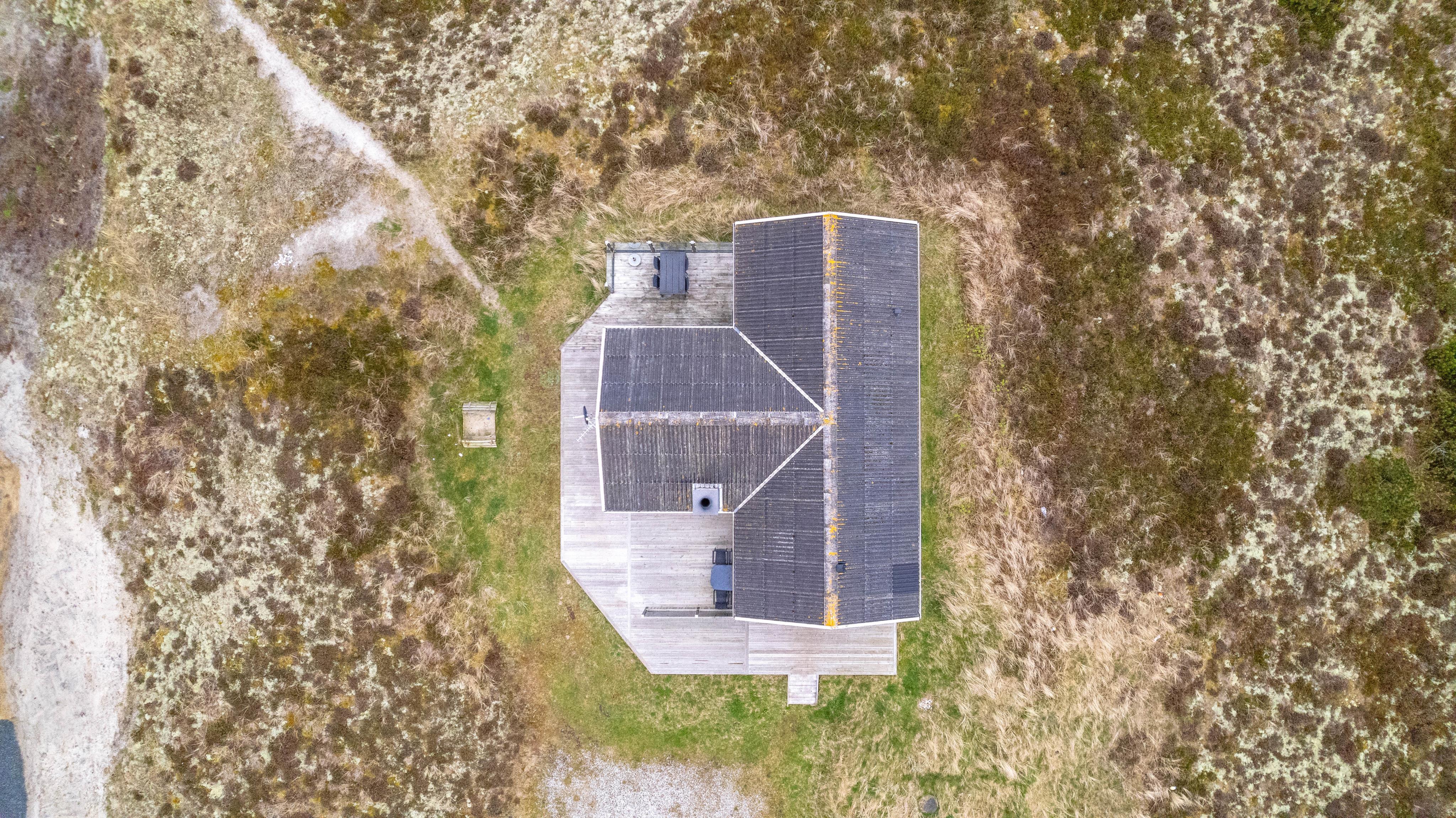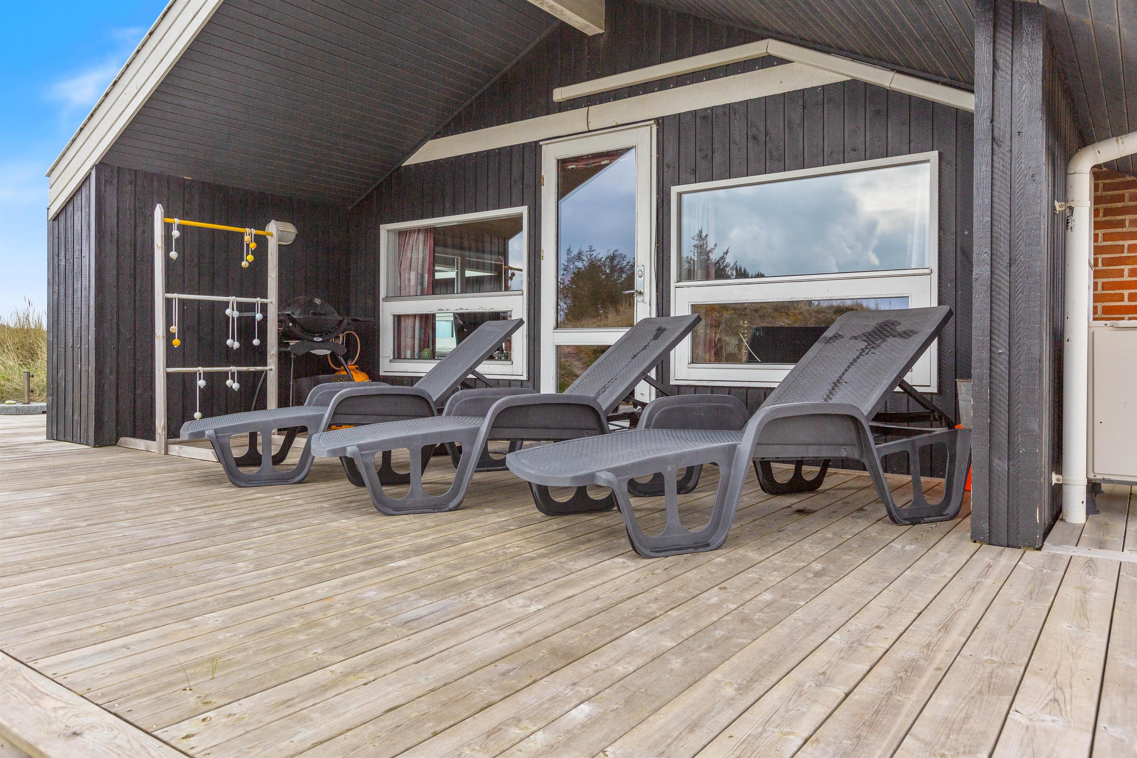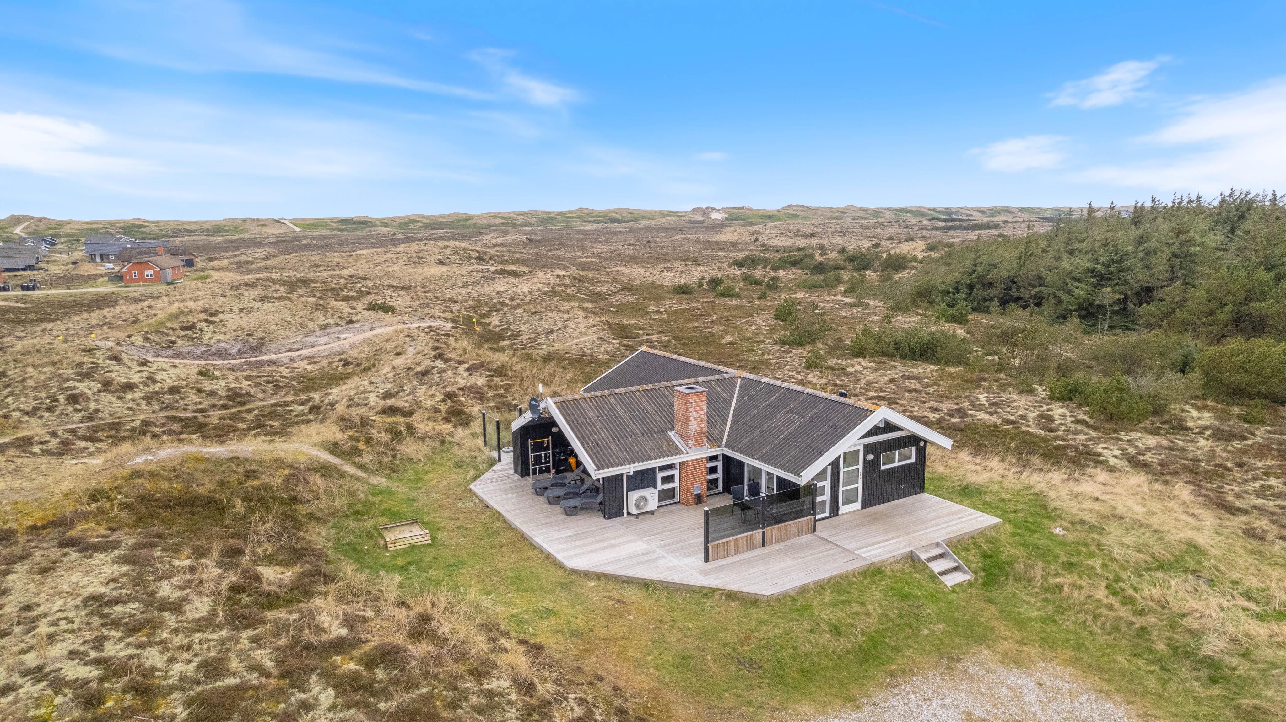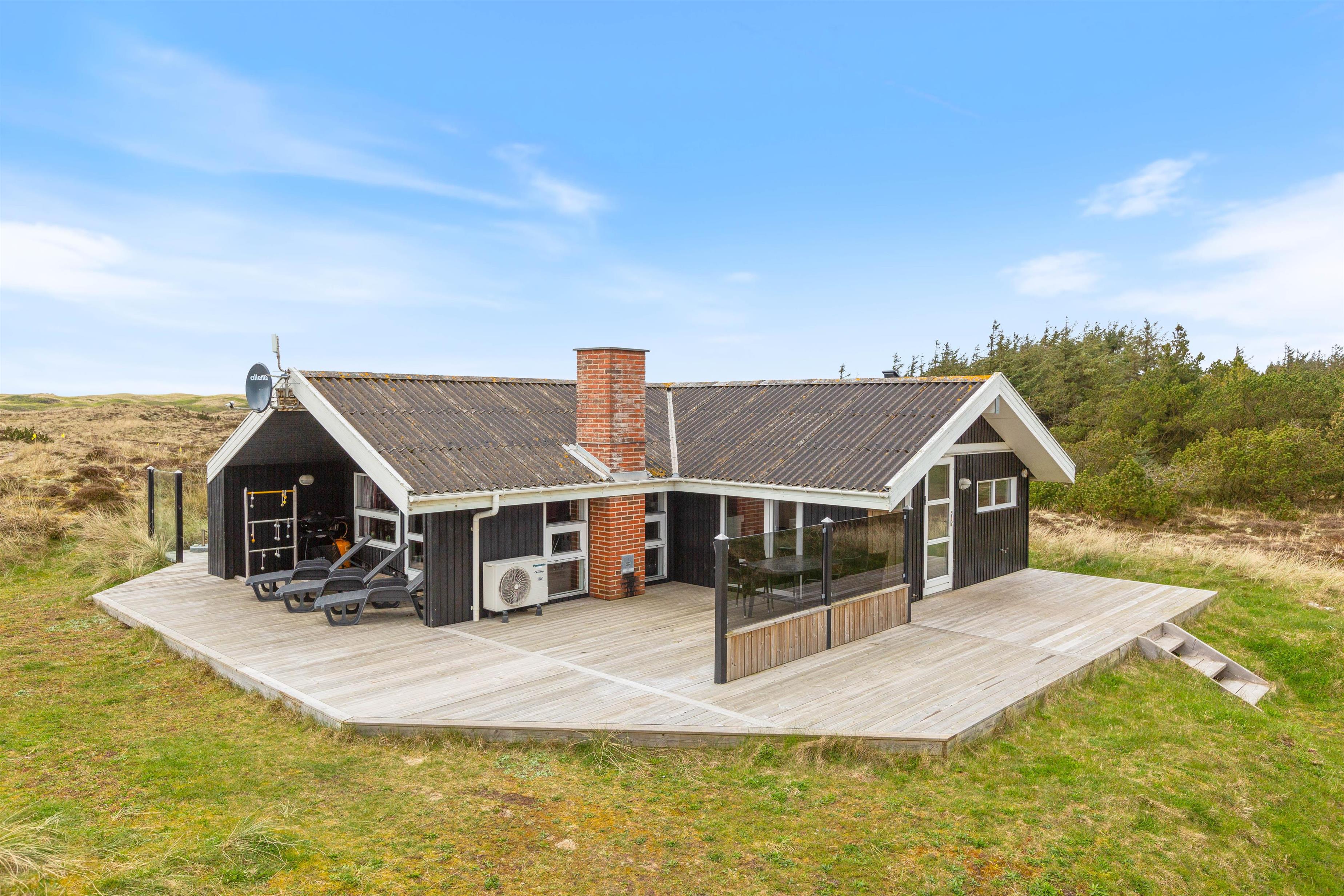 Feriehuset har en helt fantastisk beliggenhed på en naturgrund i Bjerregård. Rundt om sommerhuset går en stor, åben træterrasse med afskærmning på den ene side, og dagen lang kan I følge solen rundt og nyde det gode vejr og den smukke udsigt til klitlandskabet.