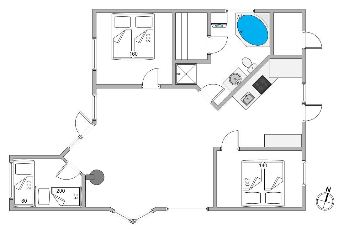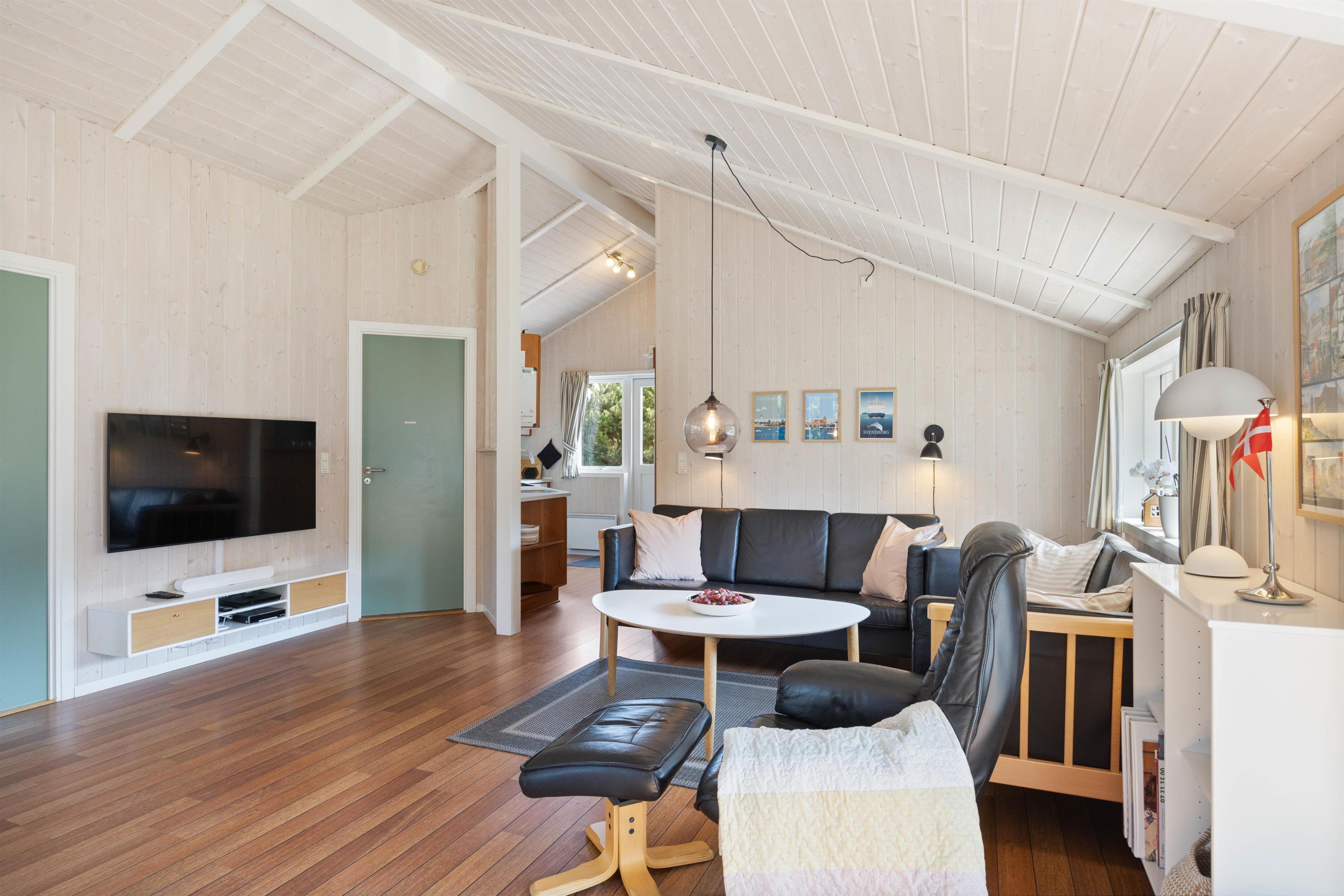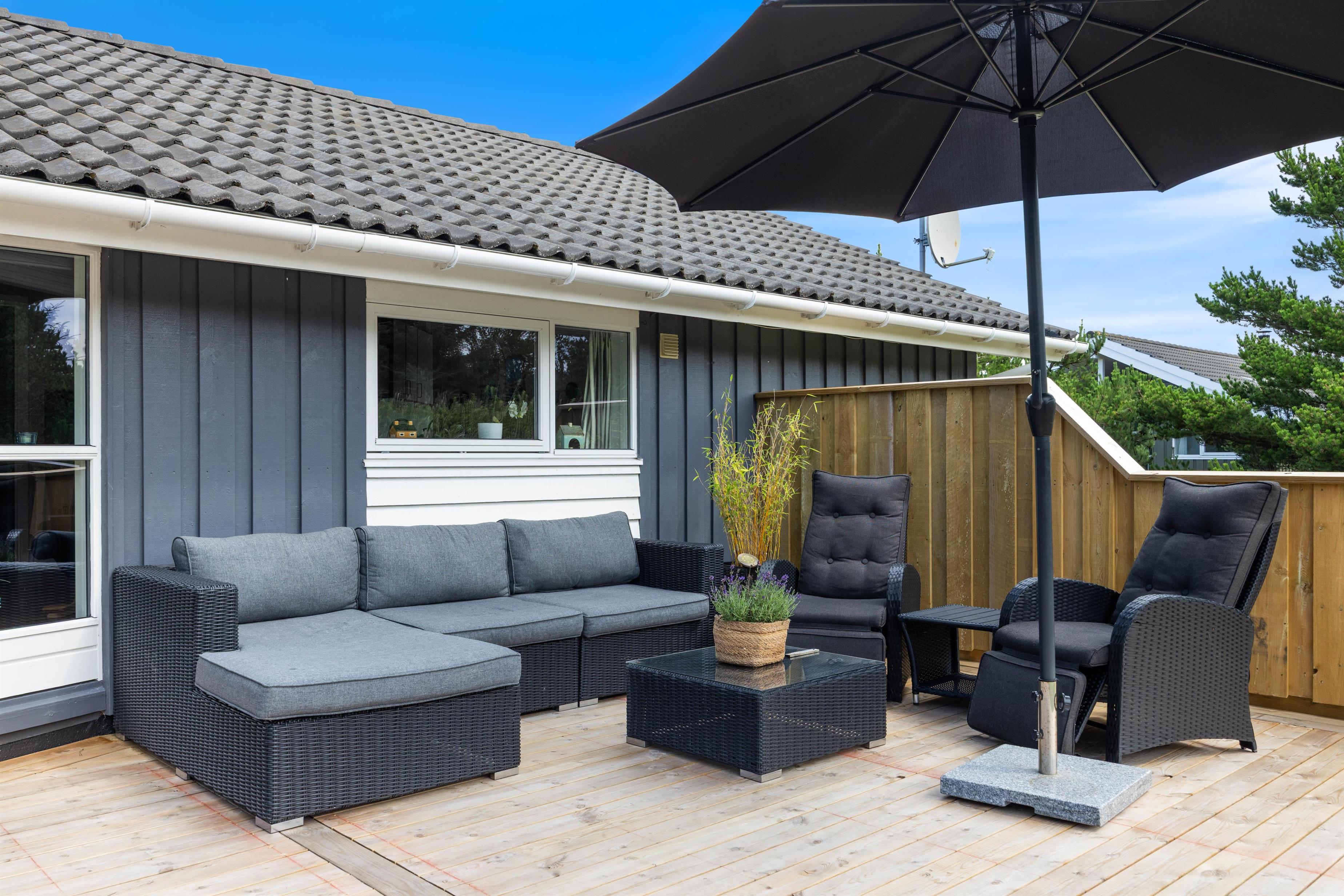 Sommerhuset står på en naturgrund og er omgivet af terrasser på 3 sider, så du kan følge solen hele vejen rundt om feriehuset – fra morgenmaden på den østvendte terrasse til aftensmaden på den delvist overdækkede terrasse mod vest. Her er selvfølgelig havemøbler, liggestole og grill, så I rigtig kan slappe af og nyde ferien.