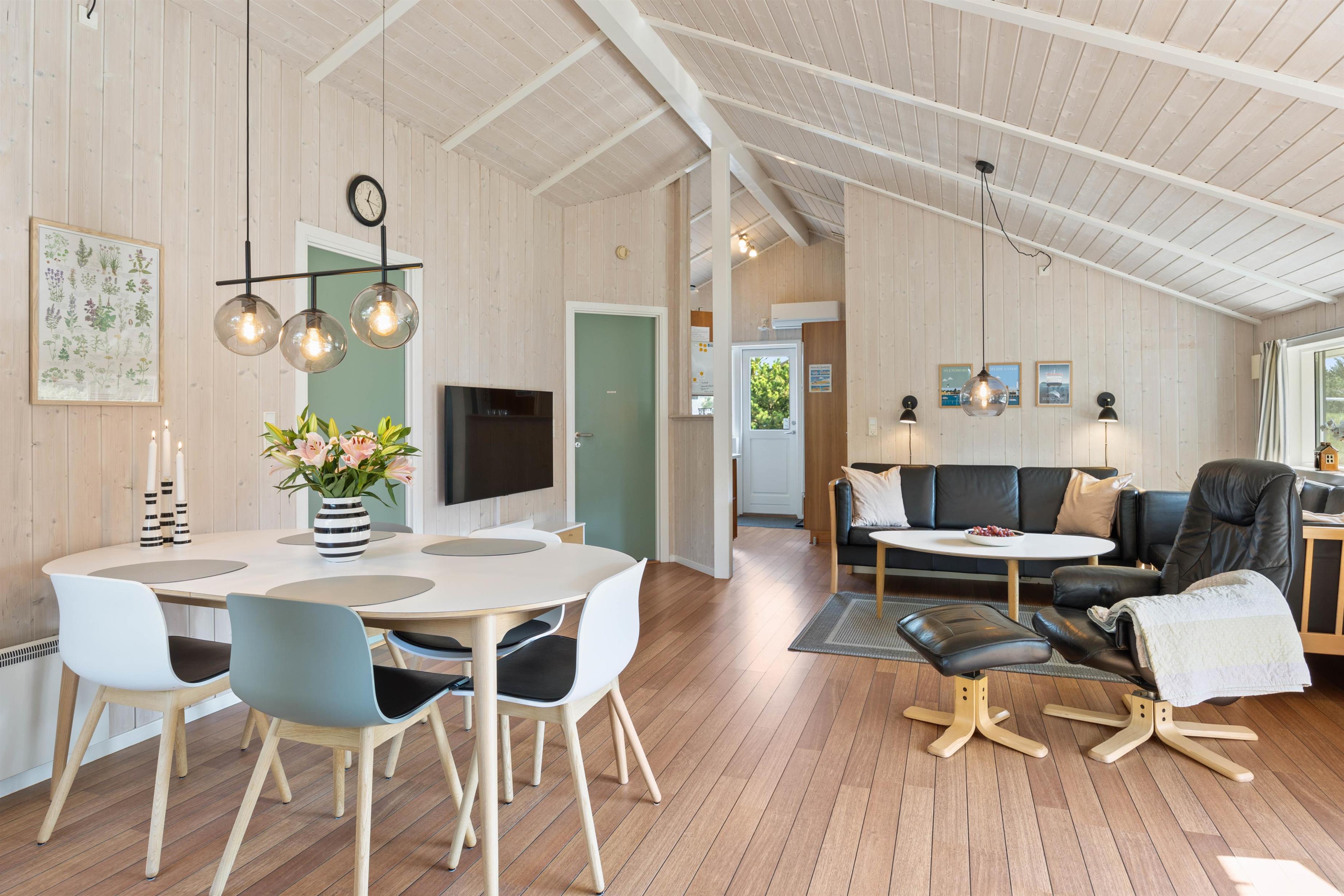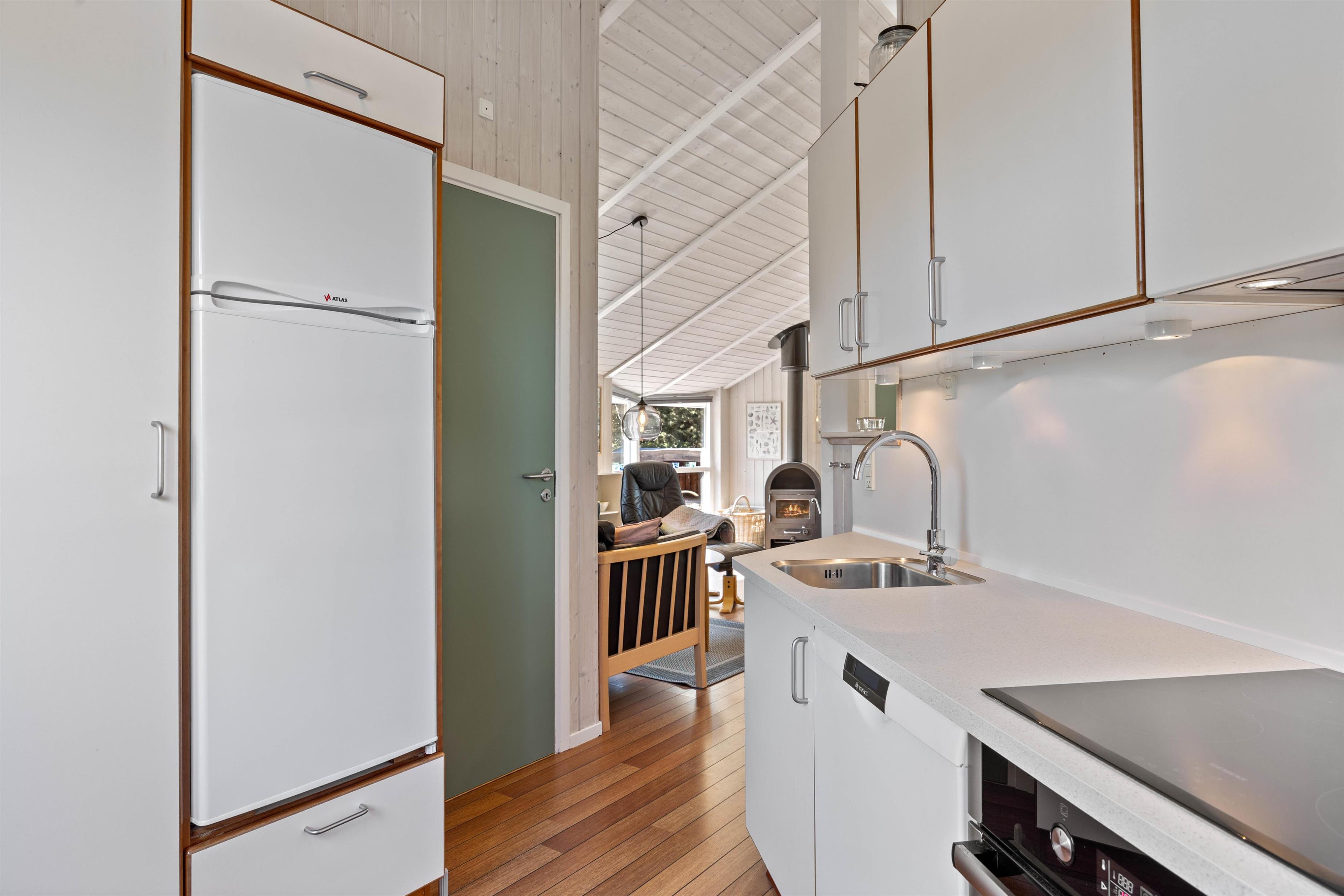 Sommerhusets indretning er hyggelig, og der mangler ikke noget. Køkkenet er særdeles veludstyret og står i åben forbindelse med den dejlige og flot møblerede stue med åben til kip.