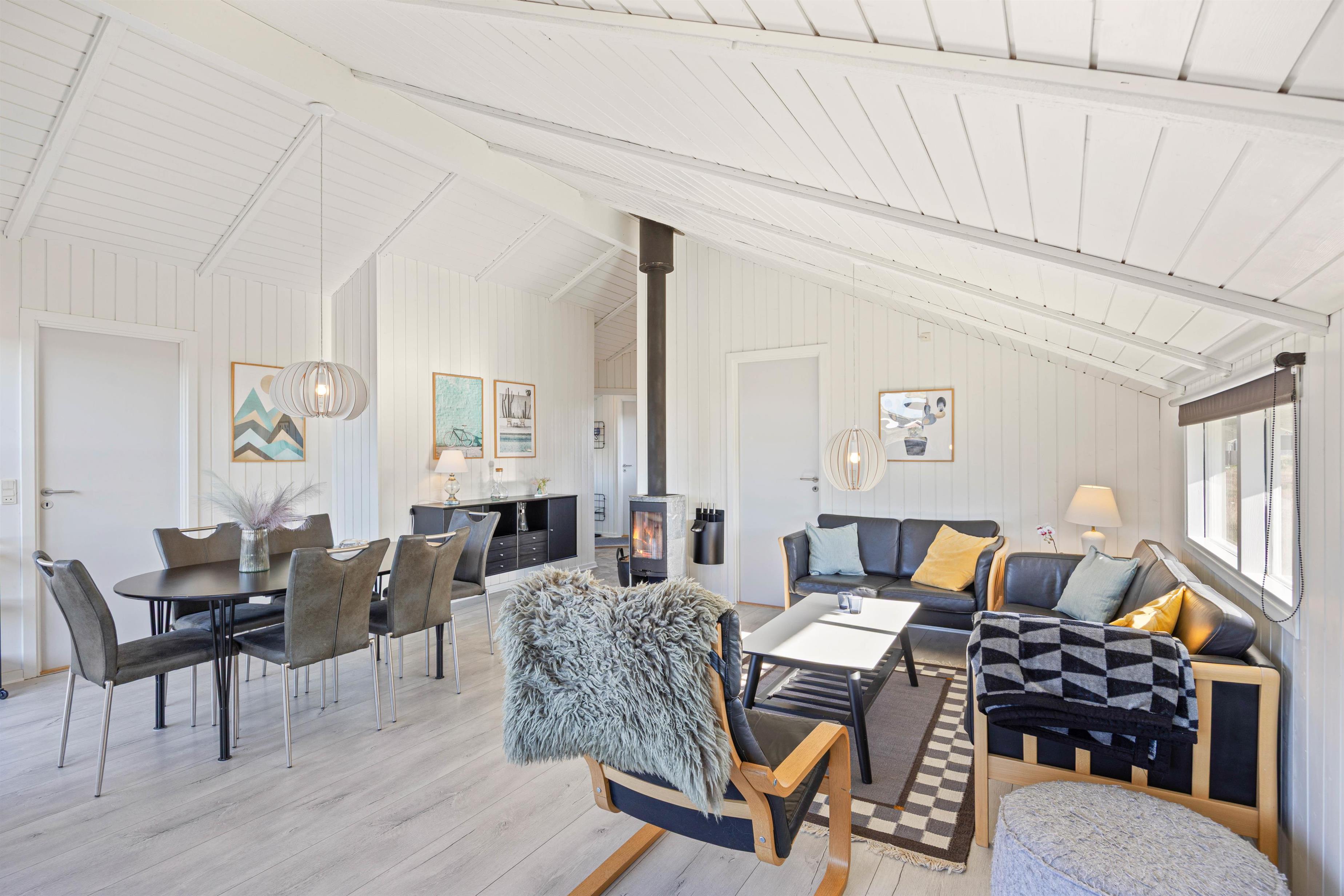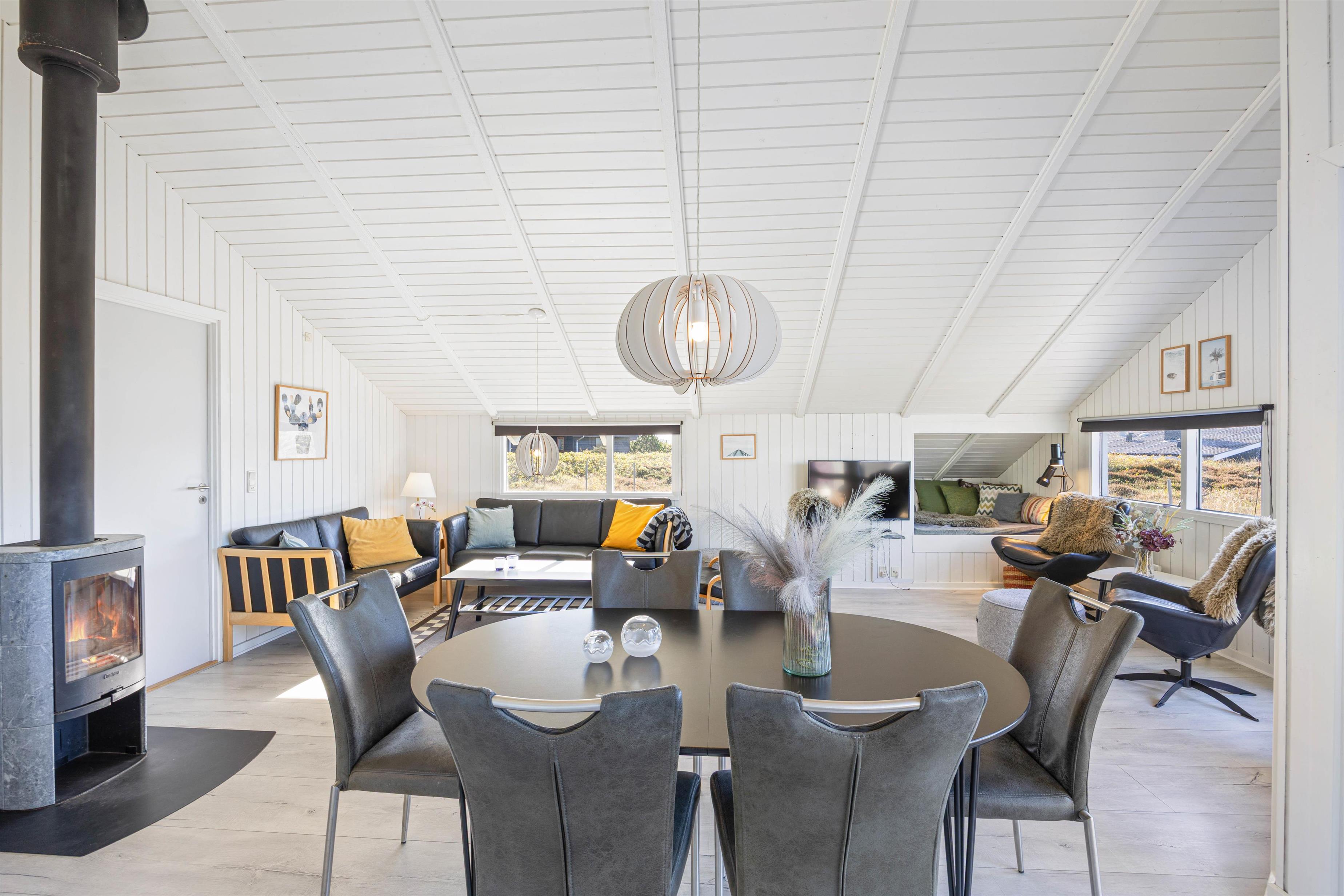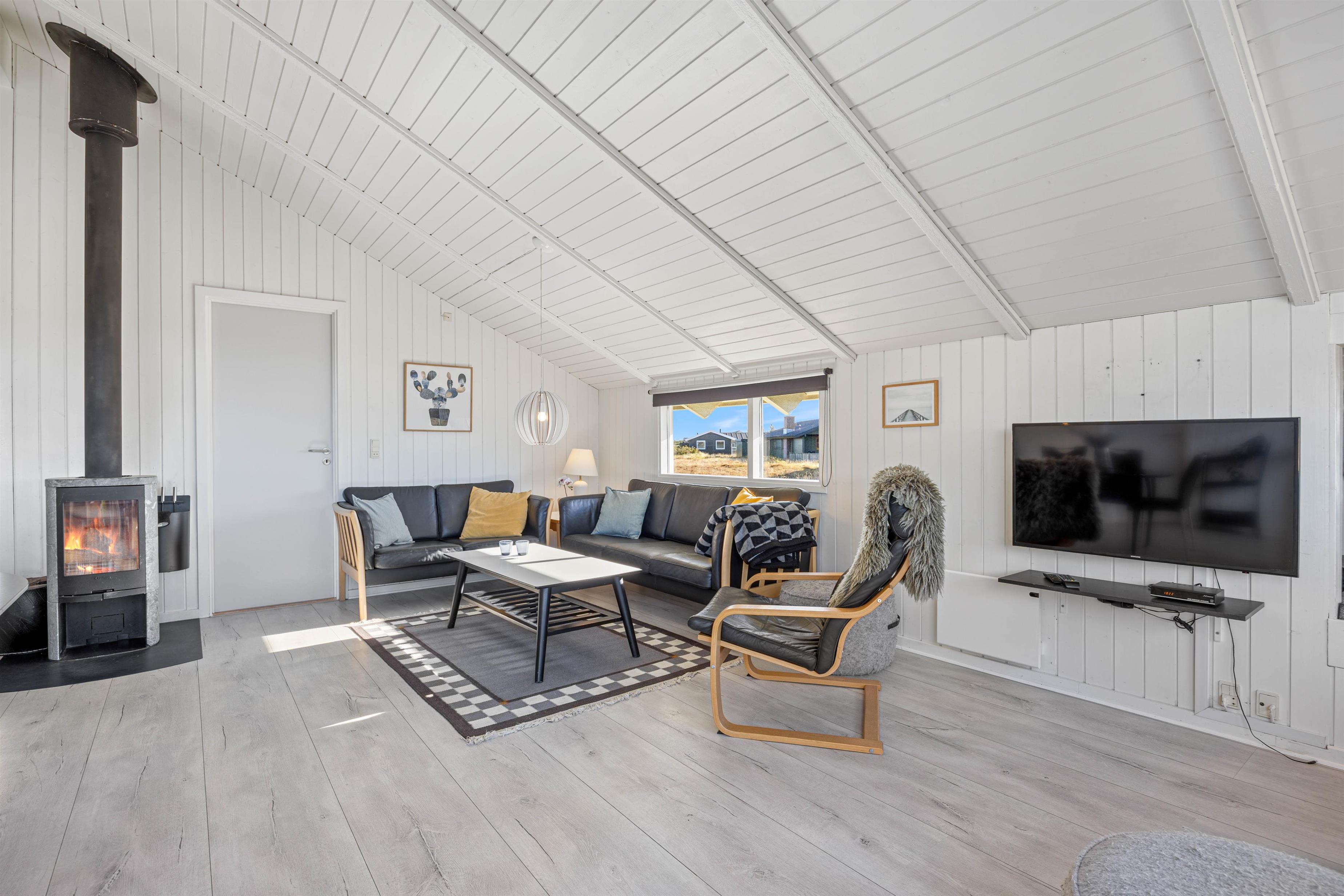 Der er højt til loftet, og den store stue indbyder til samvær og afslapning foran fjernsynet. På de kolde dage kan I stadig nyde den smukke natur gennem det store vinduesparti, og I kan desuden tænde op i husets brændeovn og lade de knitrende flammer varme jer, mens vinden suser af sted udenfor.