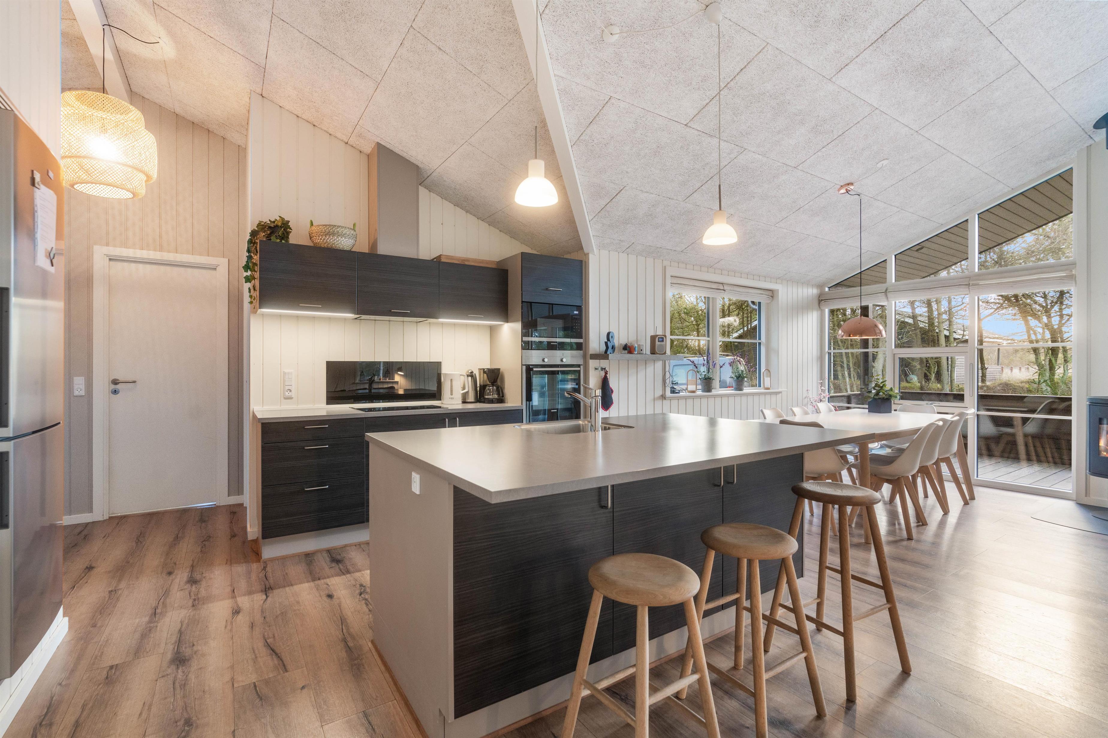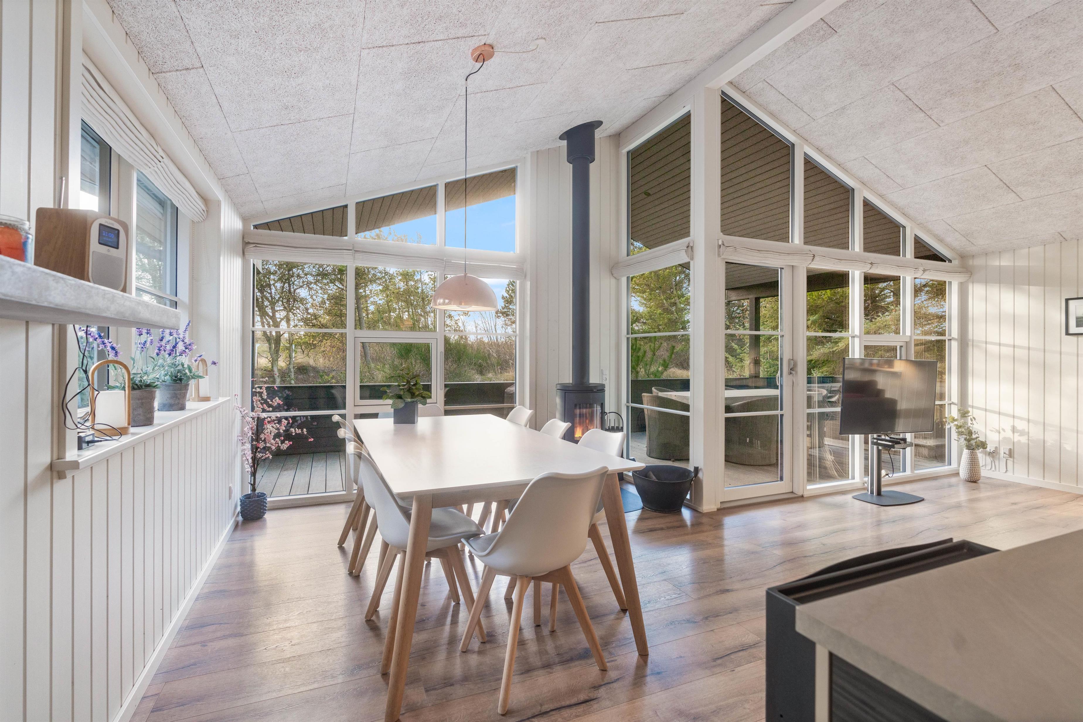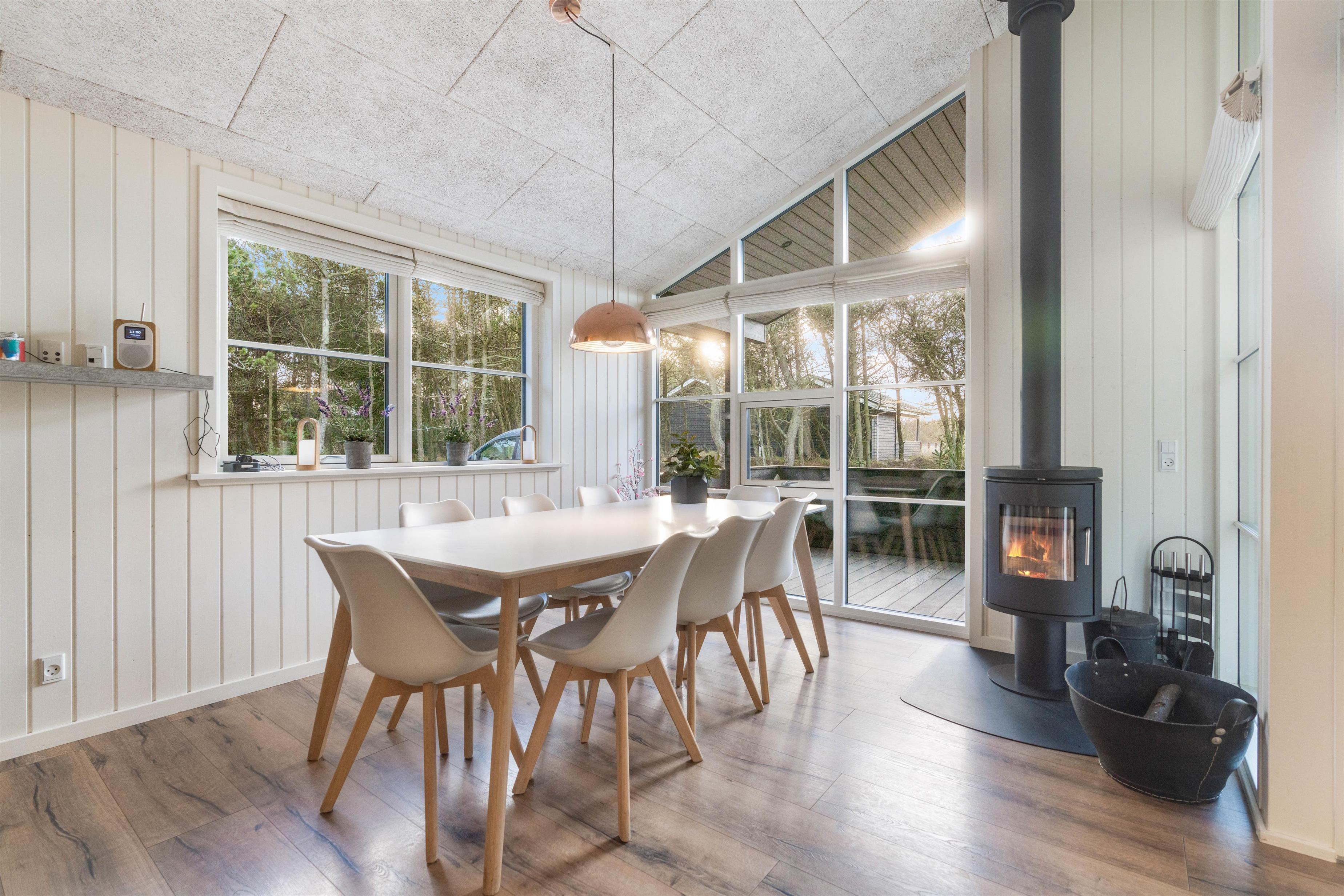 Sommerhusets varmepumpe og de energivenlige vinduer giver lavere el-omkostninger end i ældre huse. Og det flotte loft til kip giver både lys og luft, og det får sommerhuset til at virke større. Har man været en tur ved Vesterhavet er ild i brændeovnen en perfekt afslutning på dagen. Feriehusets gode fladskærms-TV er velegnet til gode film og fodbold.