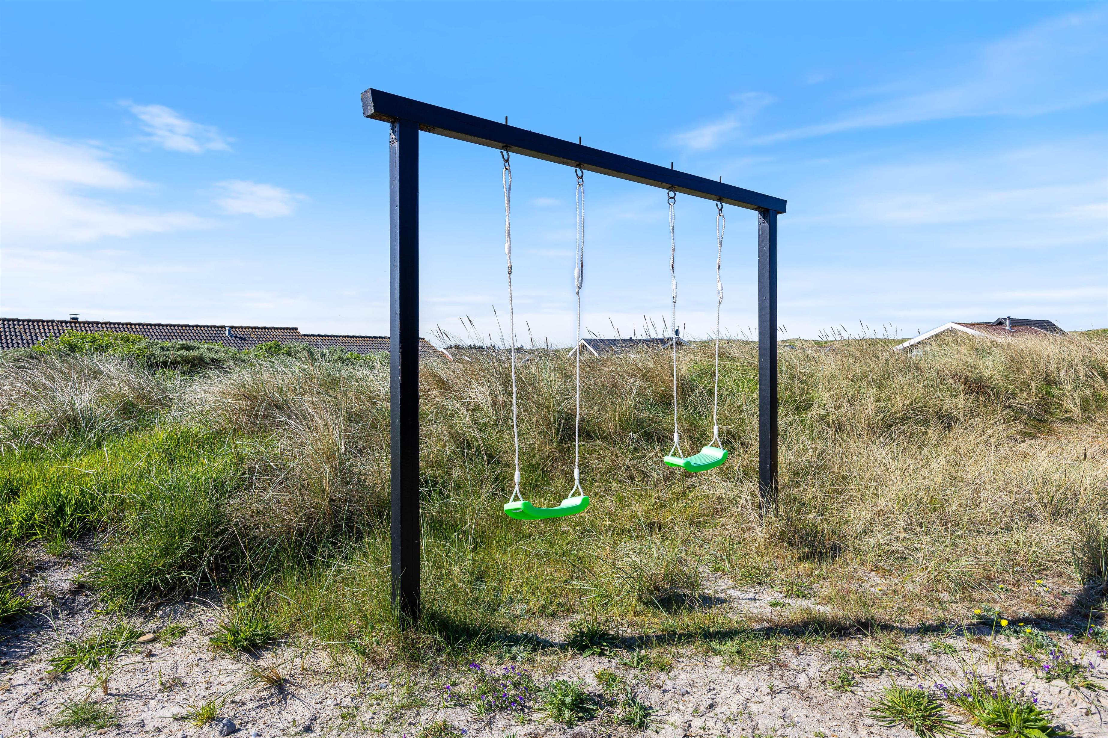 Terrassen er udstyret med gode havemøbler, liggestole og grill. På terrassen finder I desuden en sandkasse til børnene, som også kan bruge gyngestativet, der er på naturgrunden.