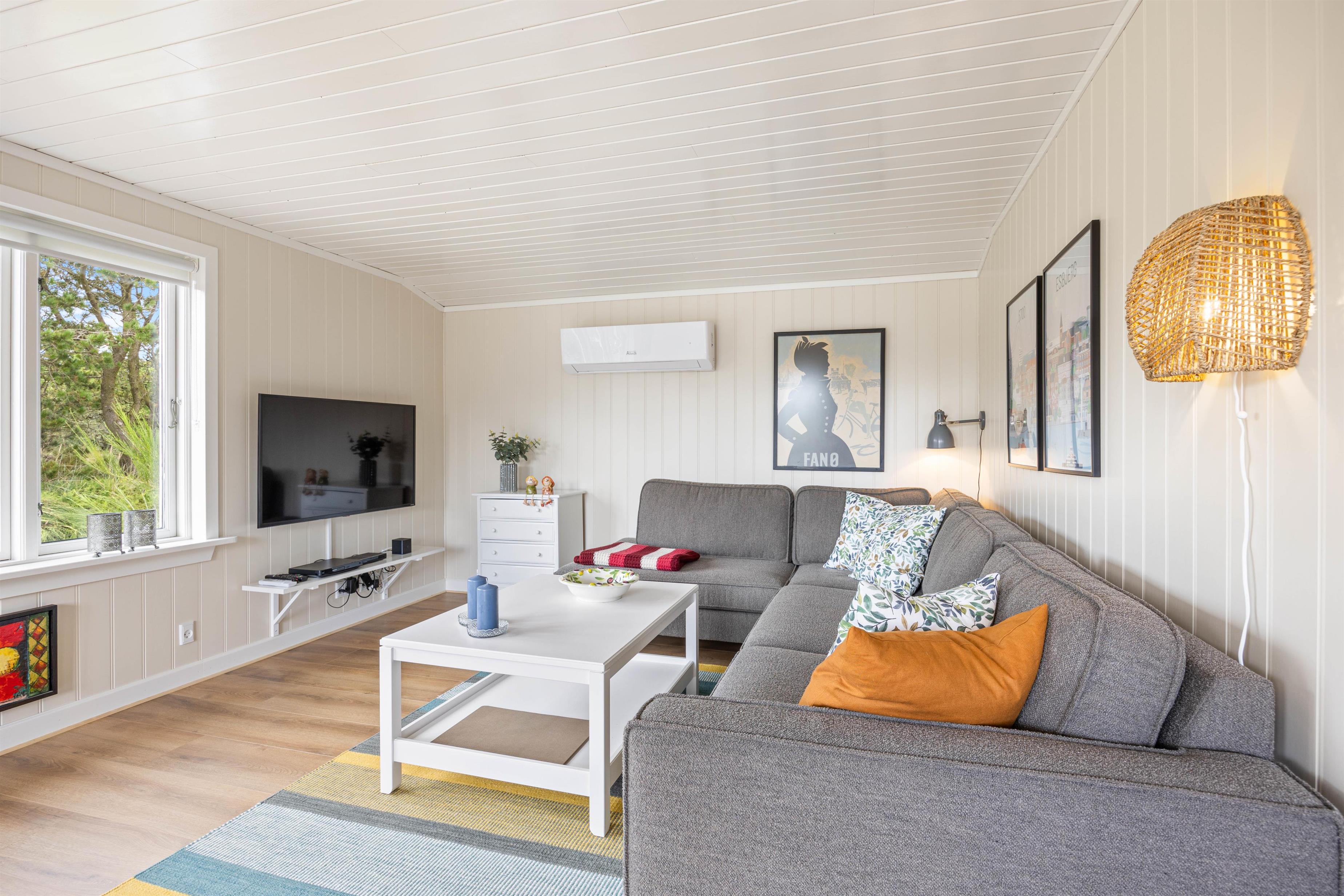 I det lille velindrettede sommerhus findes en lys stue, som ligger i forbindelse med det nye køkken. Gennem de store vinduer kan I nyde dagens sidste solstråler, hvad end I har slået benene op på sofaen med et godt glas eller spiller brætspil ved spisebordet. Feriehusets hjerte varmes op af en strømbesparende varmepumpe.