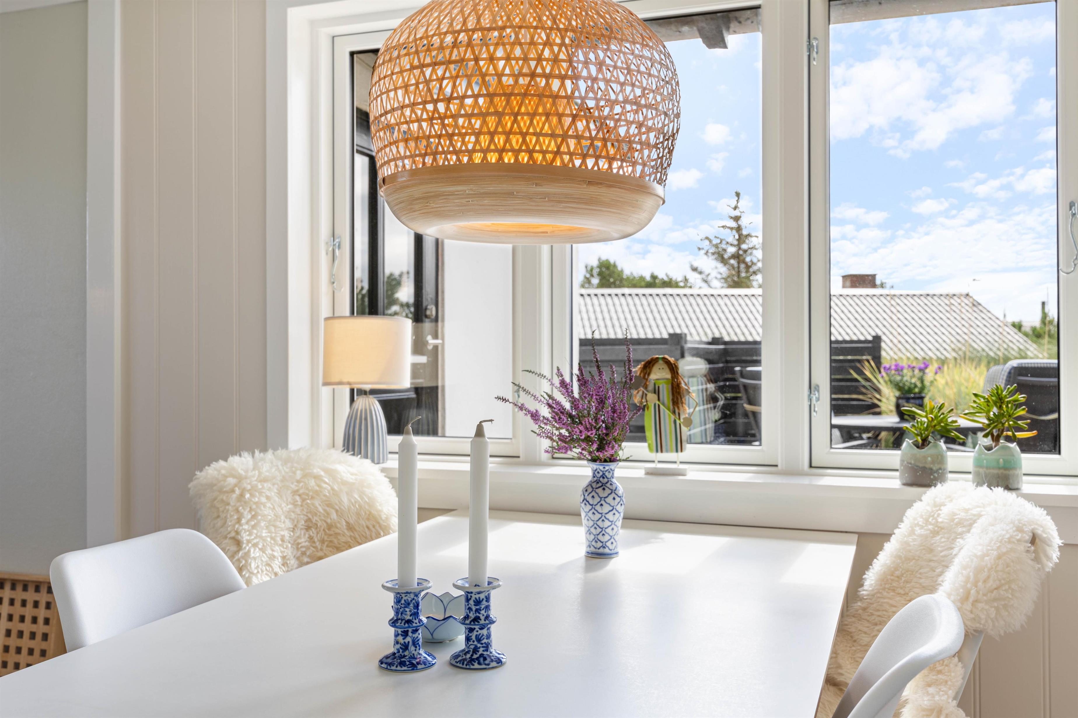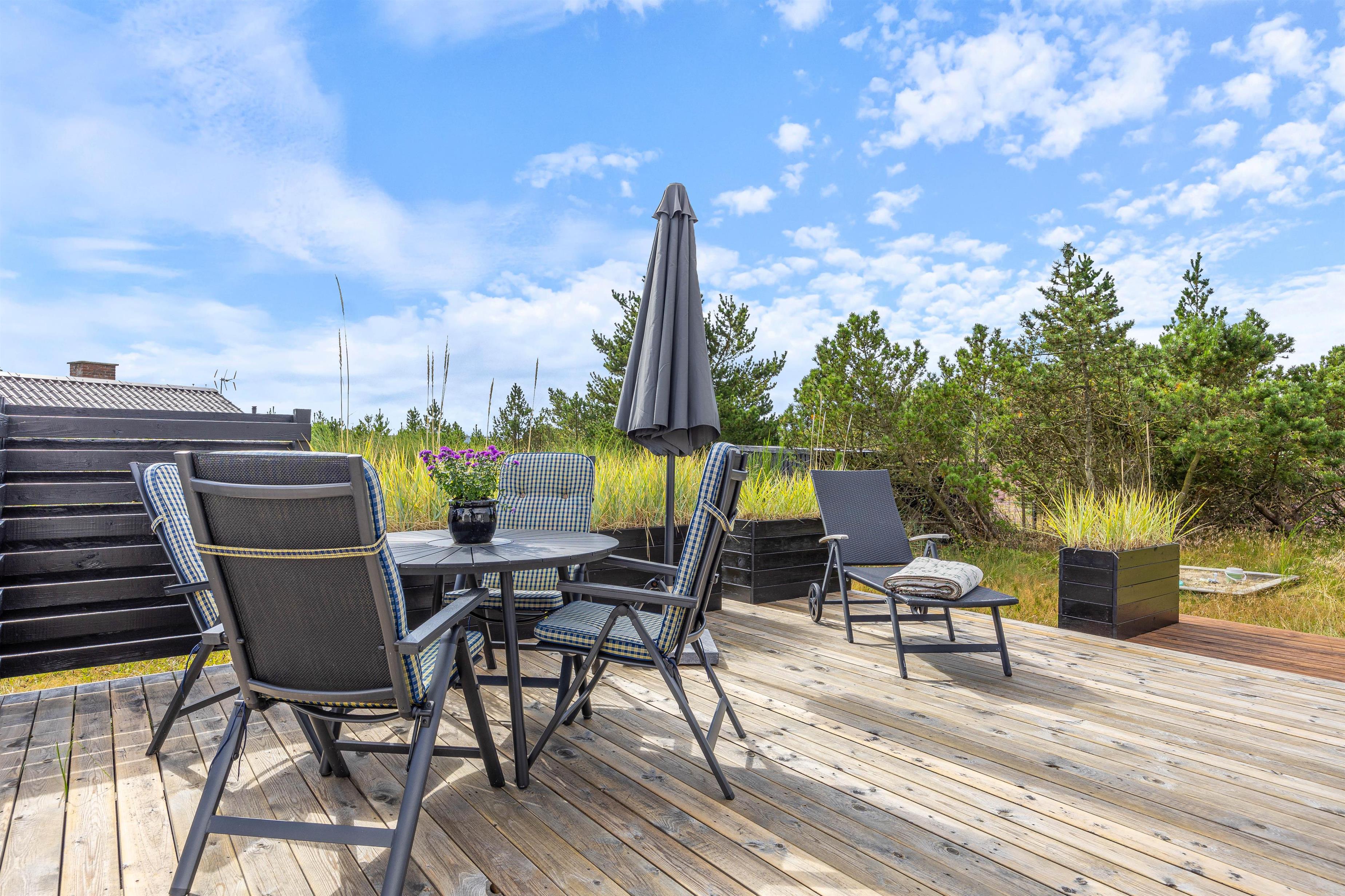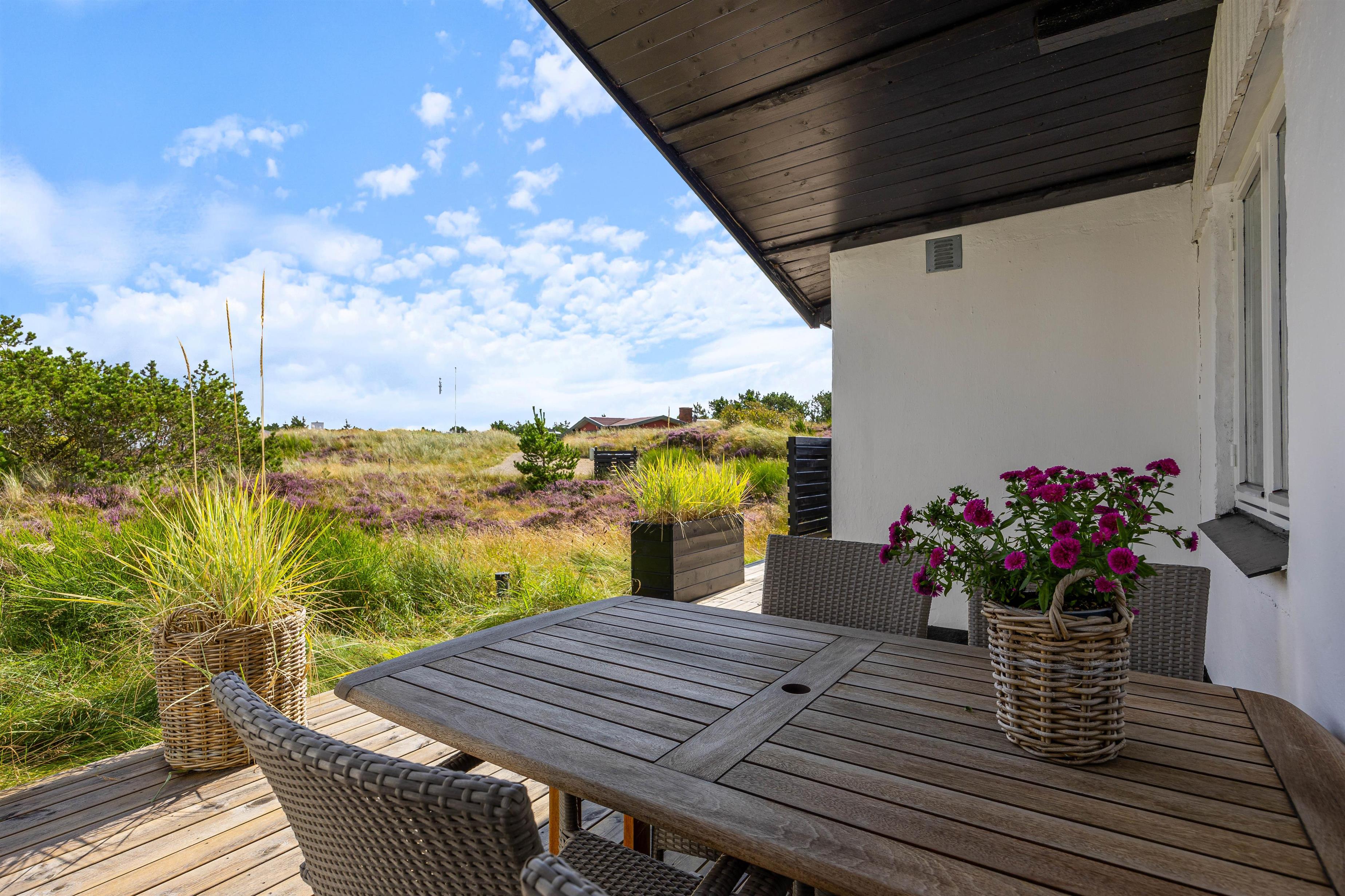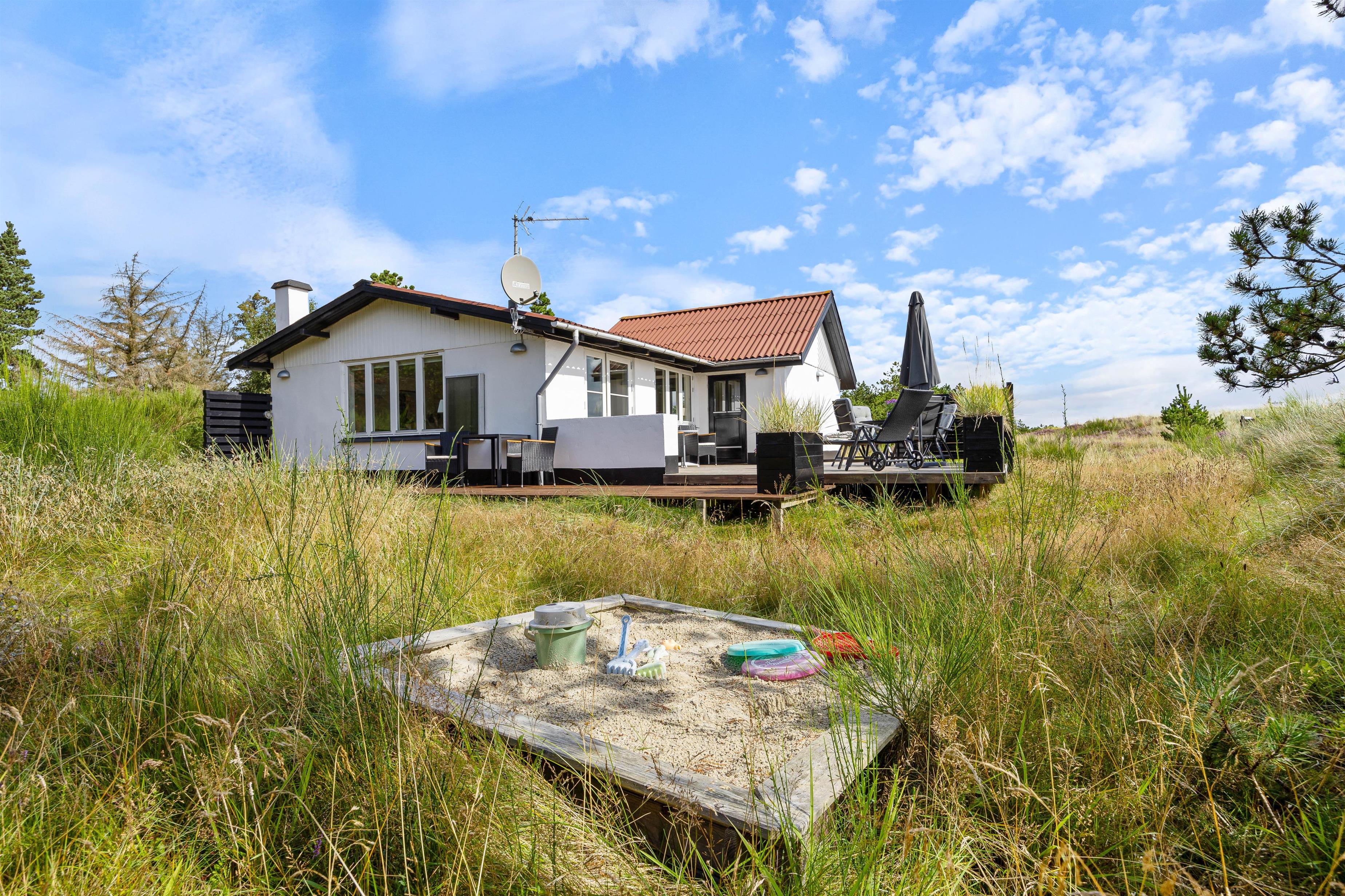 Sommerhuset har en stor træterrasse, som er vendt mod flere hjørner. På den måde kan I nyde solen i mange timer, blandt andet fra feriehusets liggestol, mens I har øje på børnene, som kan lege i sandkassen eller i klitterne. En del af terrassen er også overdækket, hvilket giver mulighed for at forlænge sommeren eller blot nyde morgenkaffen, når vejret bliver en smule køligere. Her kan I også sidde at nyde grillmaden, som er tilberedt på gasgrillen.