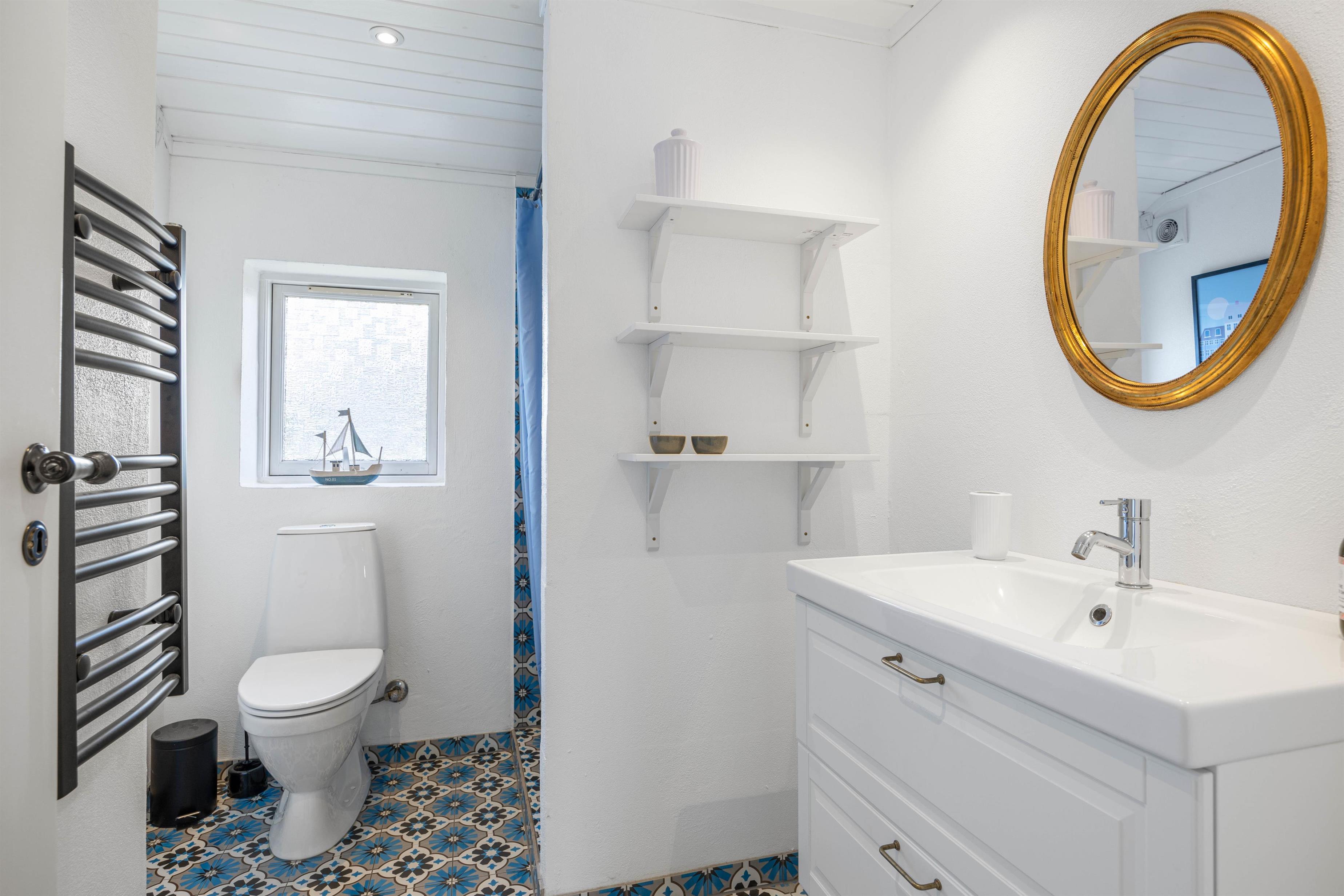 Sommerhusets 4 sovepladser fordeles på to værelser, der begge er indrettet med en 180x200 cm dobbeltseng. Også badeværelset med flotte retro fliser i blålige nuancer emmer af sommerhusstemning.