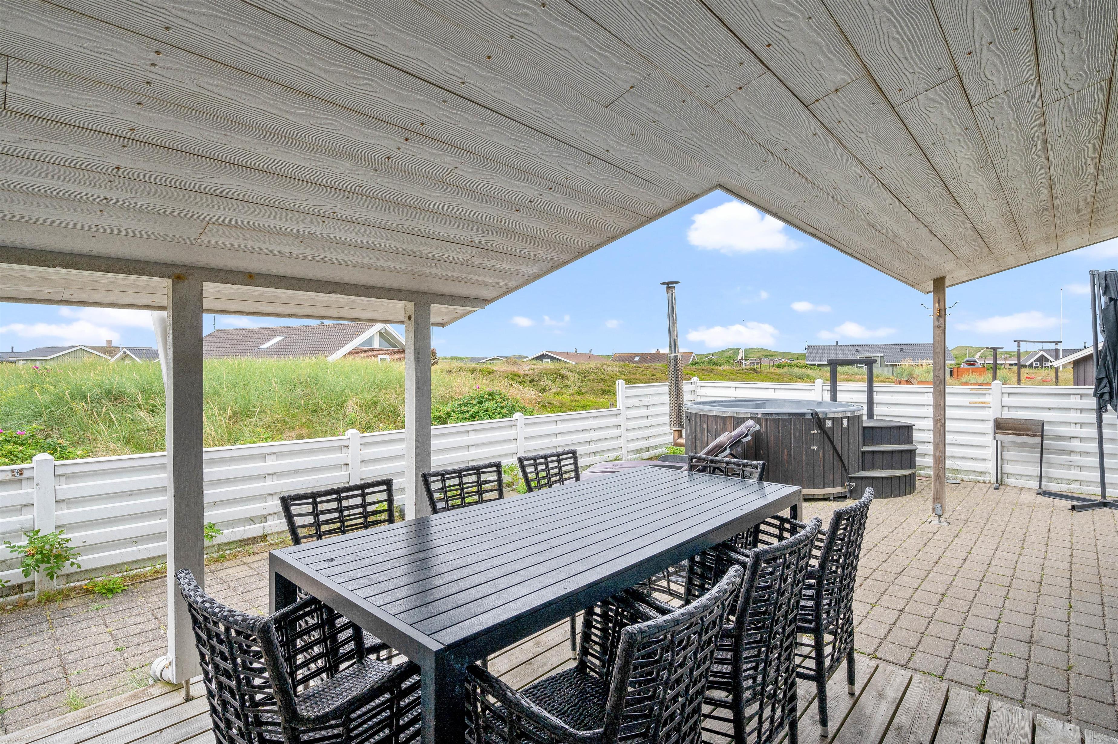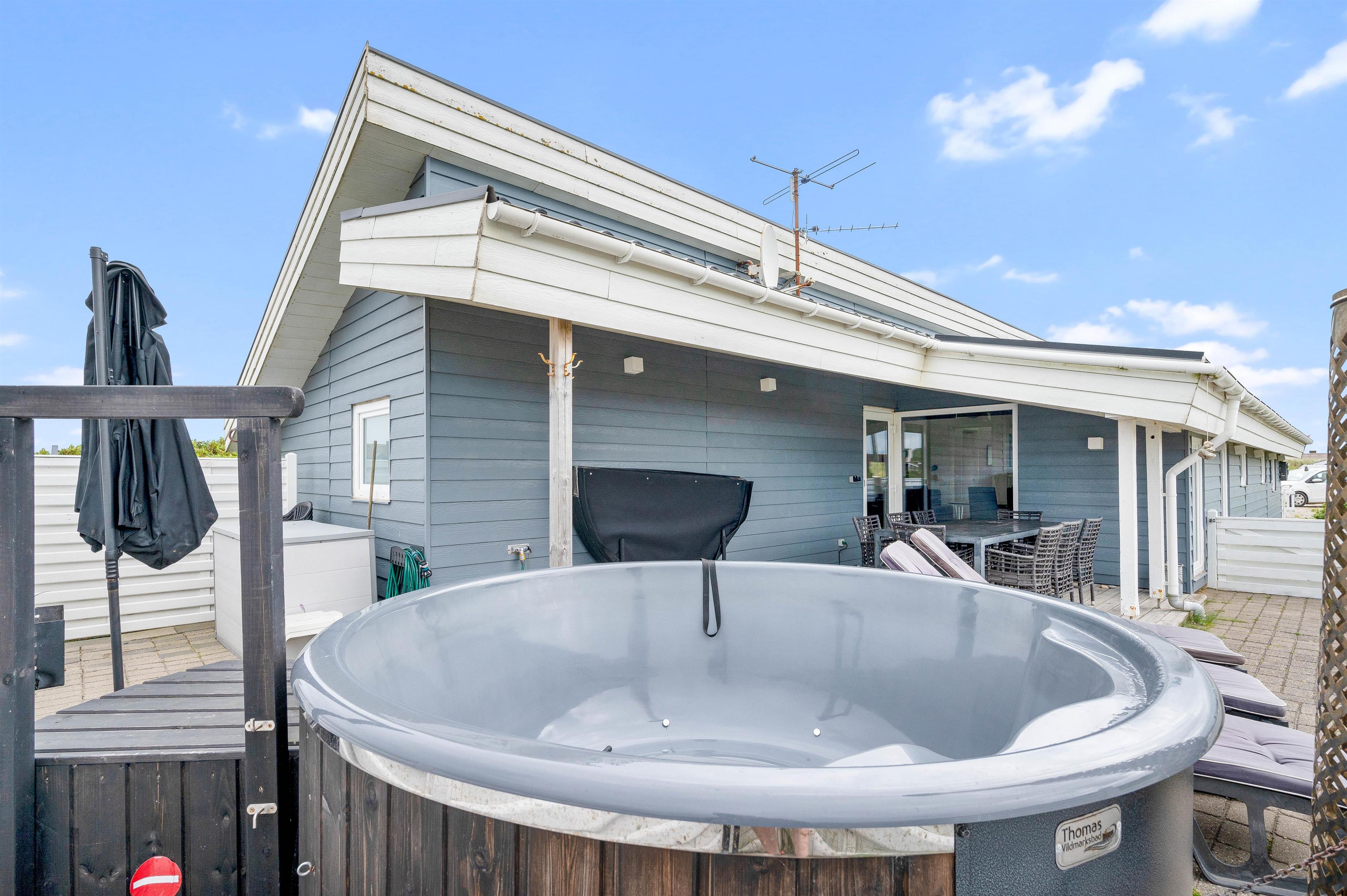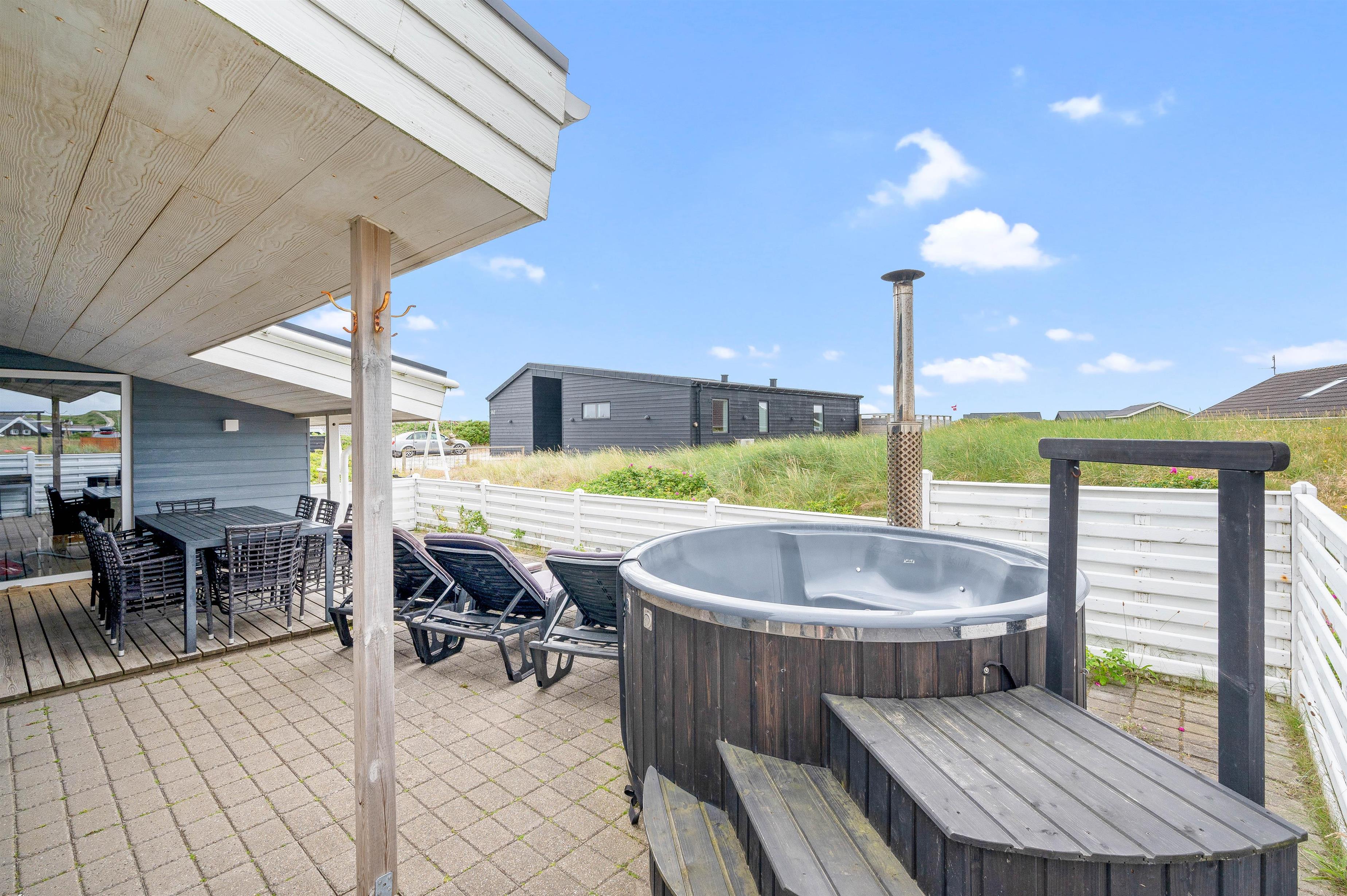 Der er en dejlig lukket terrasse, hvor du sagtens kan lade småbørn og hunde færdes under mindre opsyn. Da den er sydvest-vendt vil du her kunne nyde solen det meste af dagen, og endda få dagens sidste solstråler med, mens bøfferne vendes på grillen. Skulle vejret vise sig fra sin drilske side, kan du også sidde i ly og læ under terrassens halvtag. Udenfor finder I også et vildmarksbad, som ligger op til mange timers hygge og afslapning.