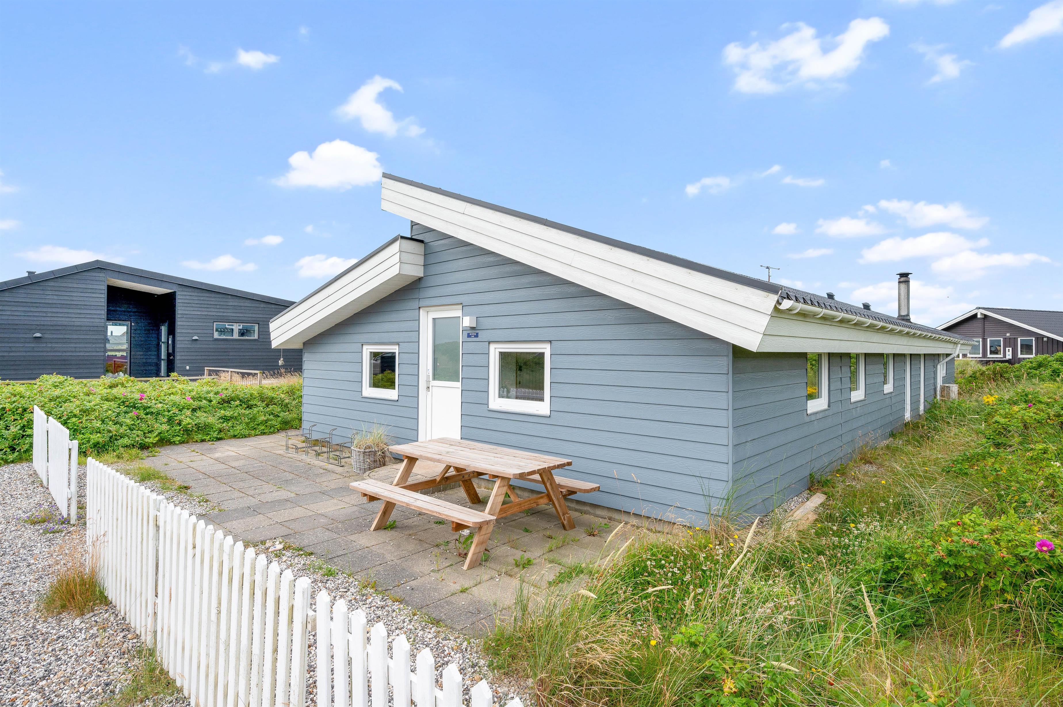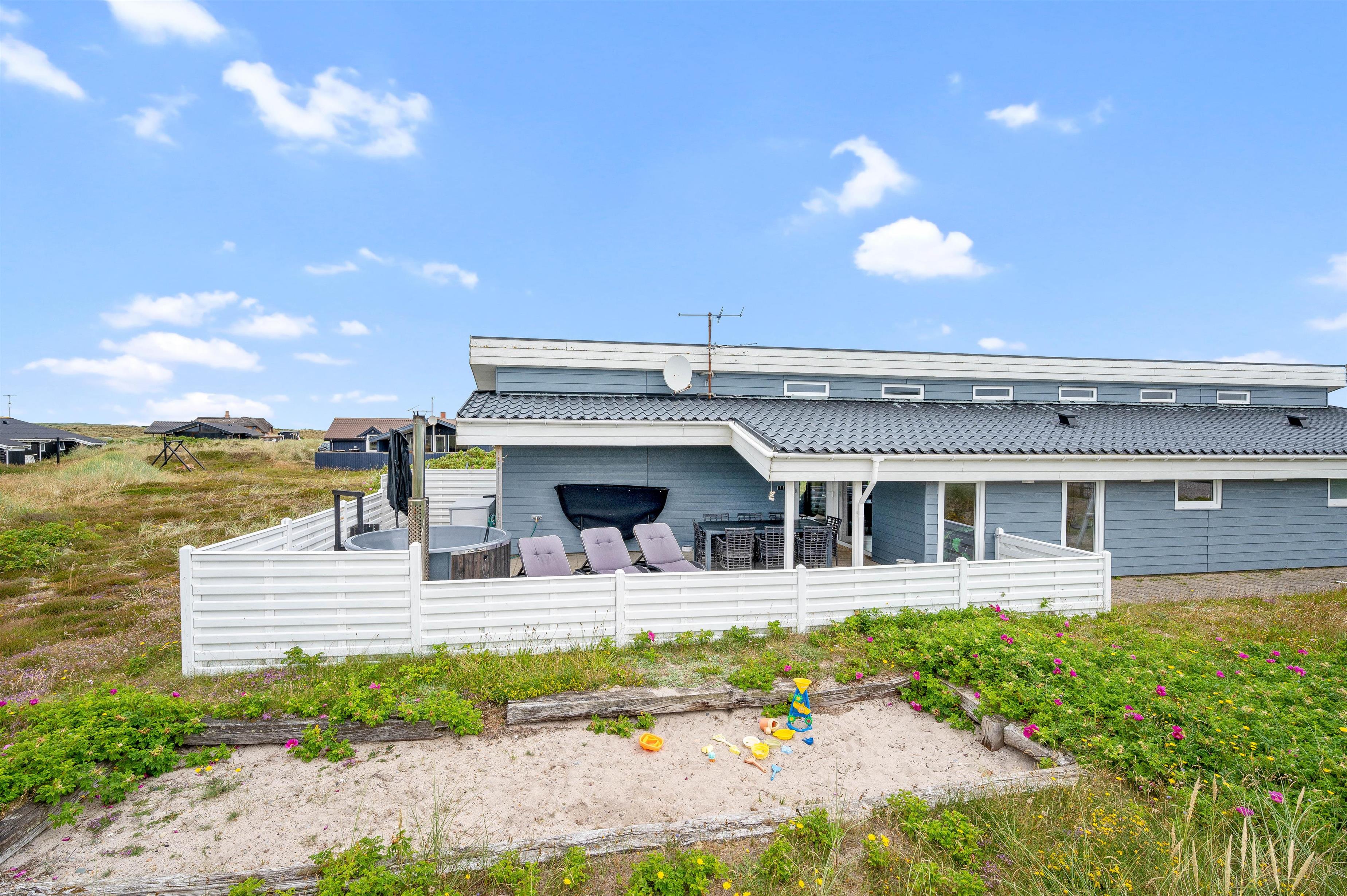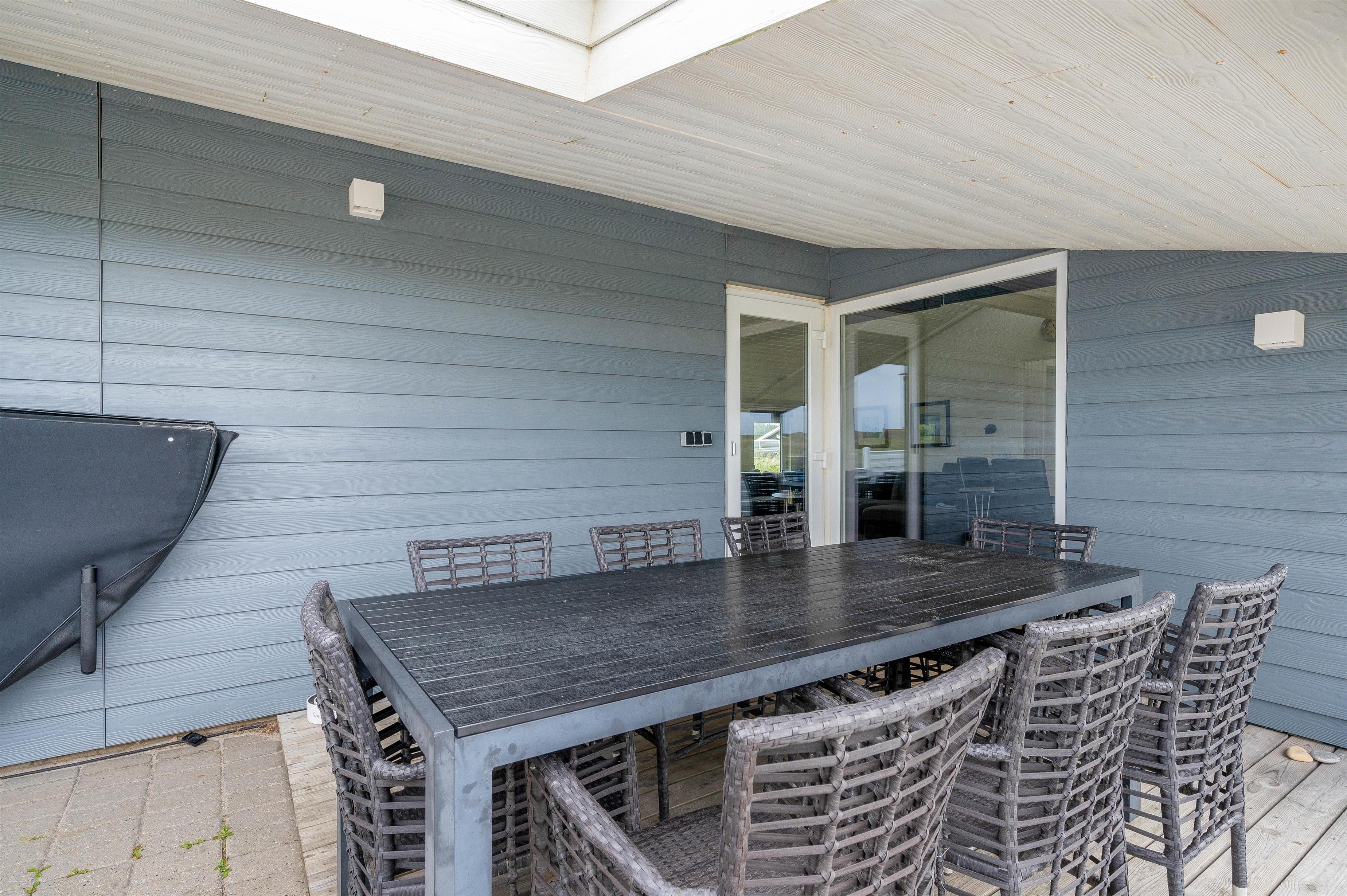 Der er en dejlig lukket terrasse, hvor du sagtens kan lade småbørn og hunde færdes under mindre opsyn. Da den er sydvest-vendt vil du her kunne nyde solen det meste af dagen, og endda få dagens sidste solstråler med, mens bøfferne vendes på grillen. Skulle vejret vise sig fra sin drilske side, kan du også sidde i ly og læ under terrassens halvtag. Udenfor finder I også et vildmarksbad, som ligger op til mange timers hygge og afslapning.