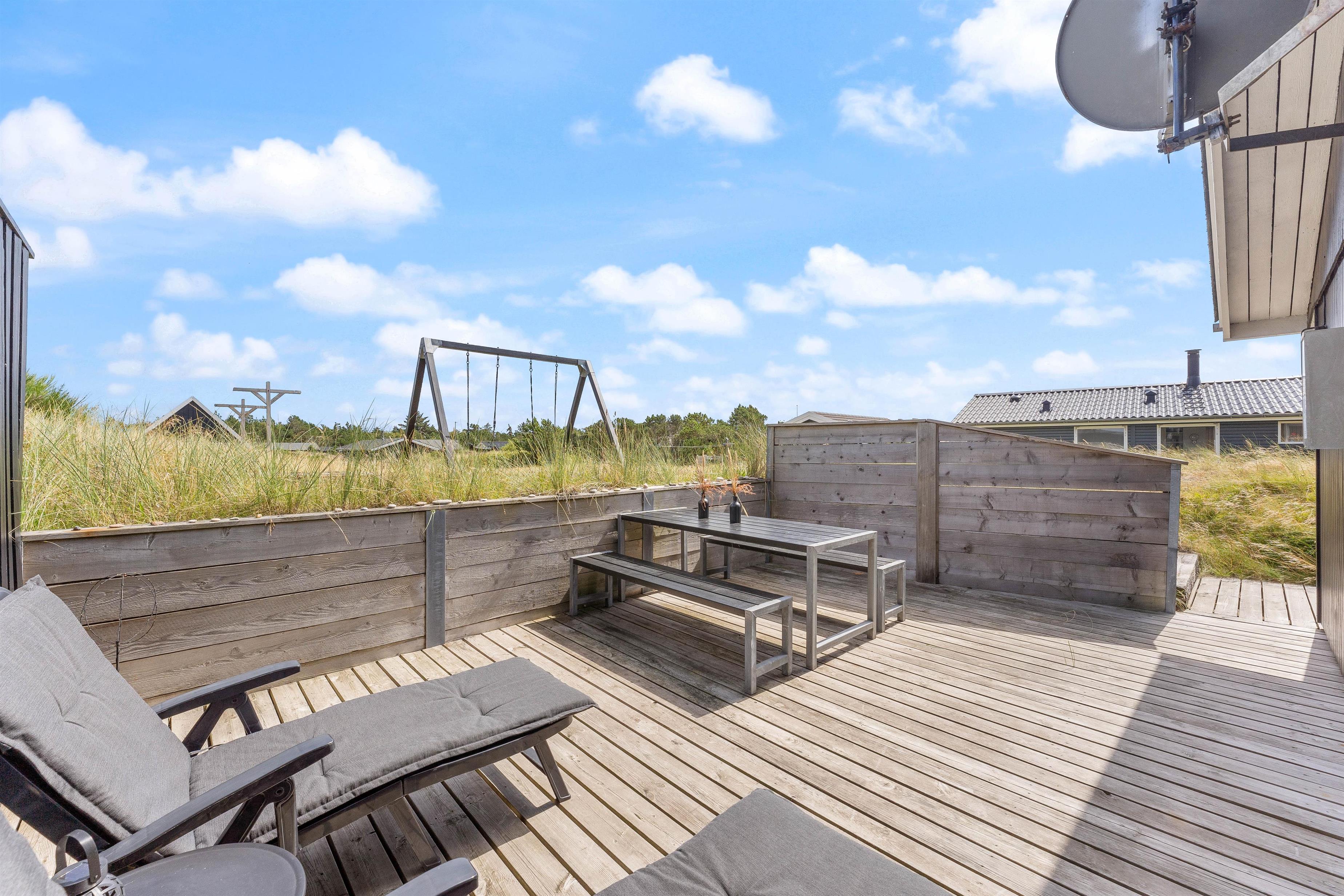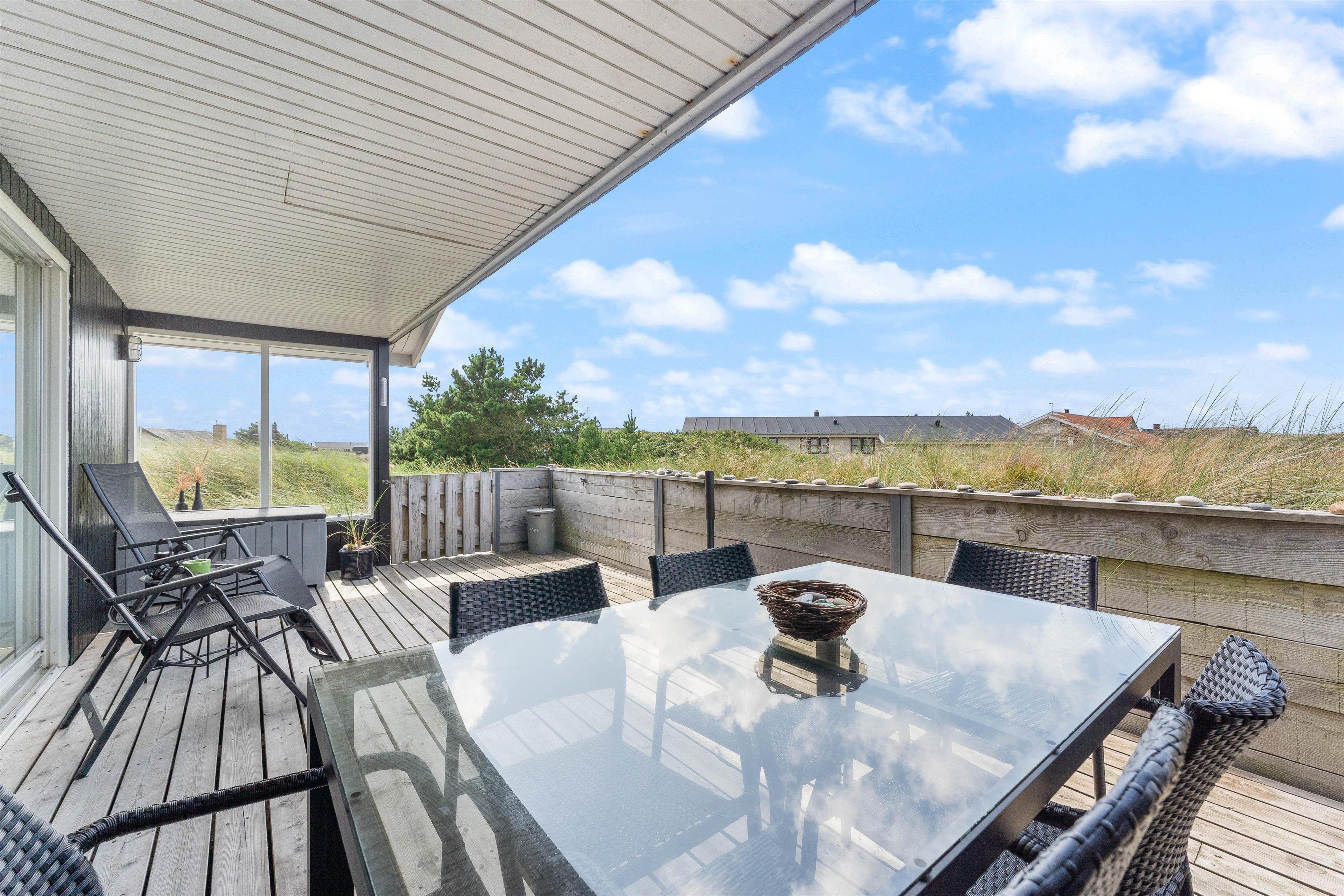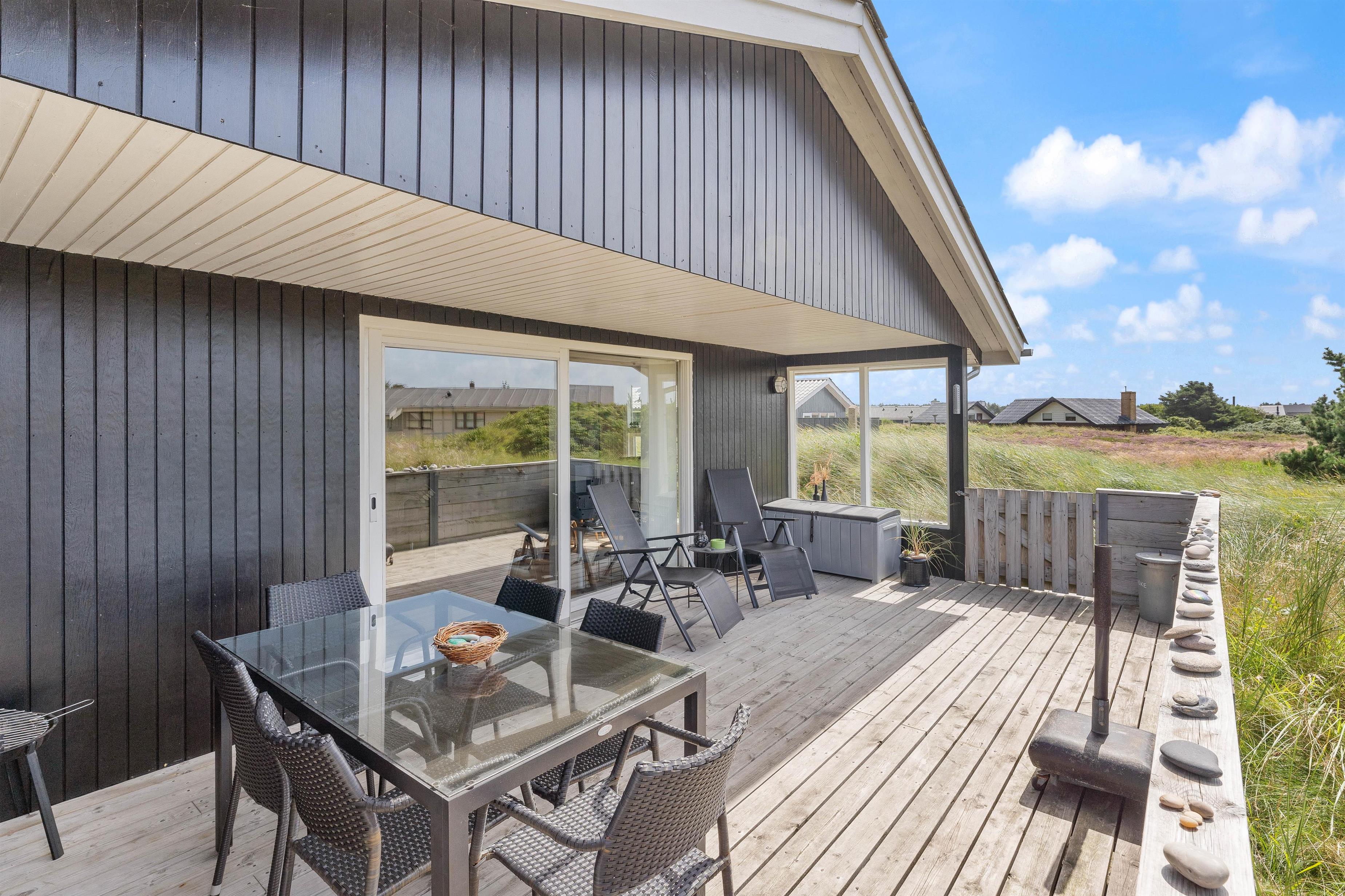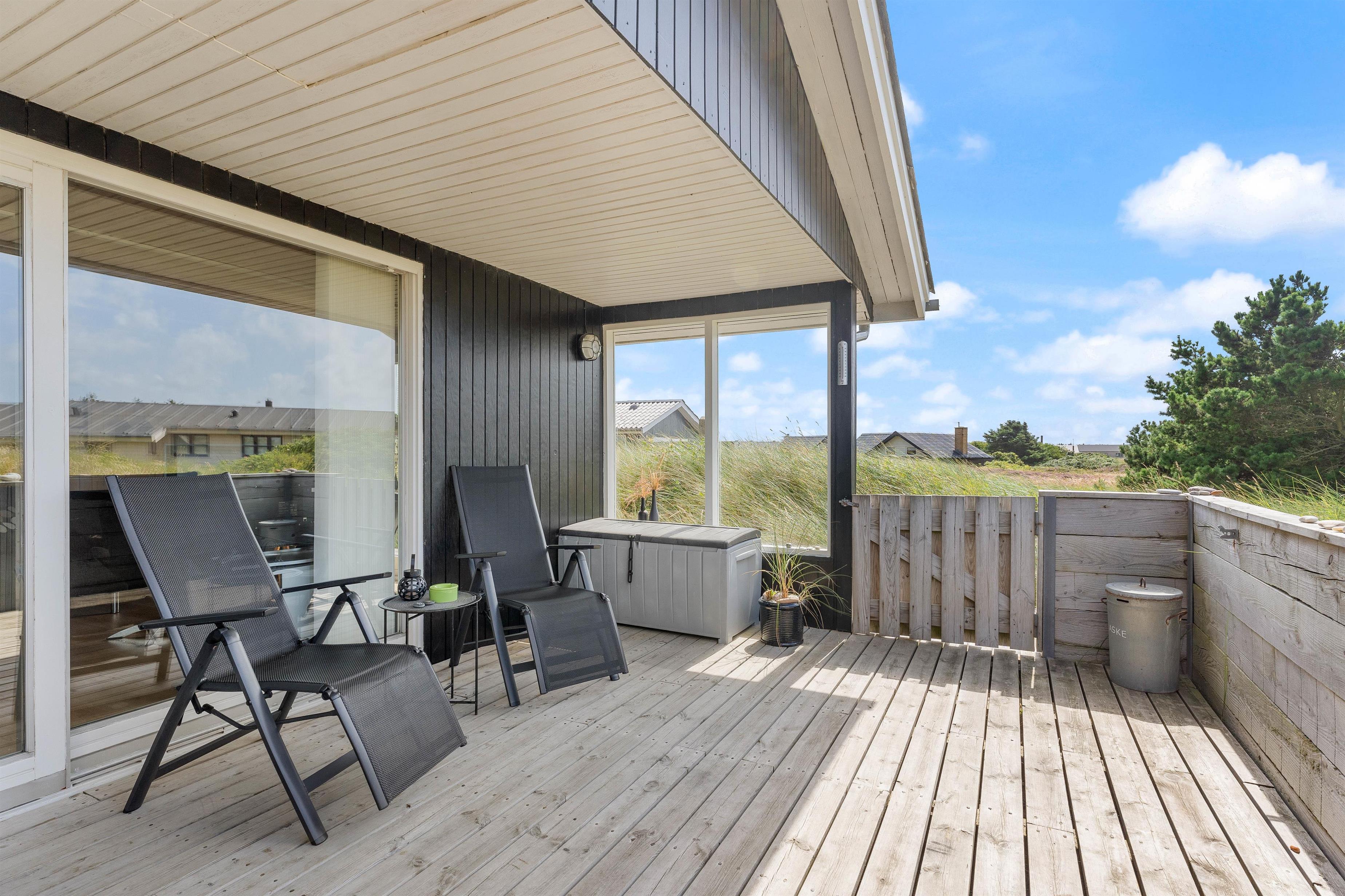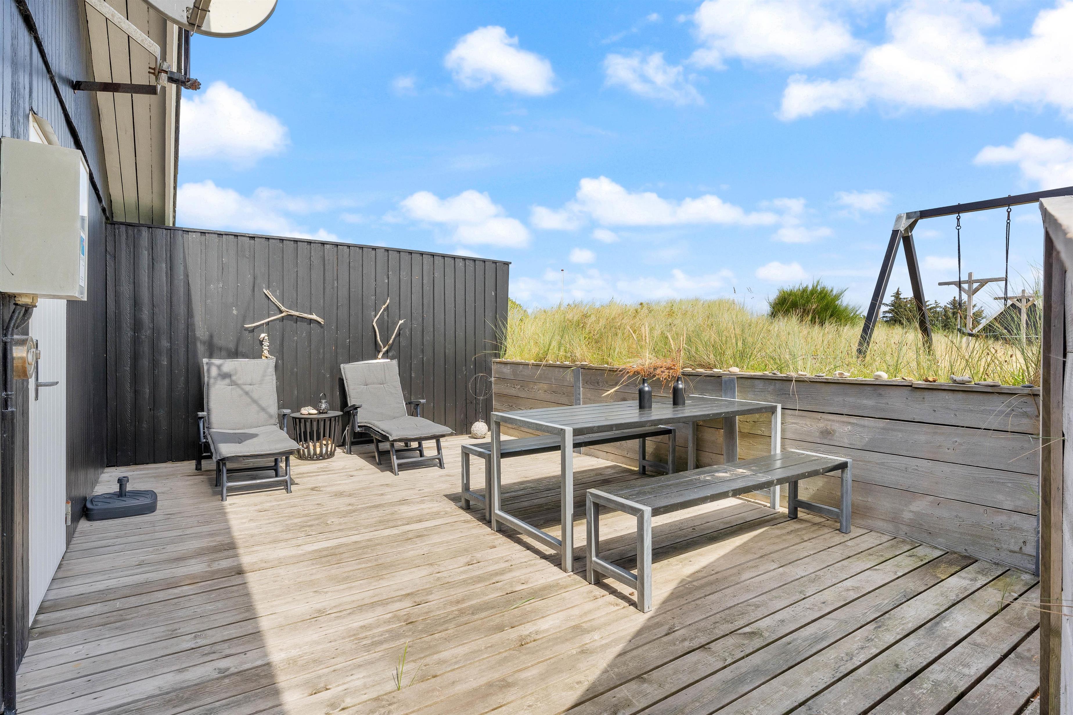 Der er terrasse mod øst, mod syd og mod vest, hvilket giver mulighed for at opholde jer udenfor det meste af dagen. Den delvist overdækkede terrasse mod vest er ideel til hyggelige grillaftener. Herfra er der skøn udsigt, der indbyder til en dejlig gåtur igennem klitlandskabet til strand og hav.