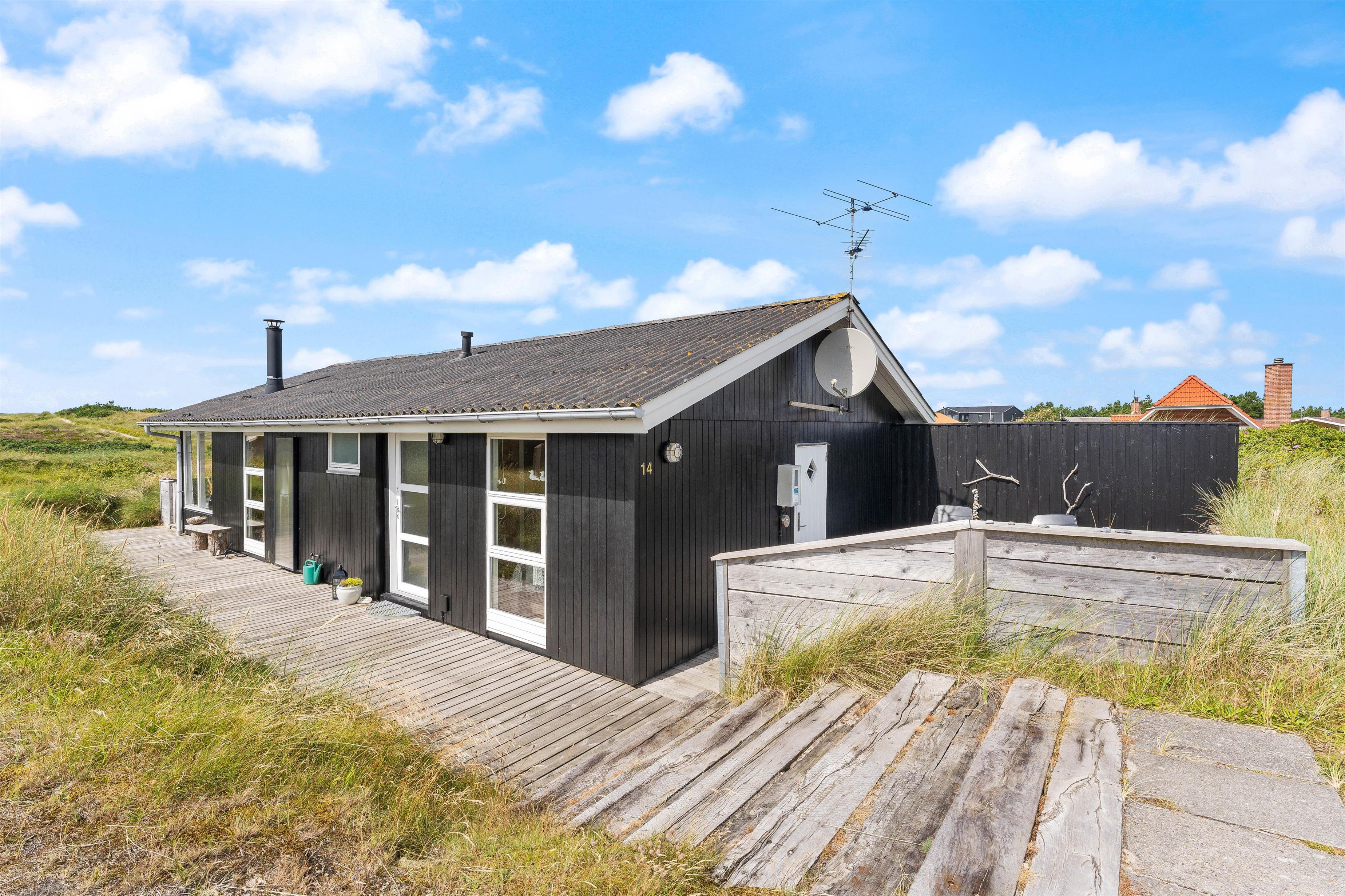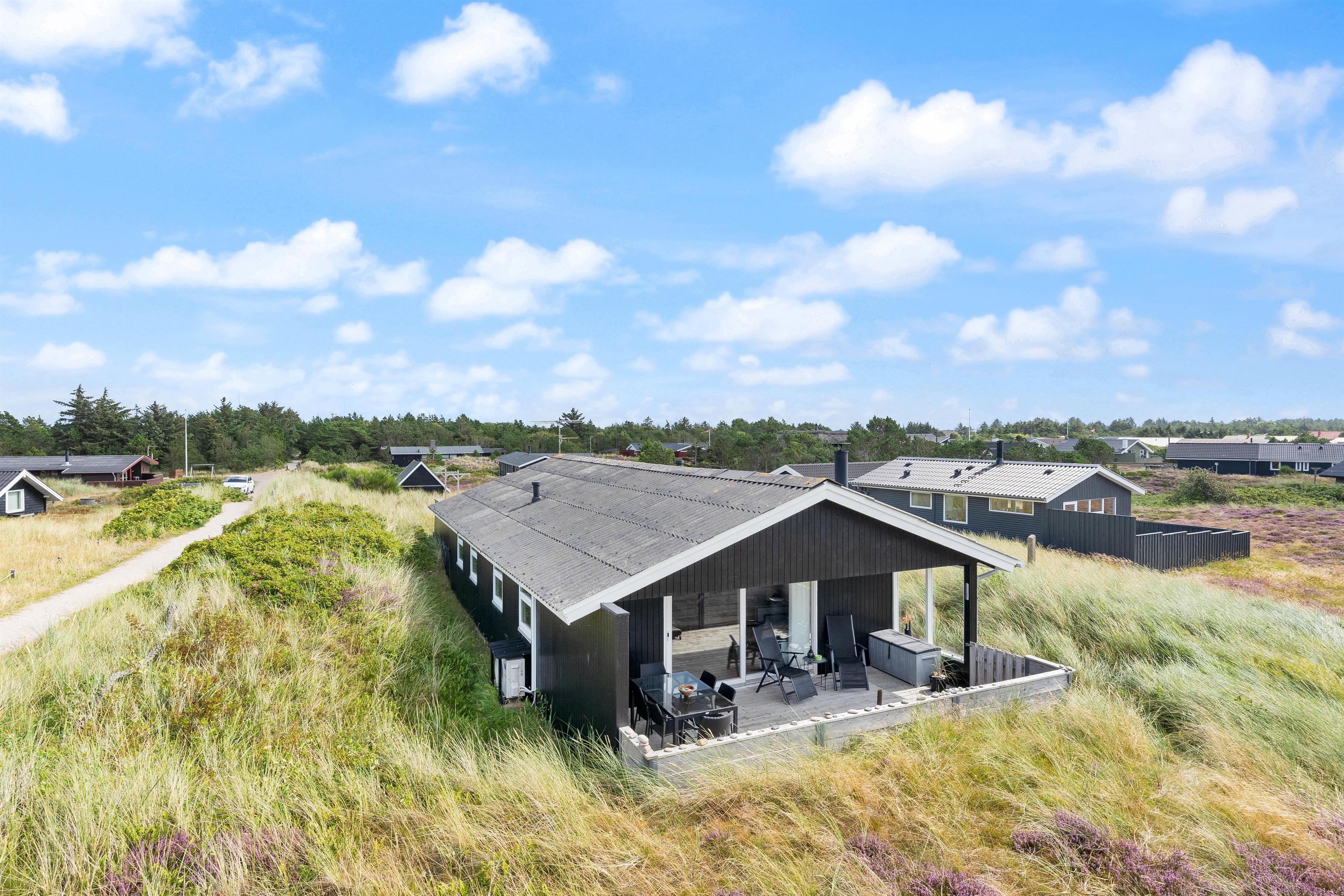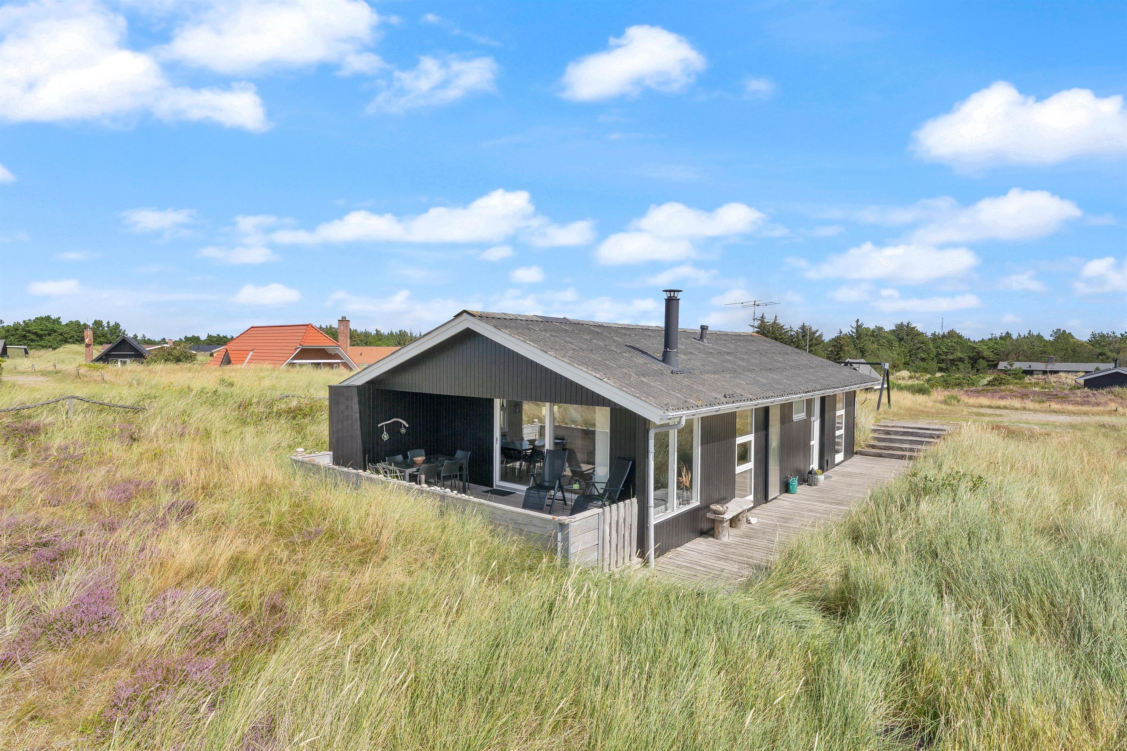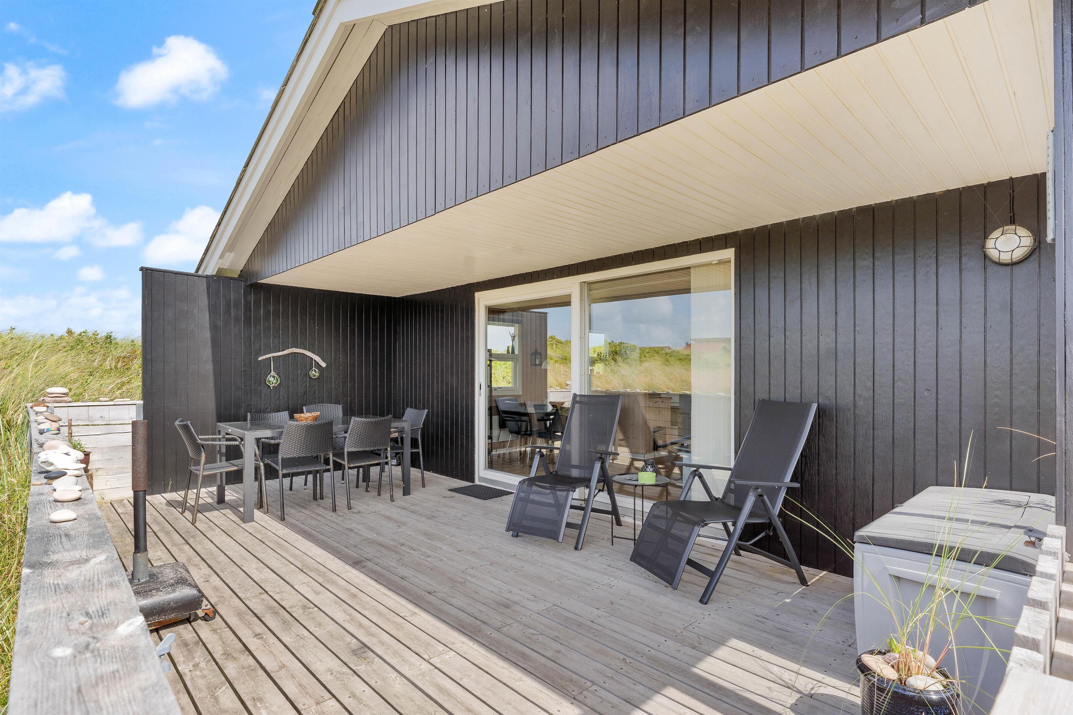Der er terrasse mod øst, mod syd og mod vest, hvilket giver mulighed for at opholde jer udenfor det meste af dagen. Den delvist overdækkede terrasse mod vest er ideel til hyggelige grillaftener. Herfra er der skøn udsigt, der indbyder til en dejlig gåtur igennem klitlandskabet til strand og hav.