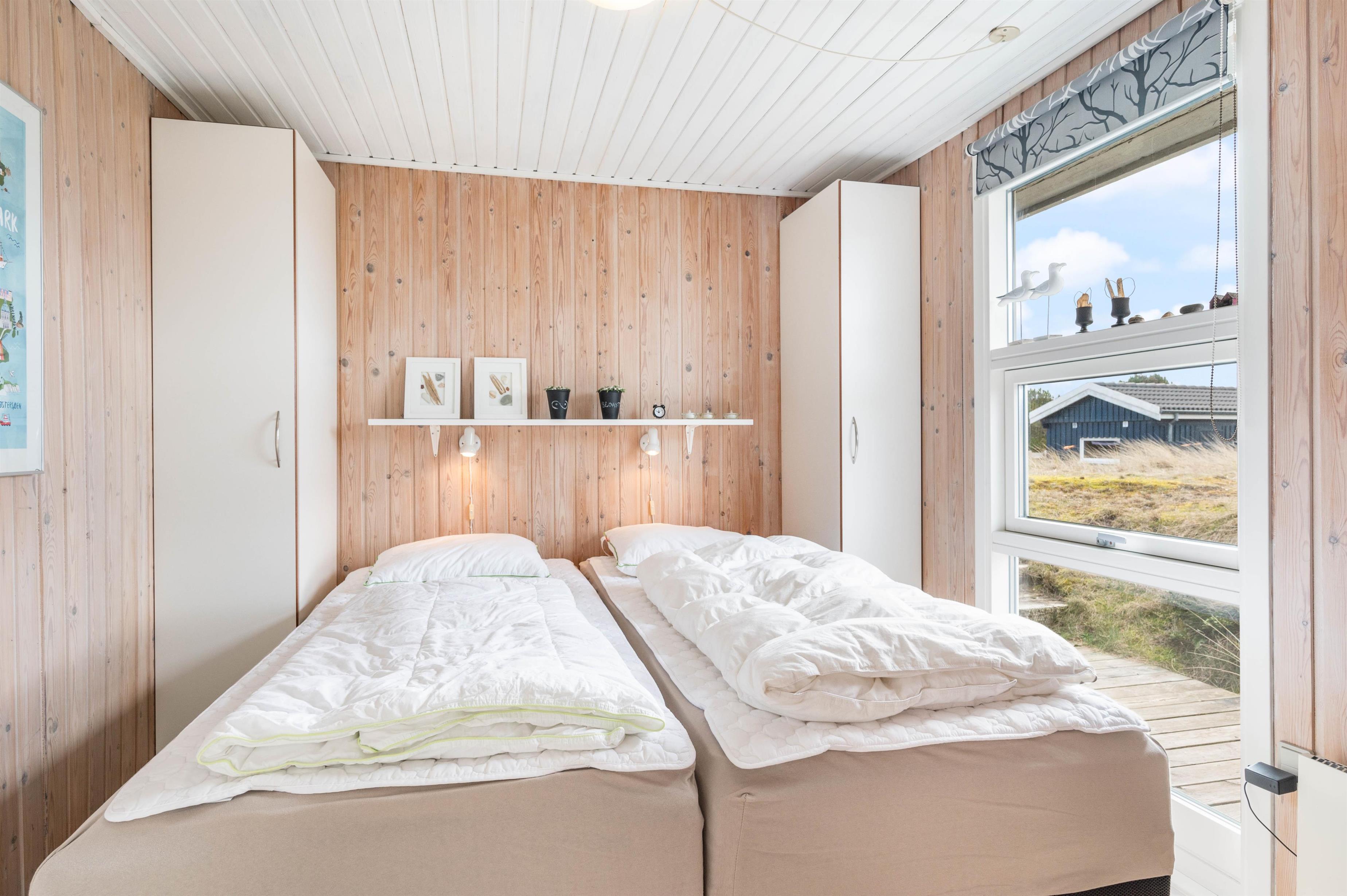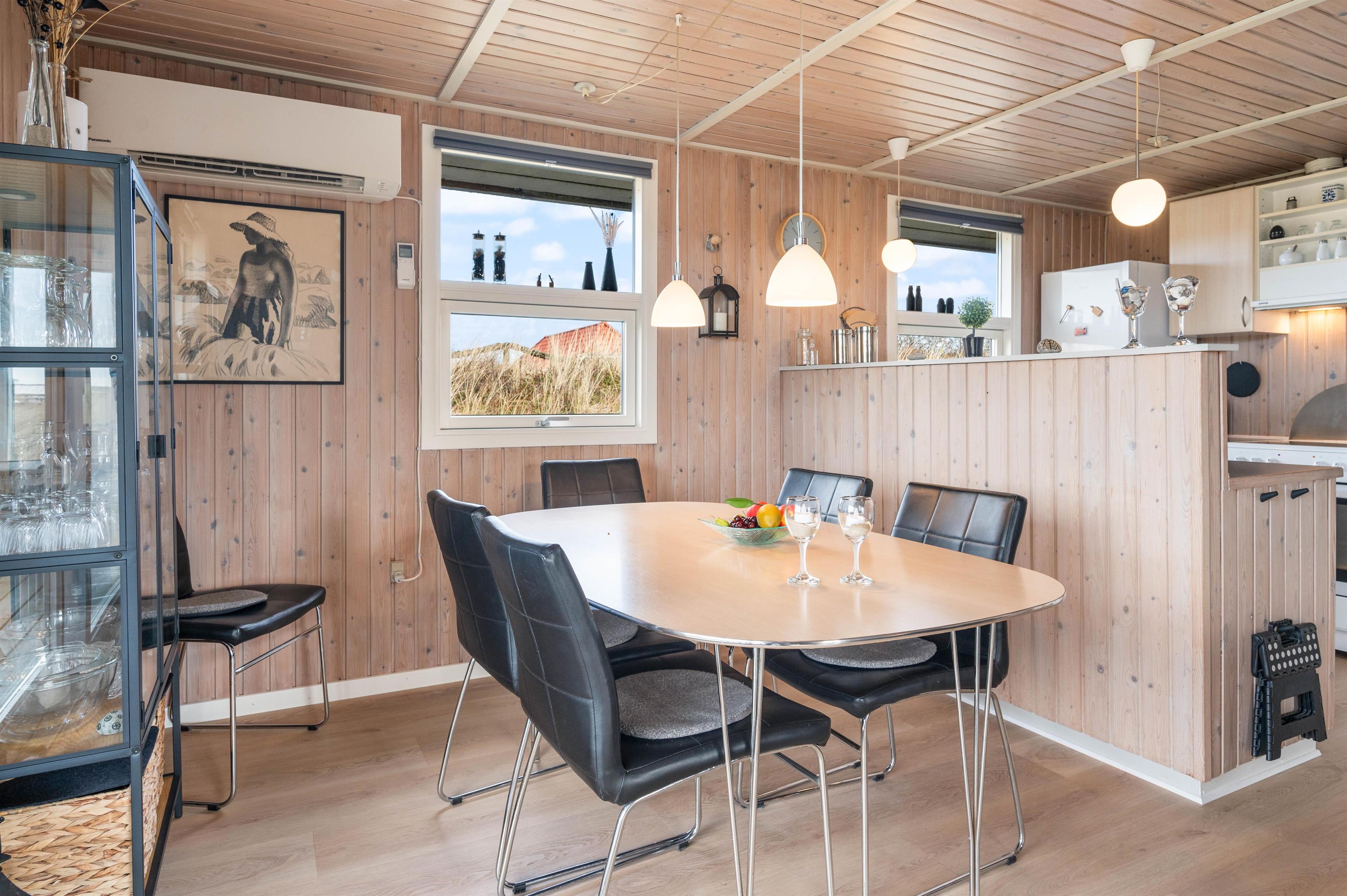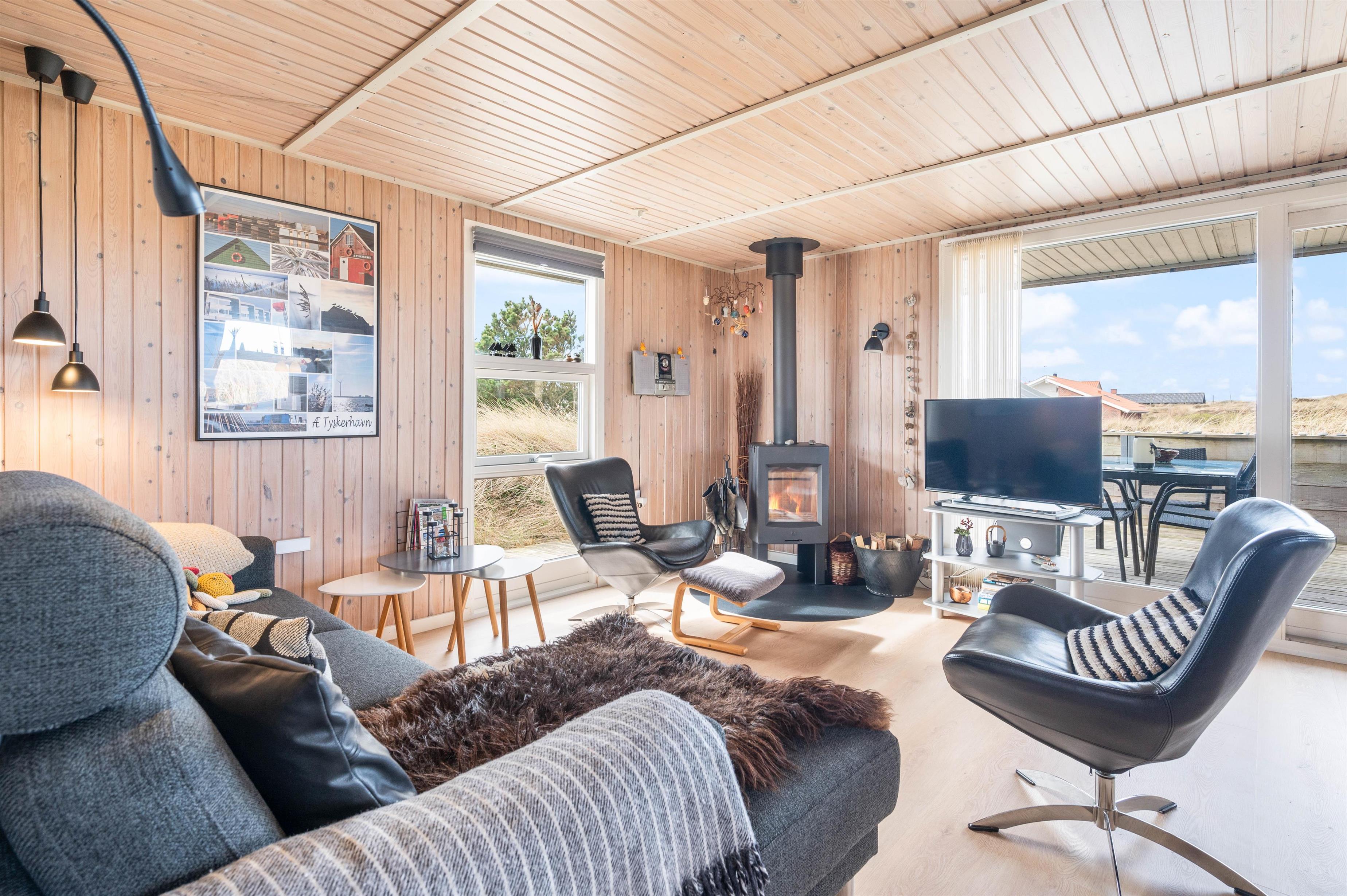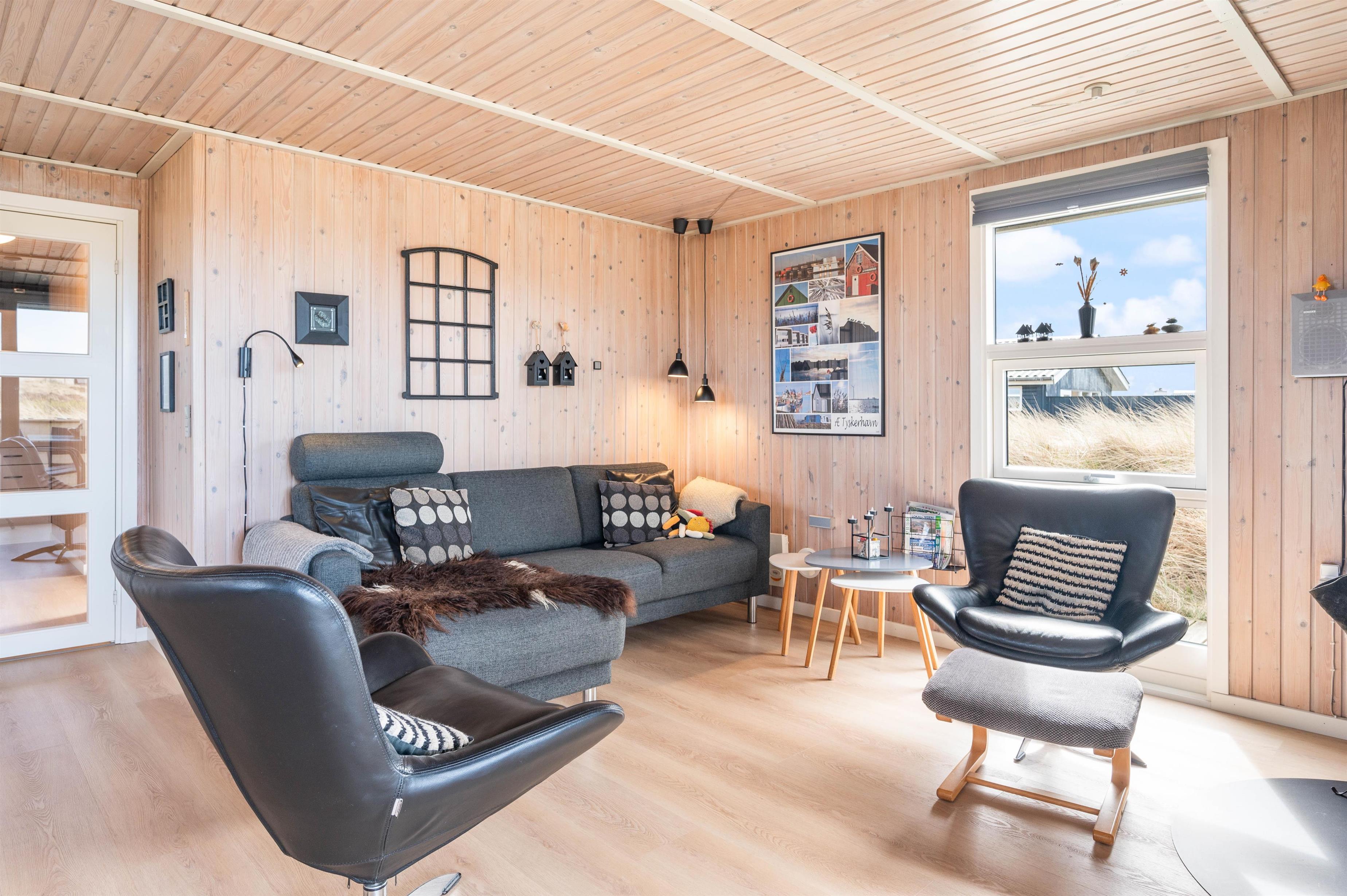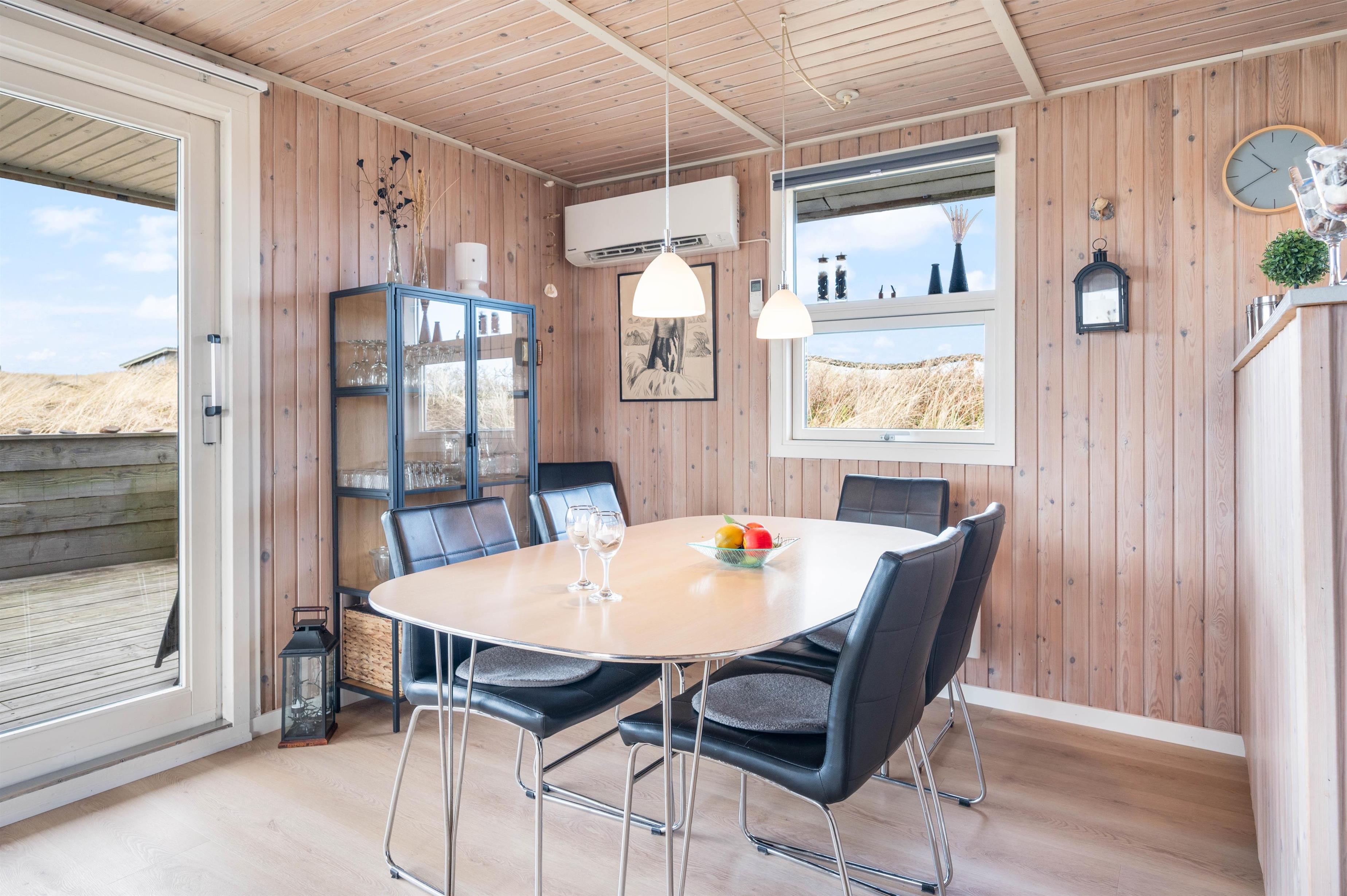 Der er terrasse mod øst, mod syd og mod vest, hvilket giver mulighed for at opholde jer udenfor det meste af dagen. Den delvist overdækkede terrasse mod vest er ideel til hyggelige grillaftener. Herfra er der skøn udsigt, der indbyder til en dejlig gåtur igennem klitlandskabet til strand og hav.