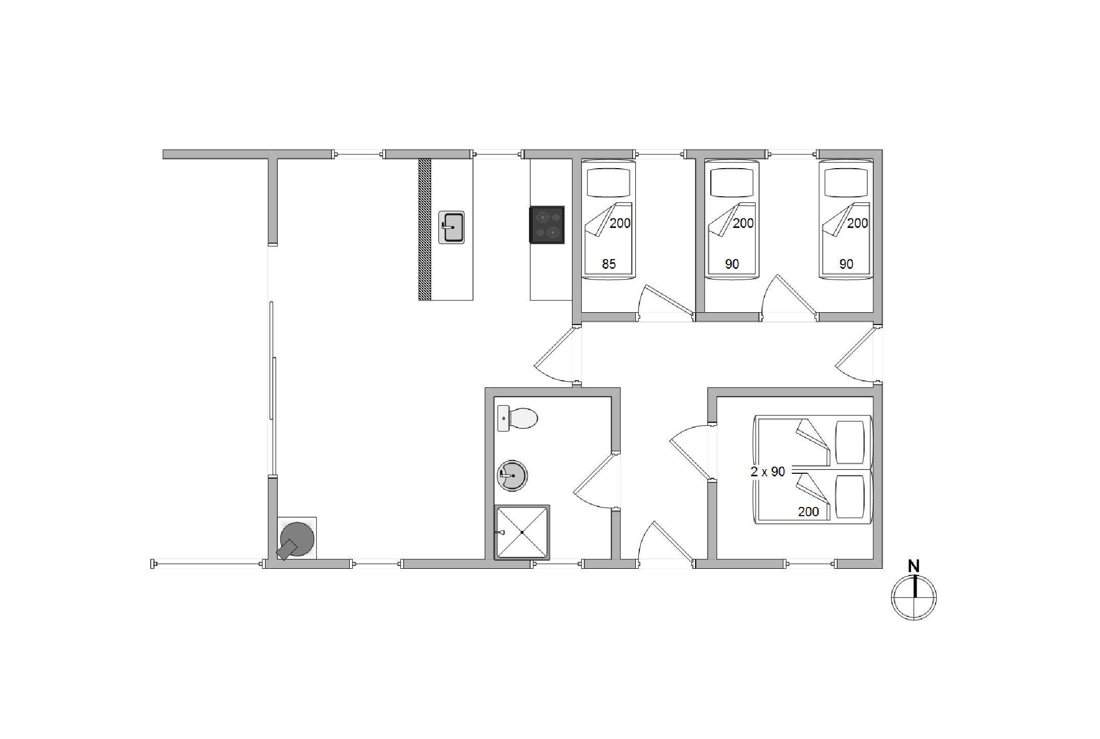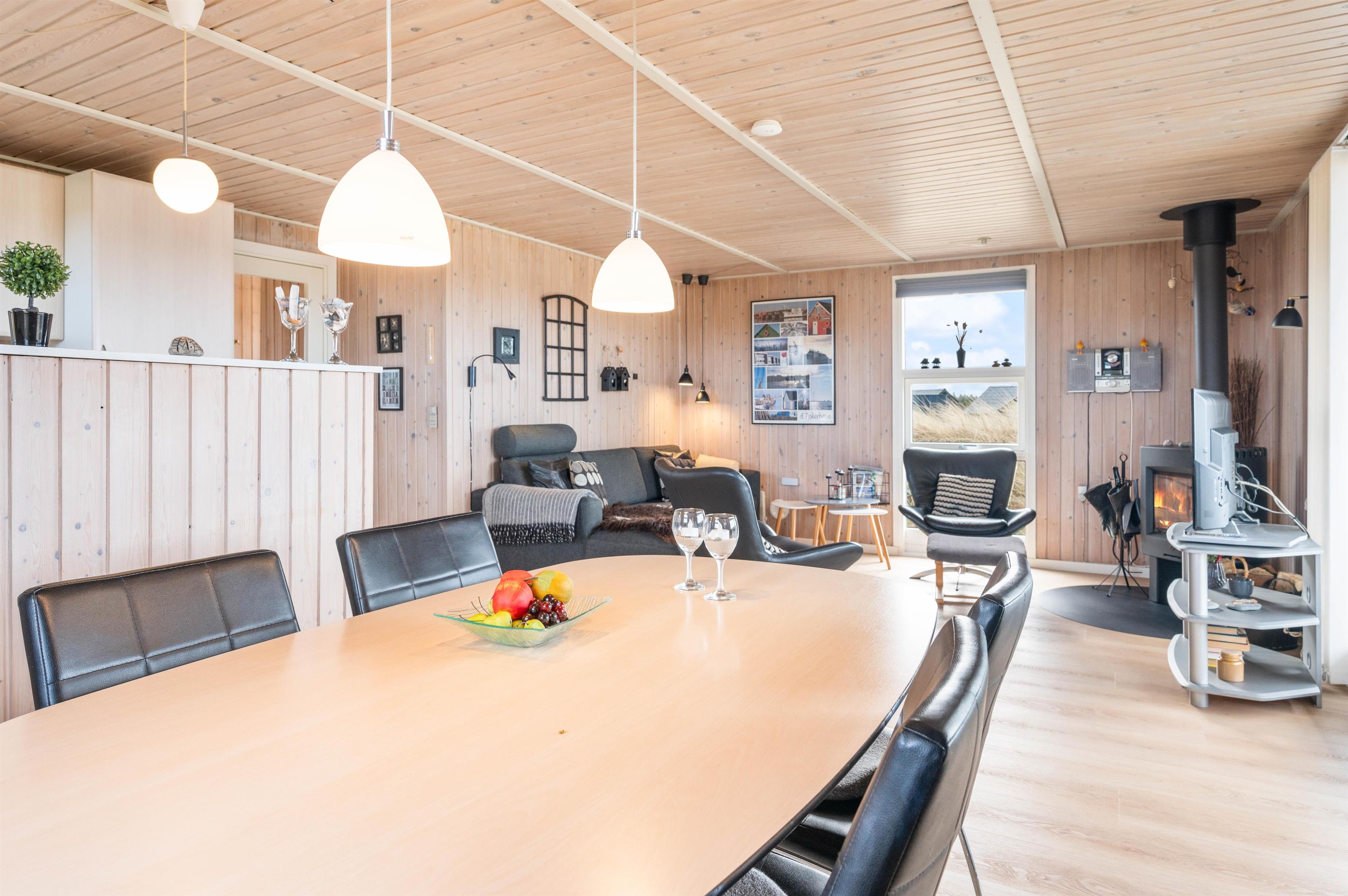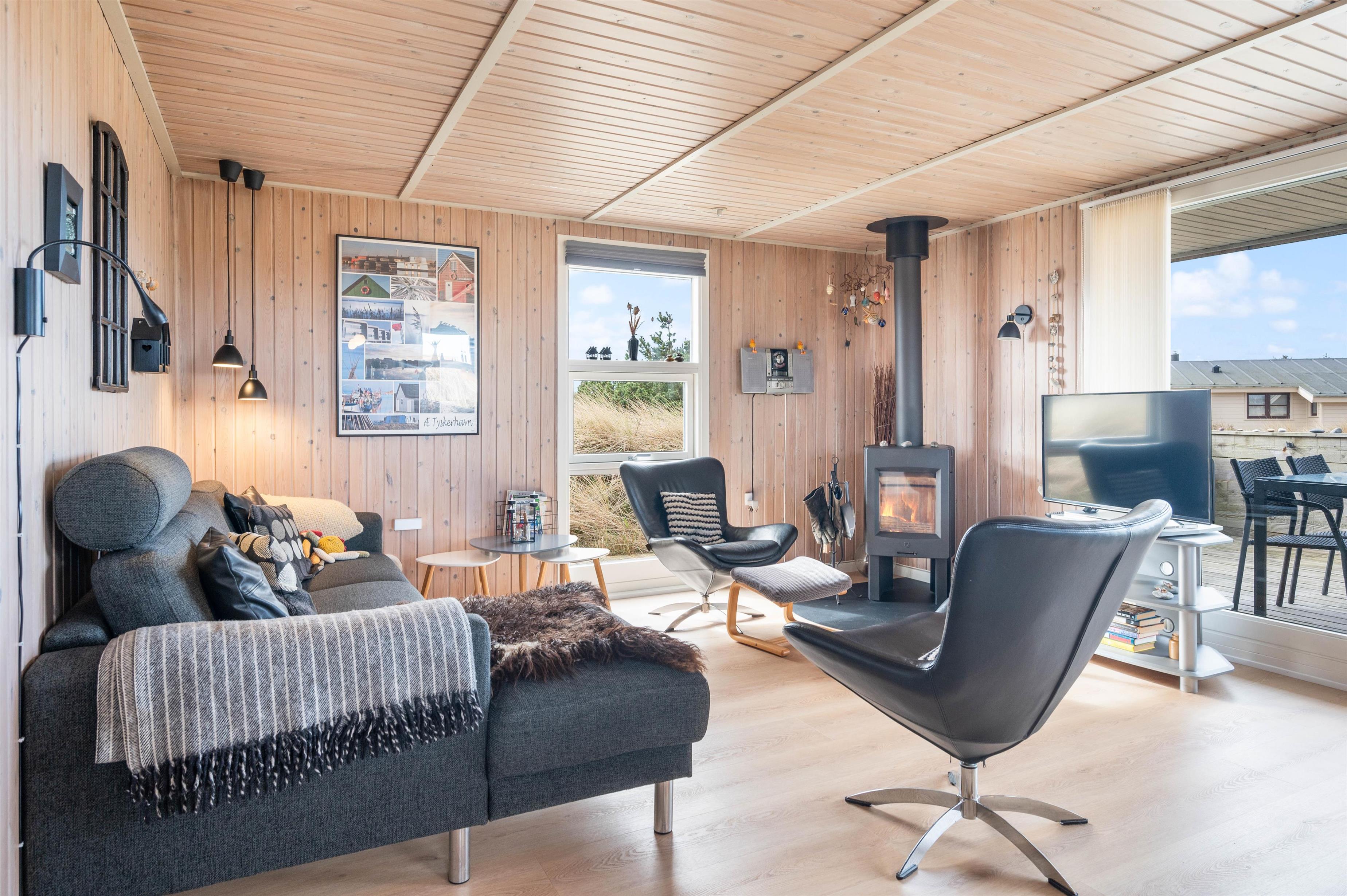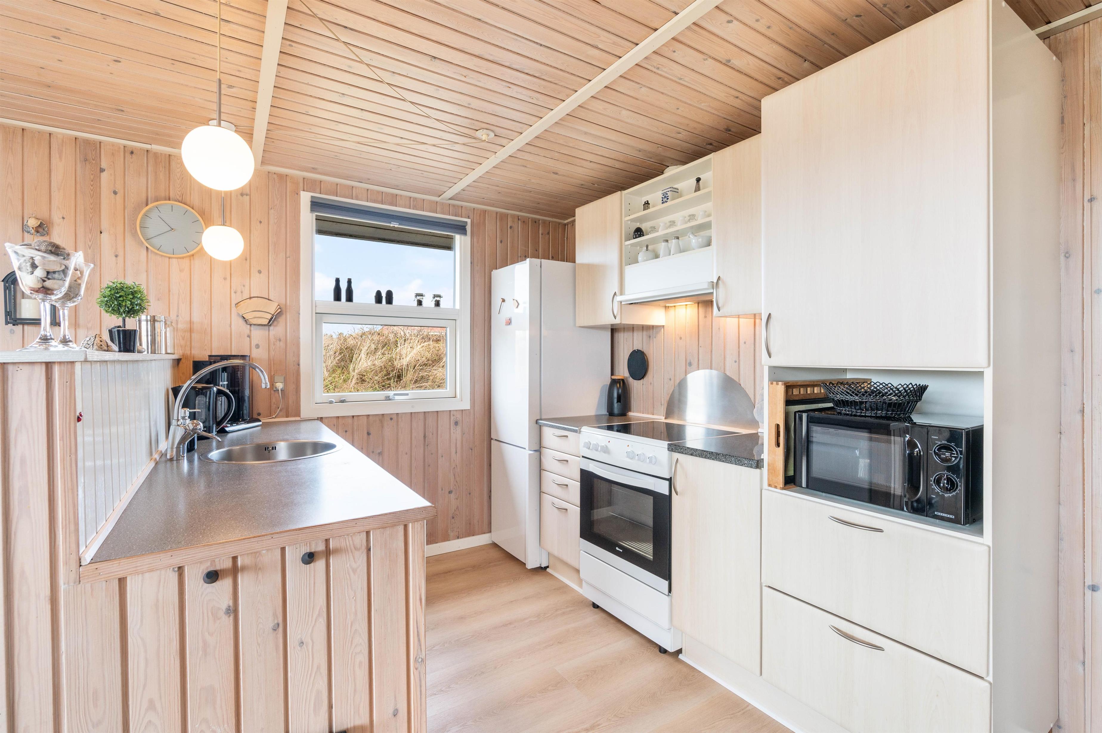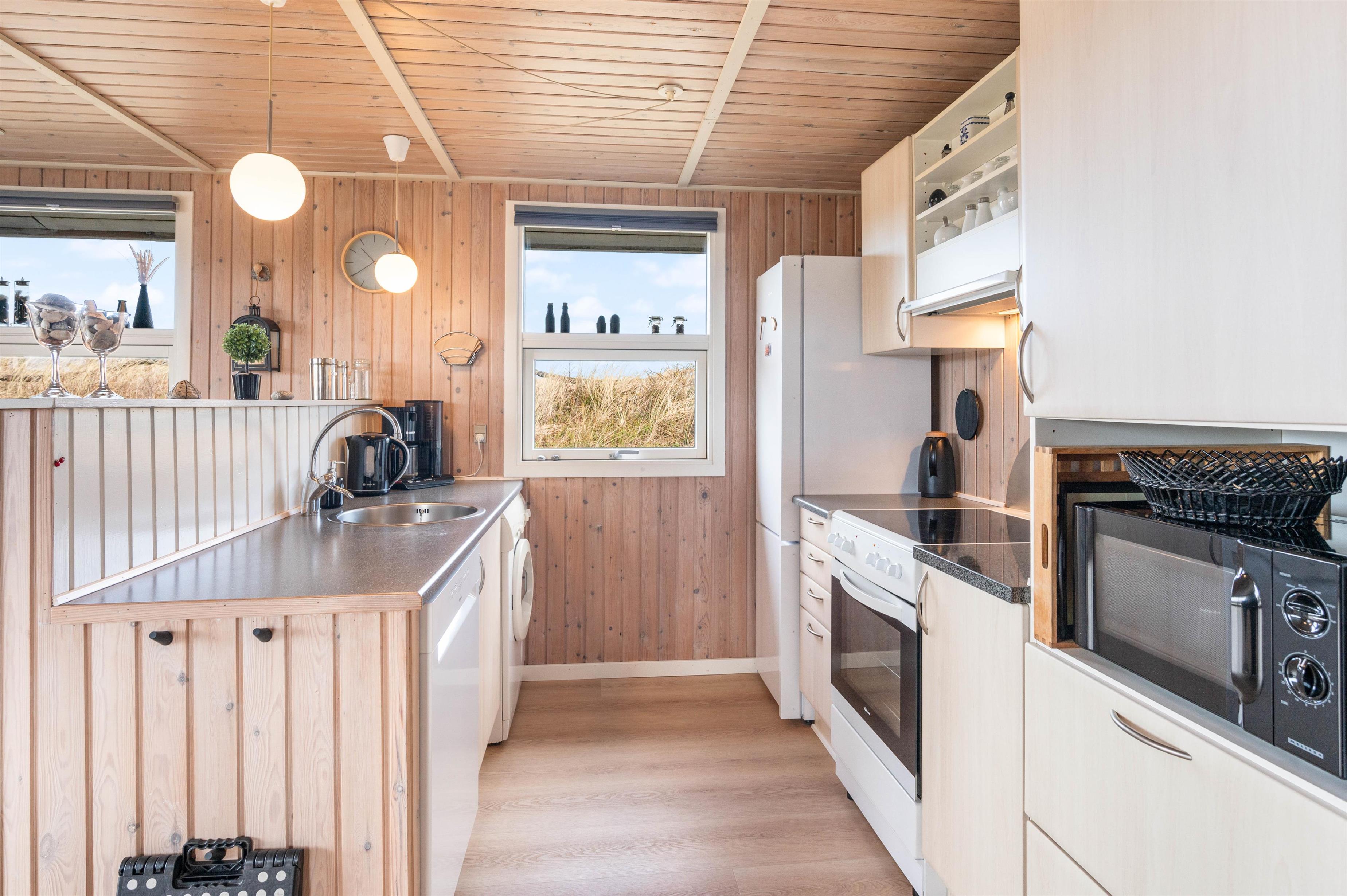 Køkkenet, der står i åben forbindelse med stuen, er veludstyret med opvaskemaskine, mikroovn og en fryser på 40 L. I den hyggelige stue finder du brændeovn, fladskærm og DVD. Der er gratis trådløst internet i sommerhuset, så I kan opdaterer familie og venner derhjemme.