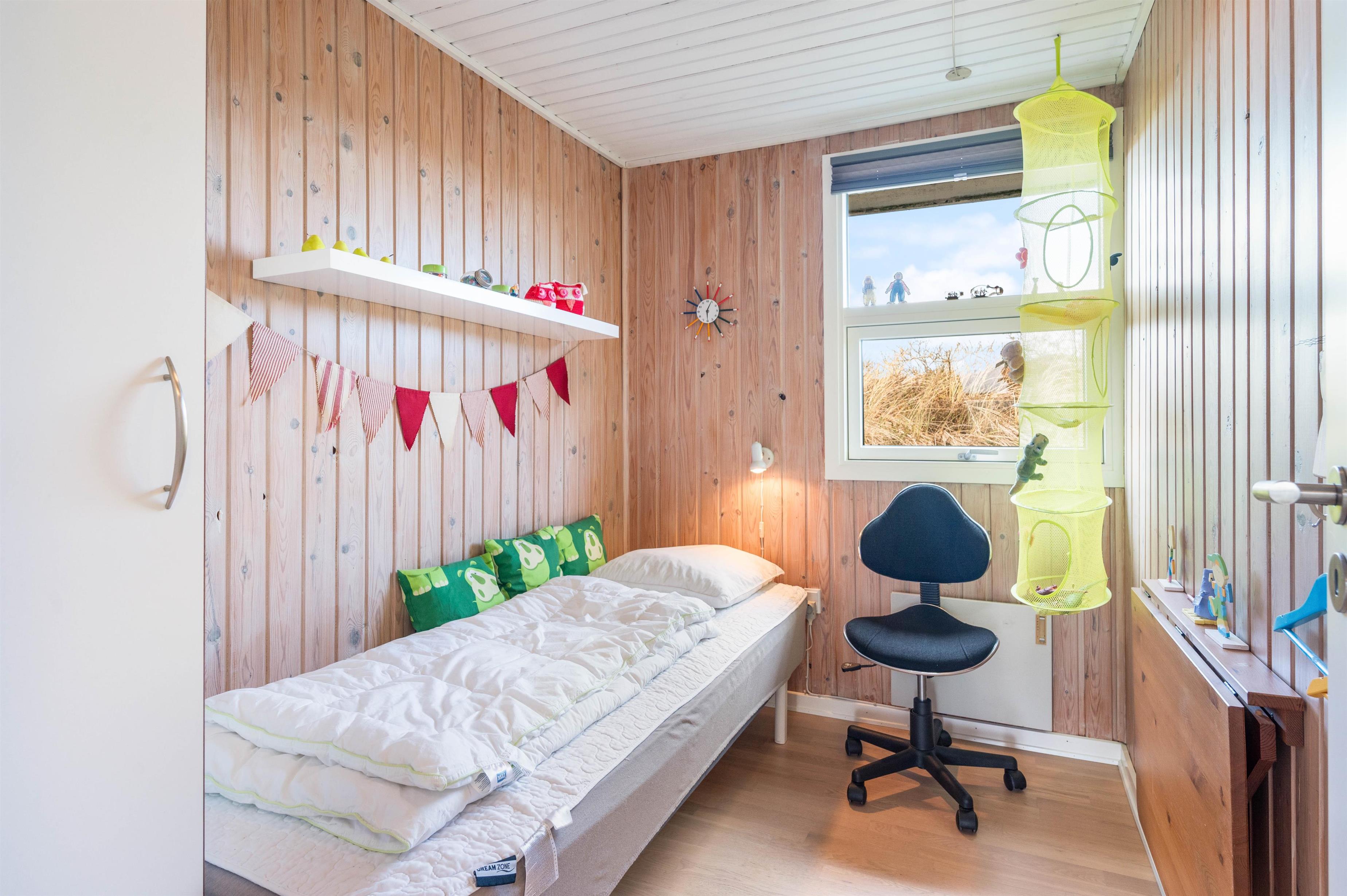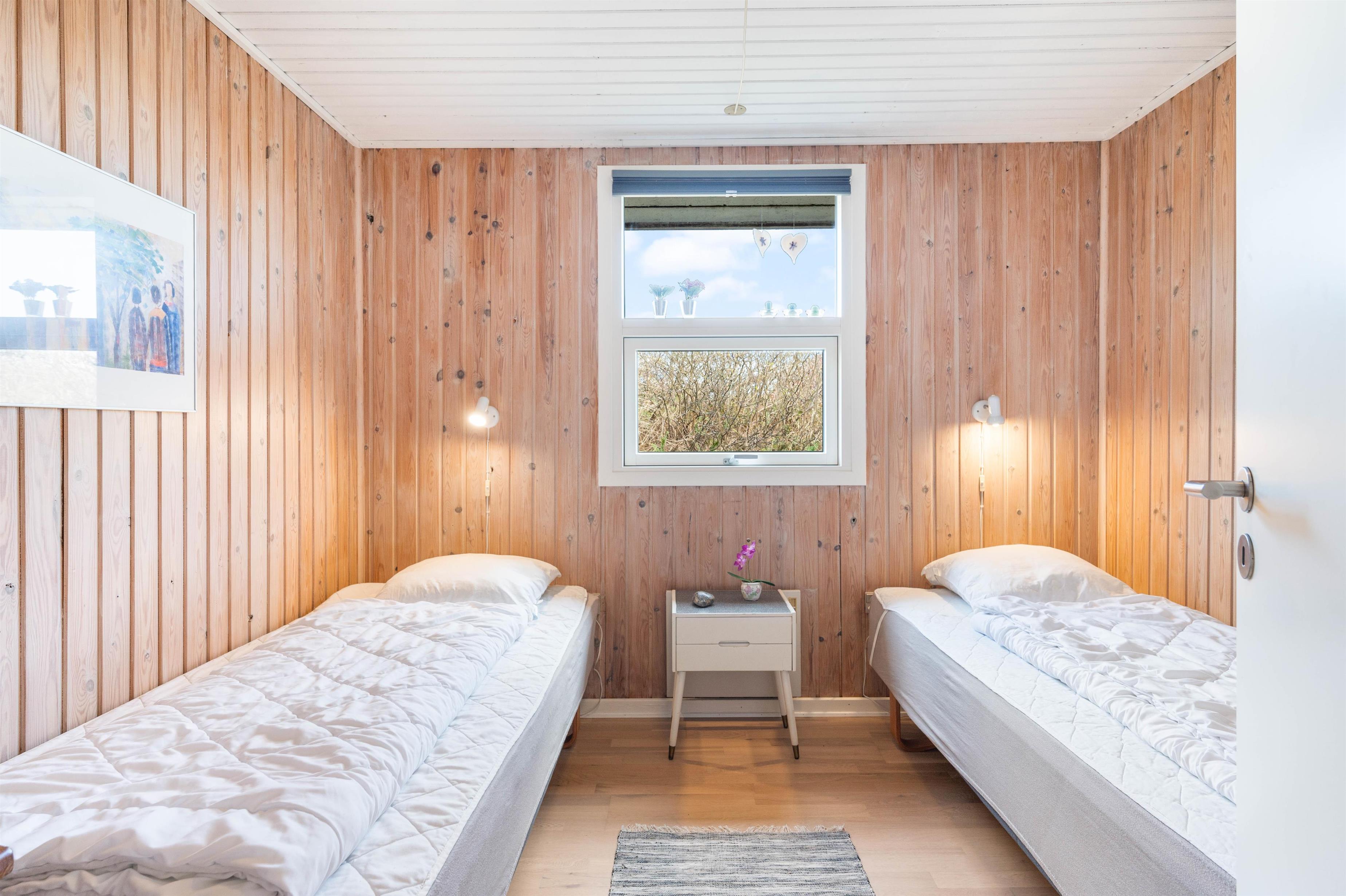 Her kan I holde ferie i et skønt beliggende sommerhus på en stor naturgrund. Sommerhuset er løbende blevet renoveret, og er dermed godt velholdt. Det er lyst og venligt indrettet med lyse trægulve over alt i stue og værelse. Der er 3 soveværelser, et med dobbeltseng, et med 2 enkelt senge og det sidste 1 enkelt seng. Alle værelser er hyggelige og har lyse trævægge og hvidmalede trælofter.